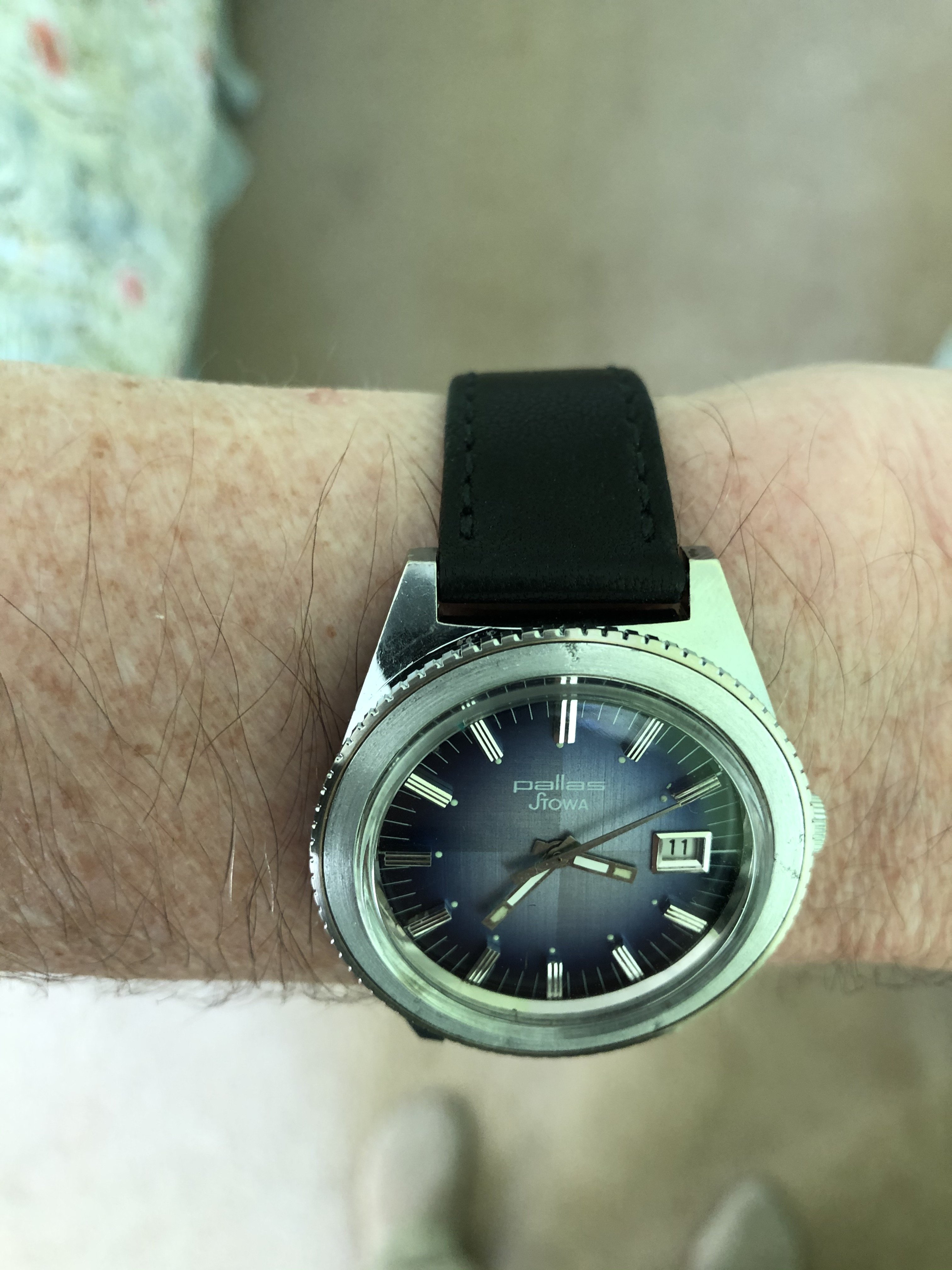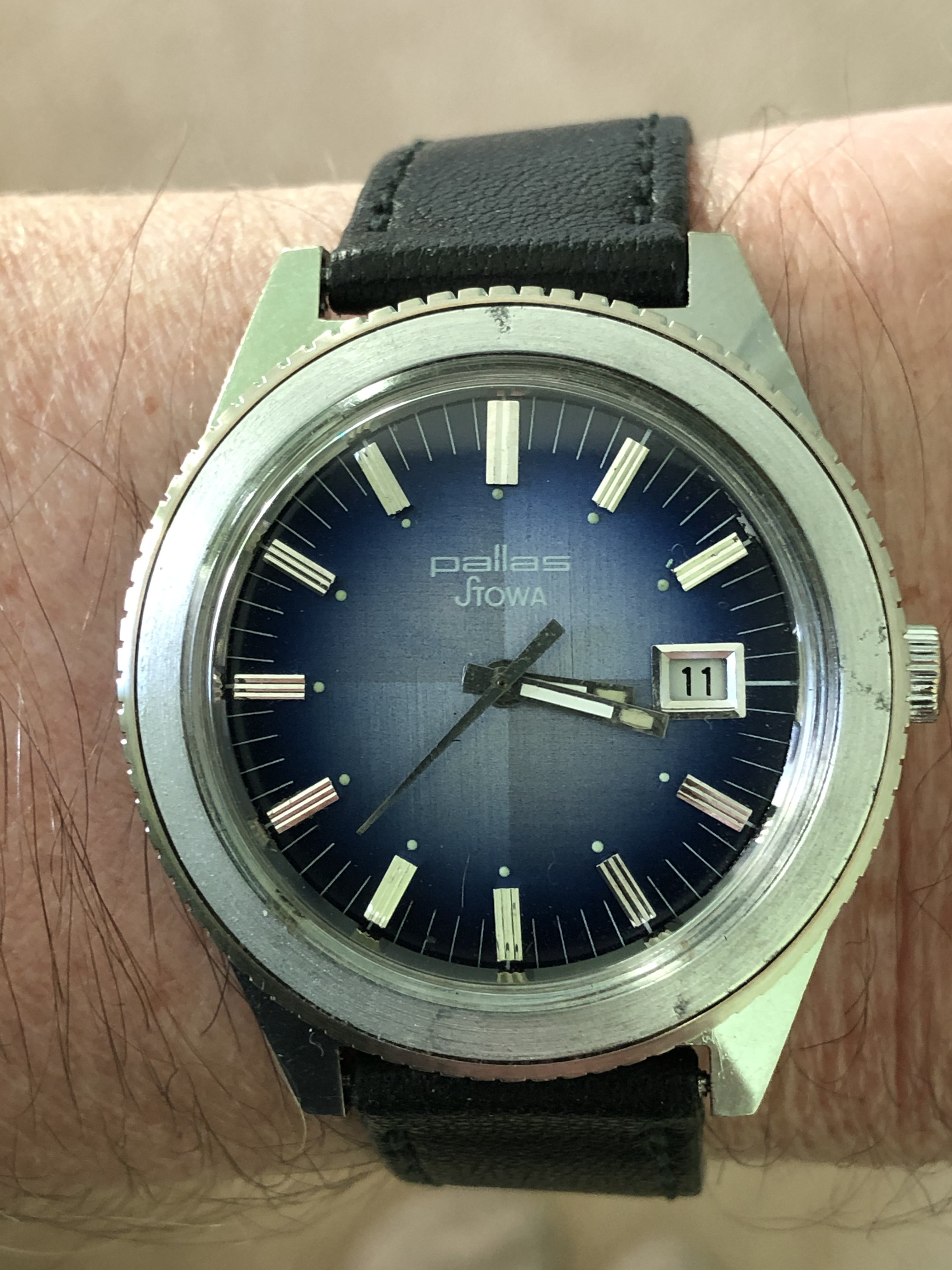 Posts 542 Likes 2,096 dougwhiz ·Aug 12, 2022 A Pallas/Stowa with quartered dial and brushing that makes it go between dark gray, to brilliant blue to a glowing white center.
