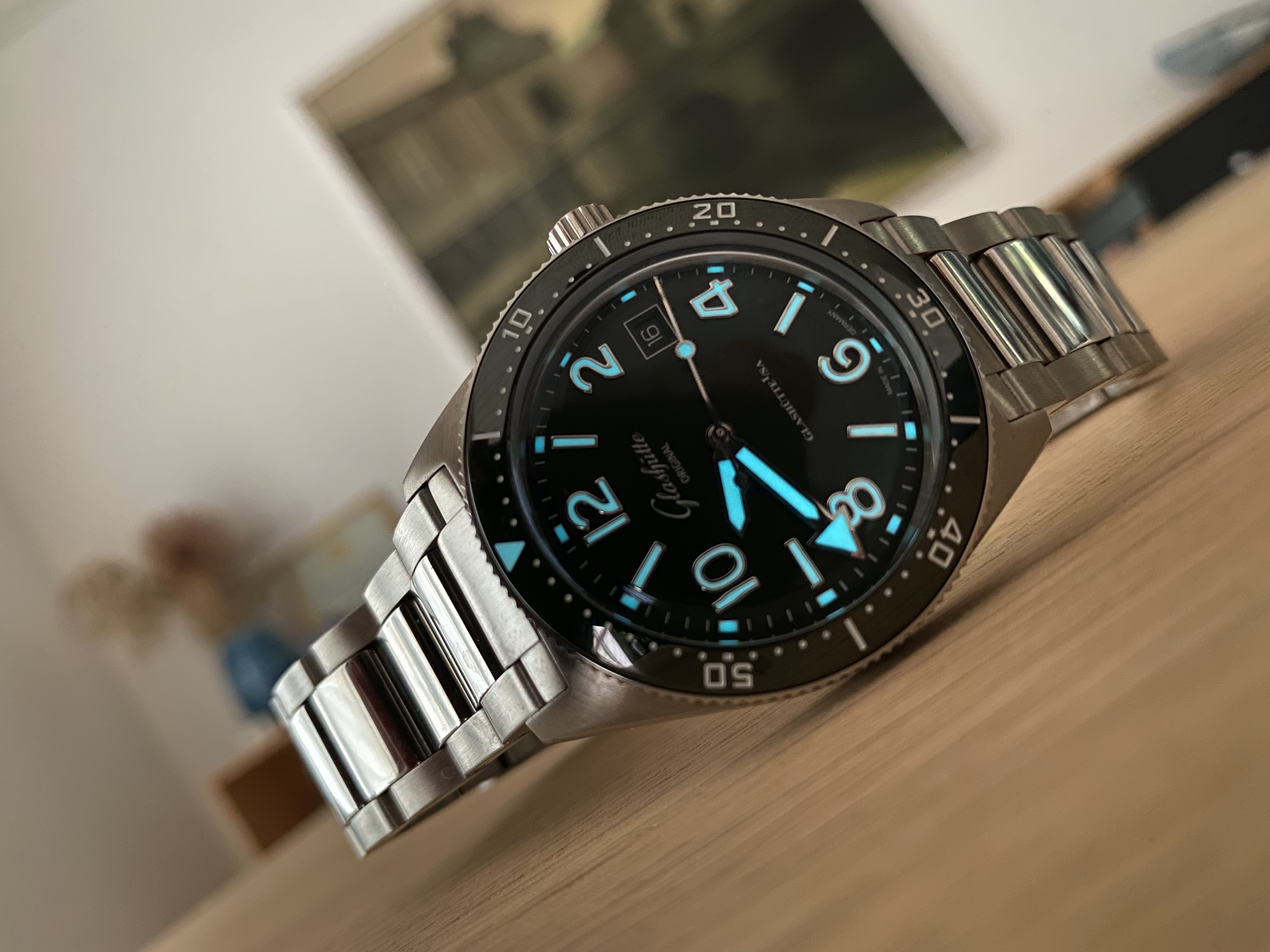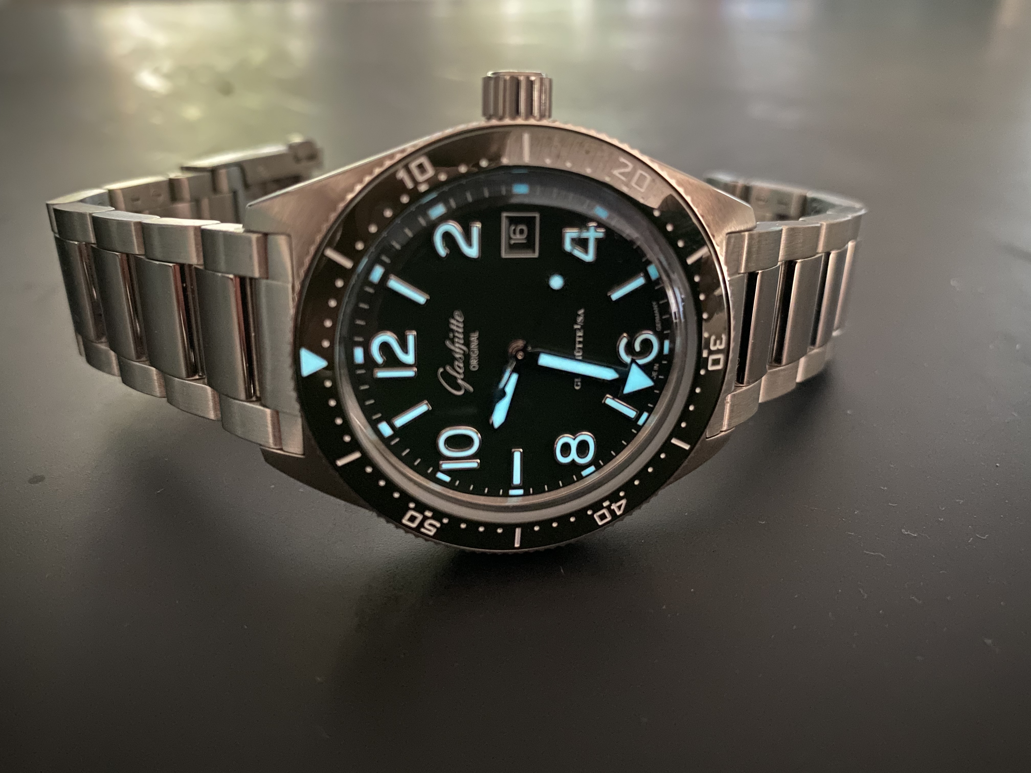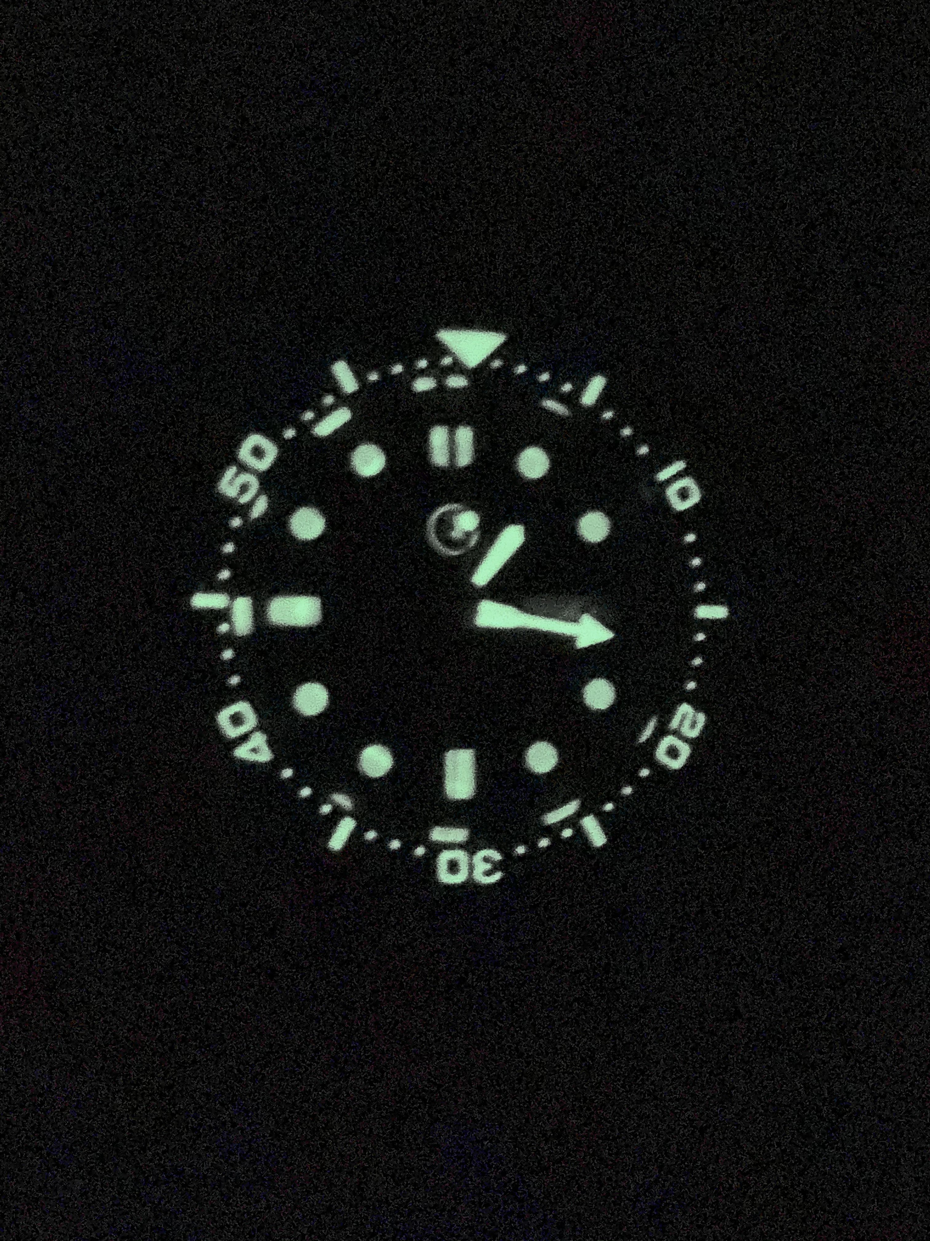 While the Speedmaster is a legible watch, after dark the Seamaster outclasses it by a mile - this is even more obvious on the wrist than it is in that photo. The Seiko punches way above its price class - it costs an order of magnitude less than either of the Omegas and shines brighter than either. The Lum-Tec isn't as bright as some of the others, but its markings are so clear that it's the easiest to precisely read in the dark.