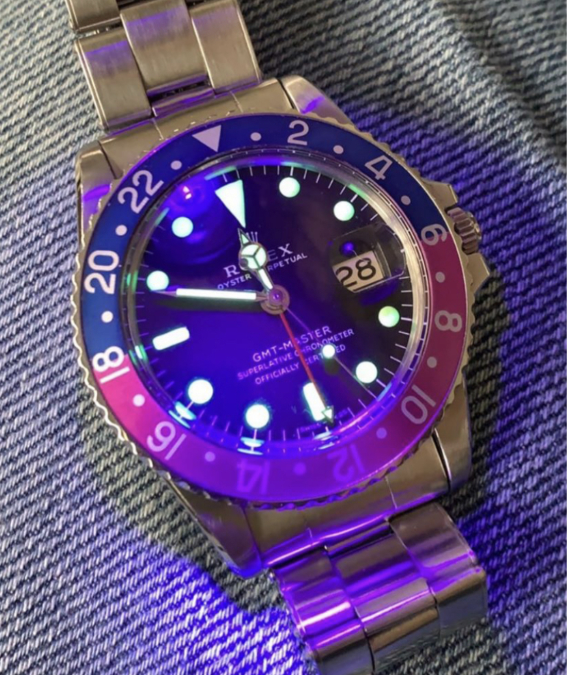 I got this tickle when I was shining a UV light on some of my watches, along with taking some macro shots with an Olympus Tough Guard 6, set on aperture priority and an exposure time of maybe a second (based on the seconds hand on the watches that were running). Here's the setup (the light at the left is a soft UV light similar in function to a hippy light):