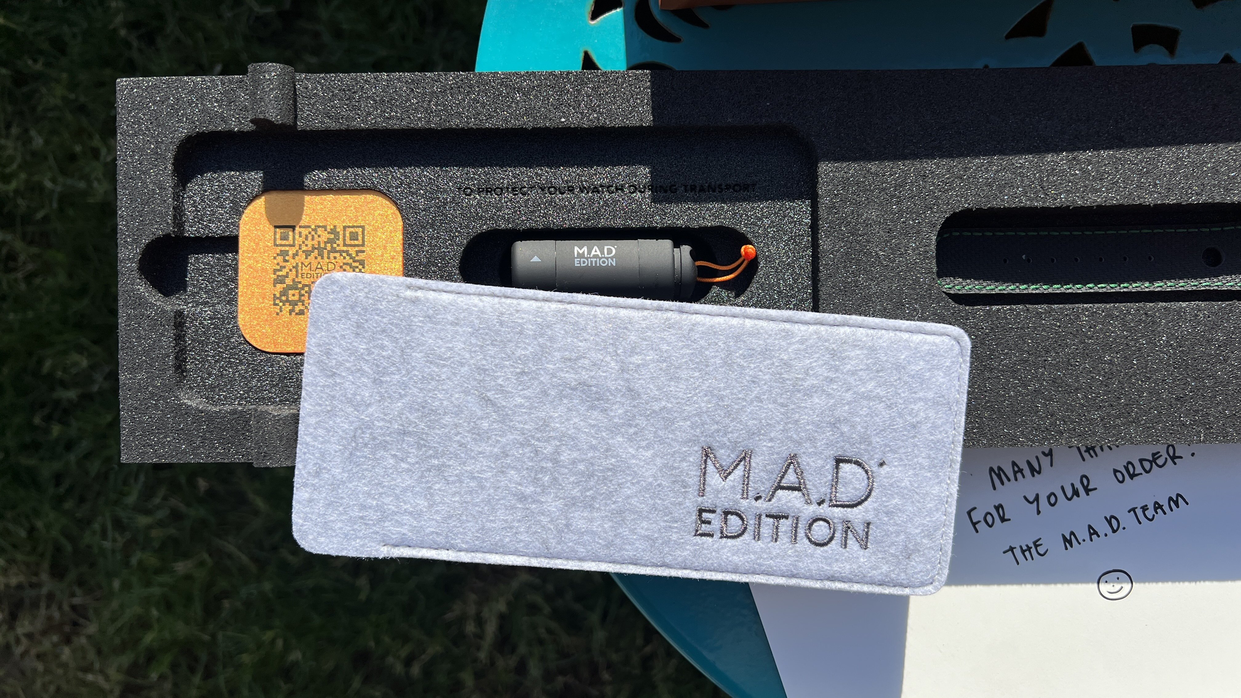 Inner & out boxes, fully stickered, felt sleeve, lume torch, booklet, and sticker pack.