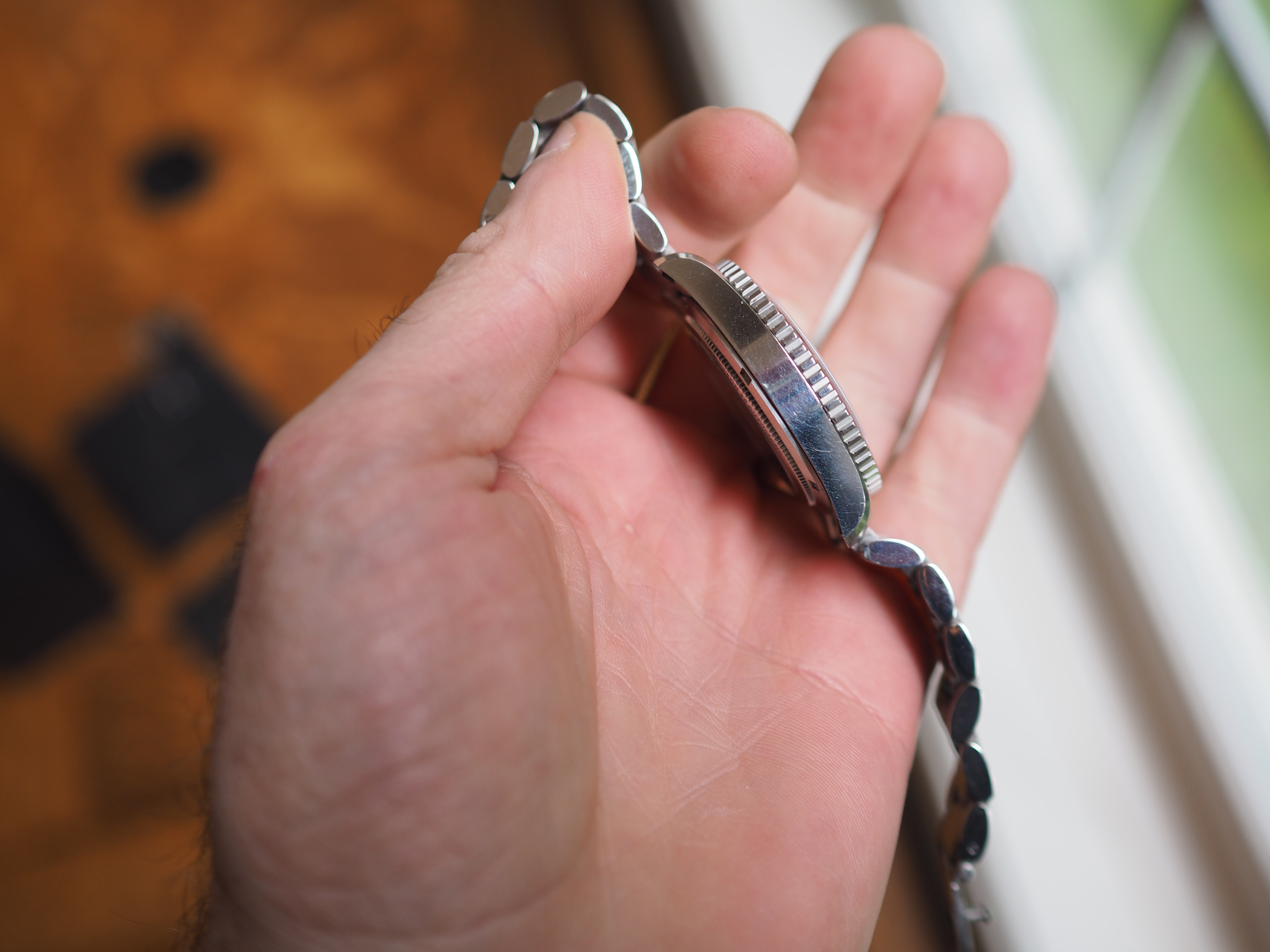The watch is in good condition. There are a few scratches on the backs of the lugs from strap changes, but other than that only minor scratches from careful wear (see photos). There was an issue this last year and I had to send it back to the factory for a warranty claim. They swapped out the movement for a new one, and now it has the Rhonda R-150 movement used current models not the STP movement it shipped with.
