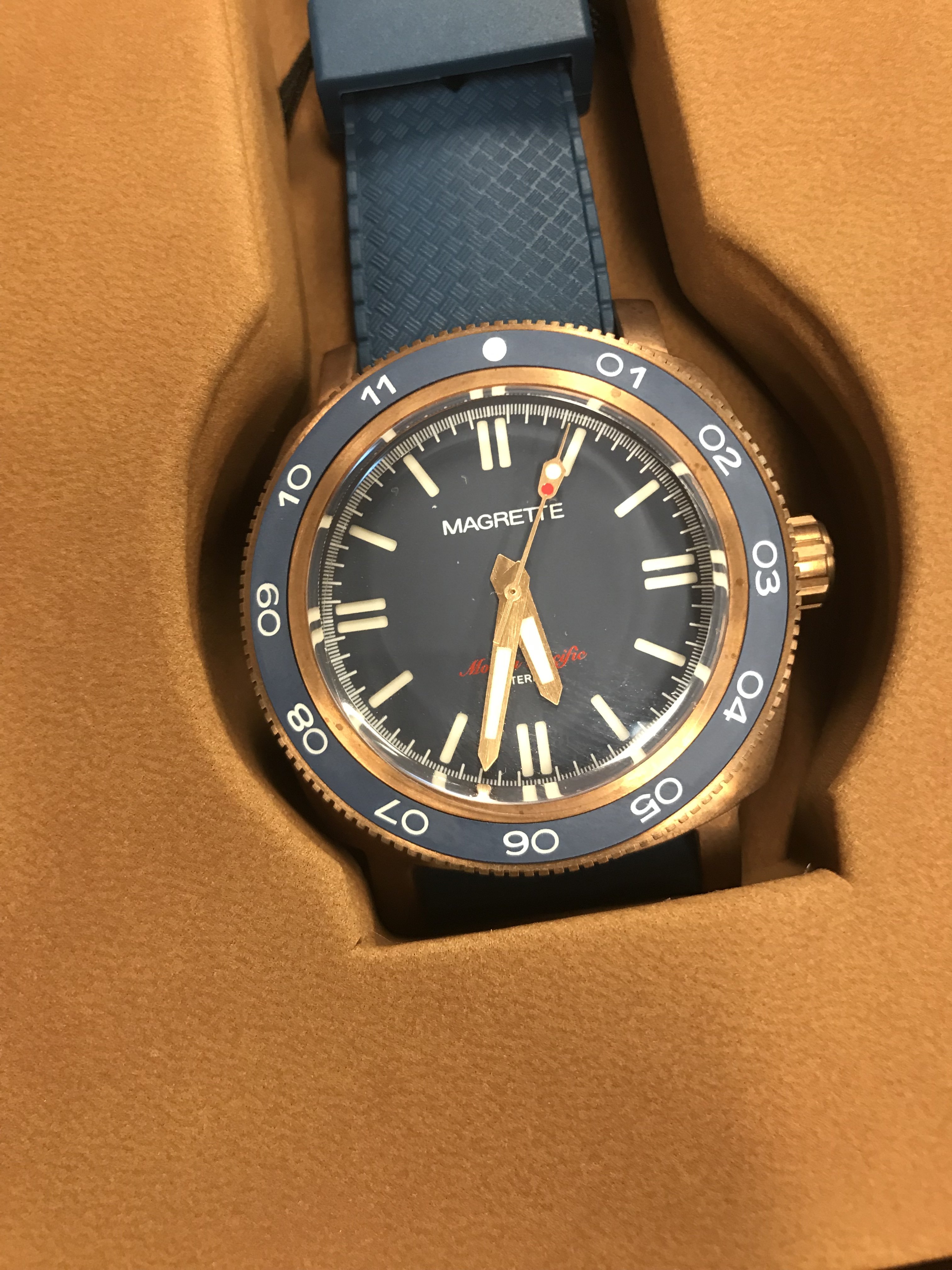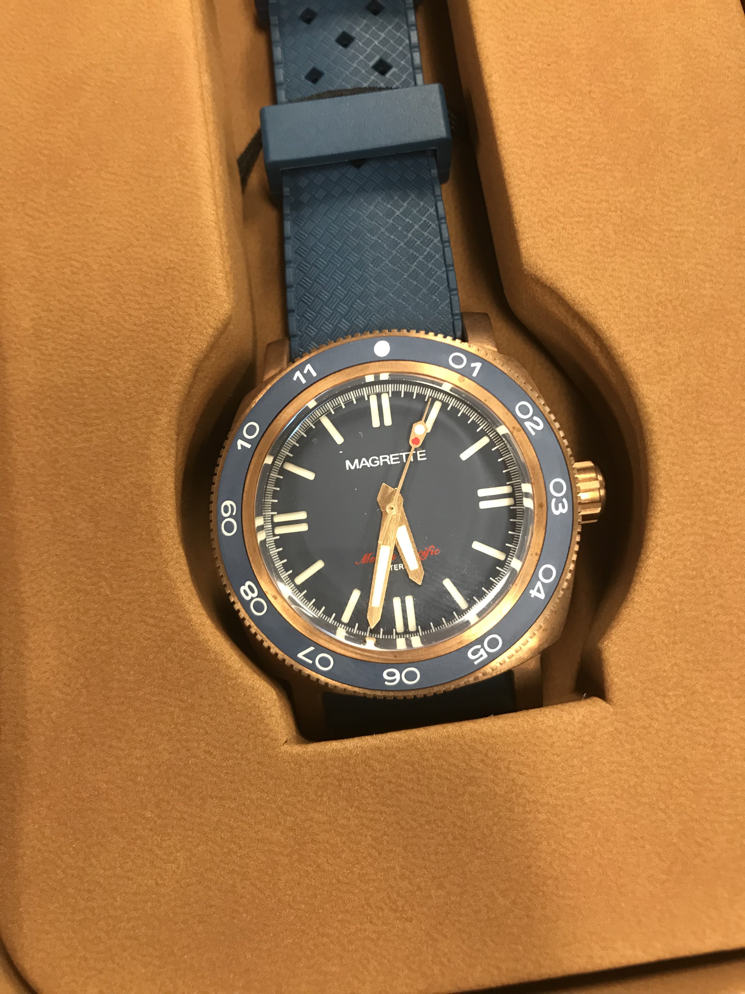 The consolidation continues. Up for sale is a Magrette Waterman Pacific in bronze with a lovely blue dial and bezel. This watch is still in the box with all plastic still on and I’ve never worn it. Time to move it on to someone who will.