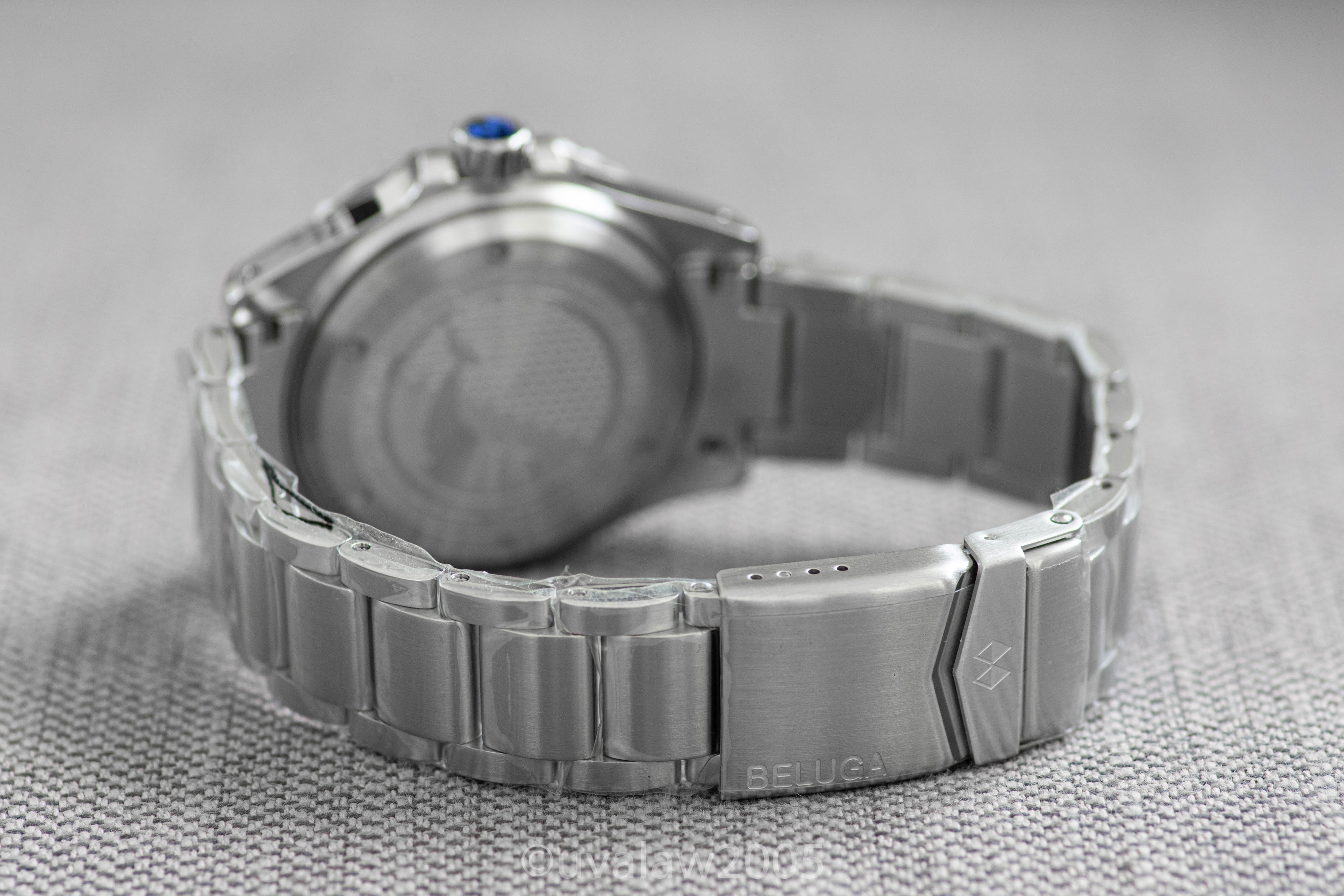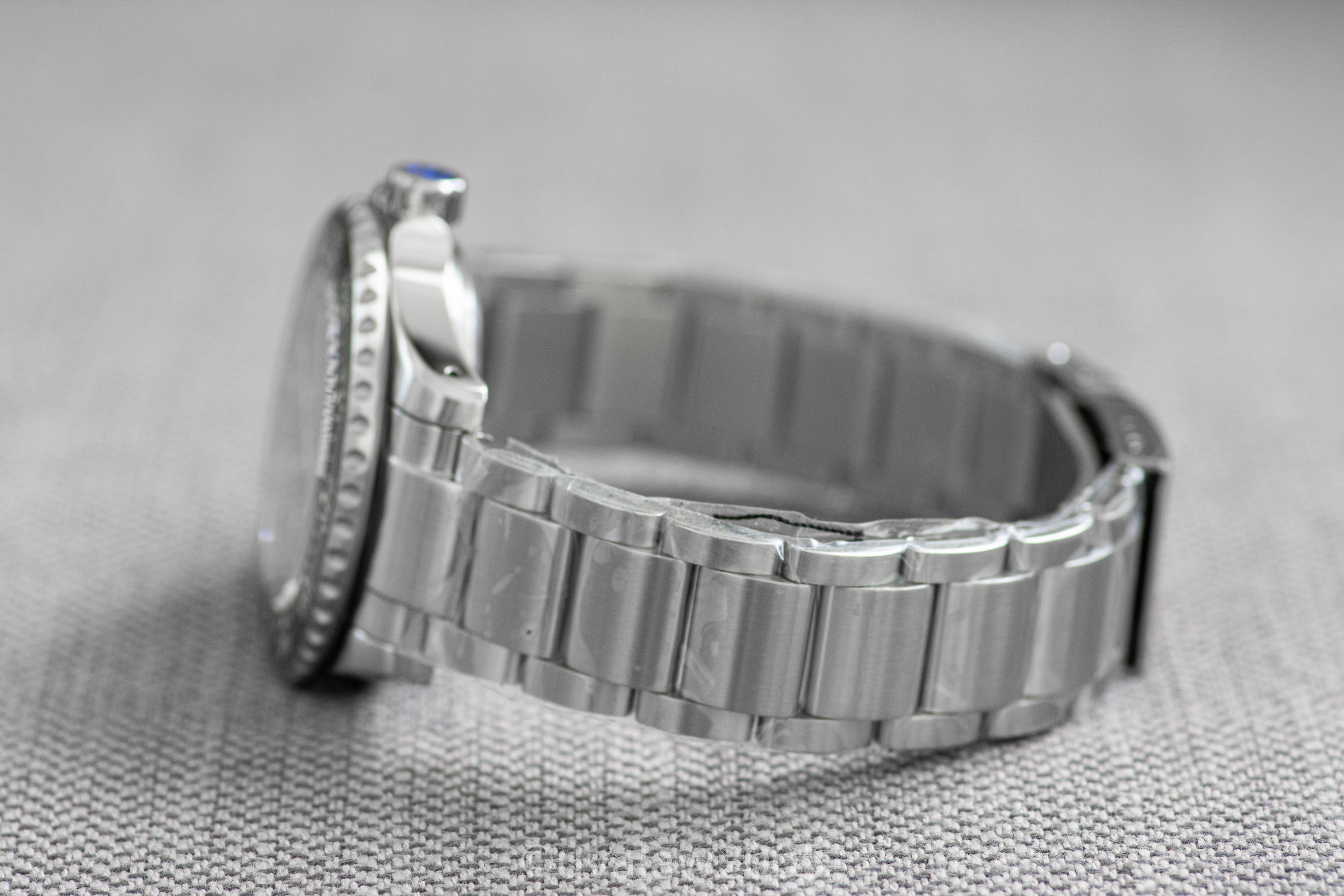 - Raised and beveled sapphire crystal with inner anti-reflective coating