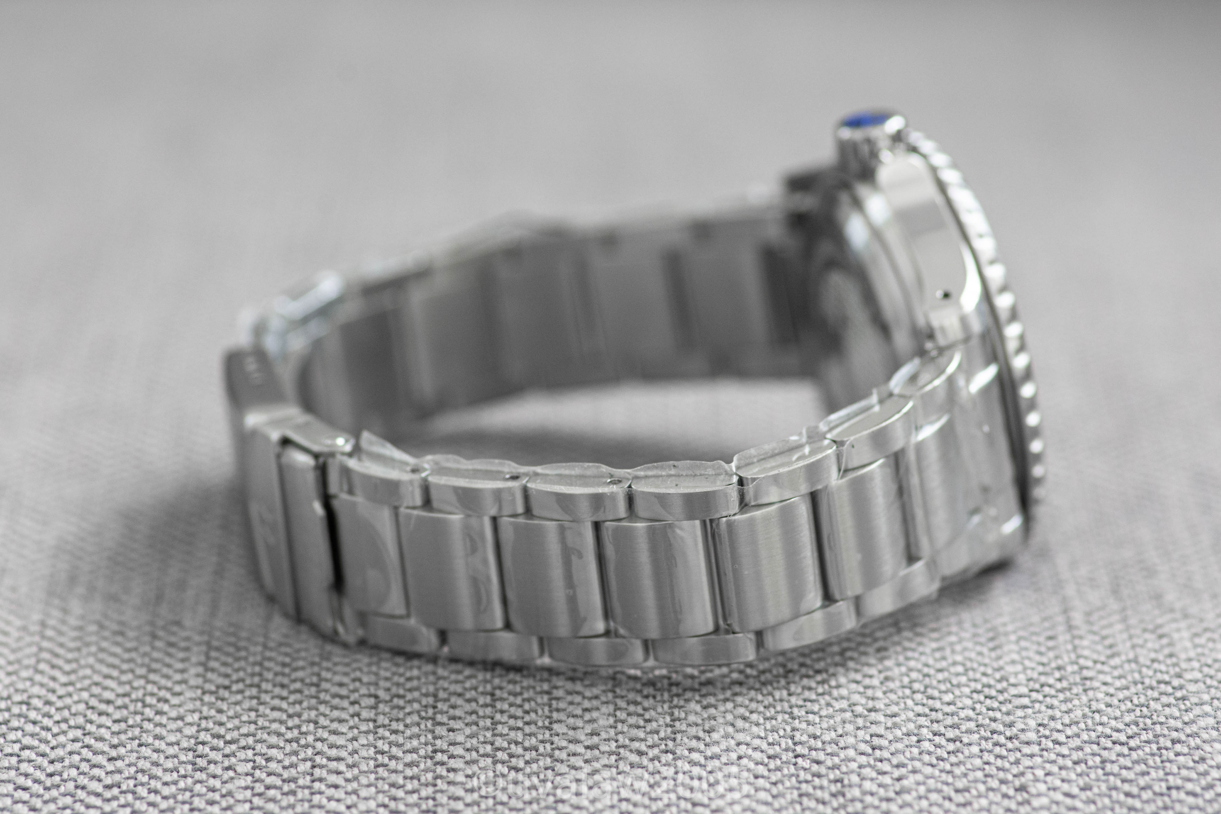 - Custom made solid, brushed finish 316L stainless steel strap with screw bar link adjustments, machined solid endlinks and stainless steel clasp with solid bridges