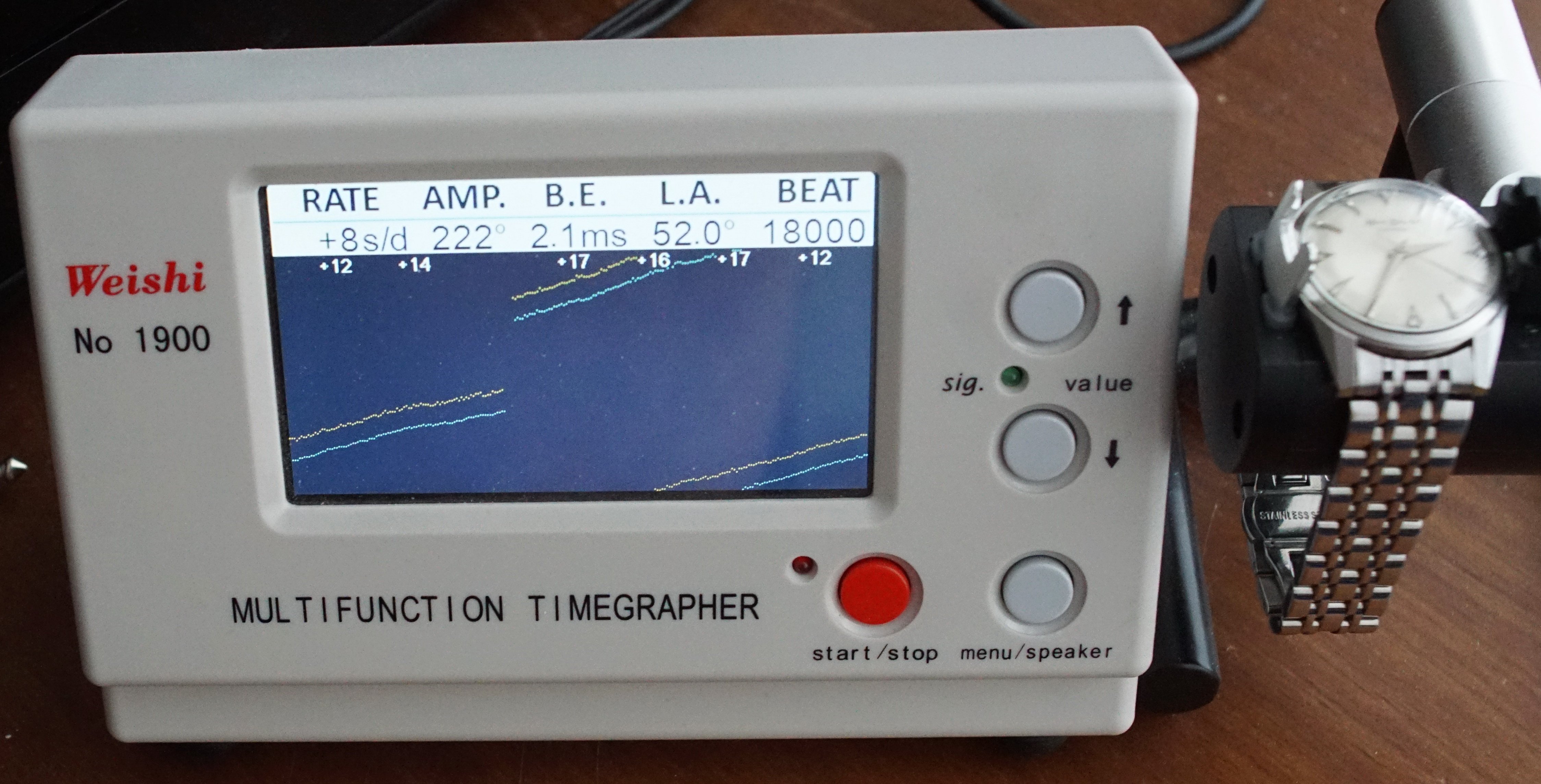 Timegrapher 1900 readings in dial up position: +8-17 seconds a day; 222 degrees of amplitude; 2.1 milliseconds of beat error; 52 degrees lift angle