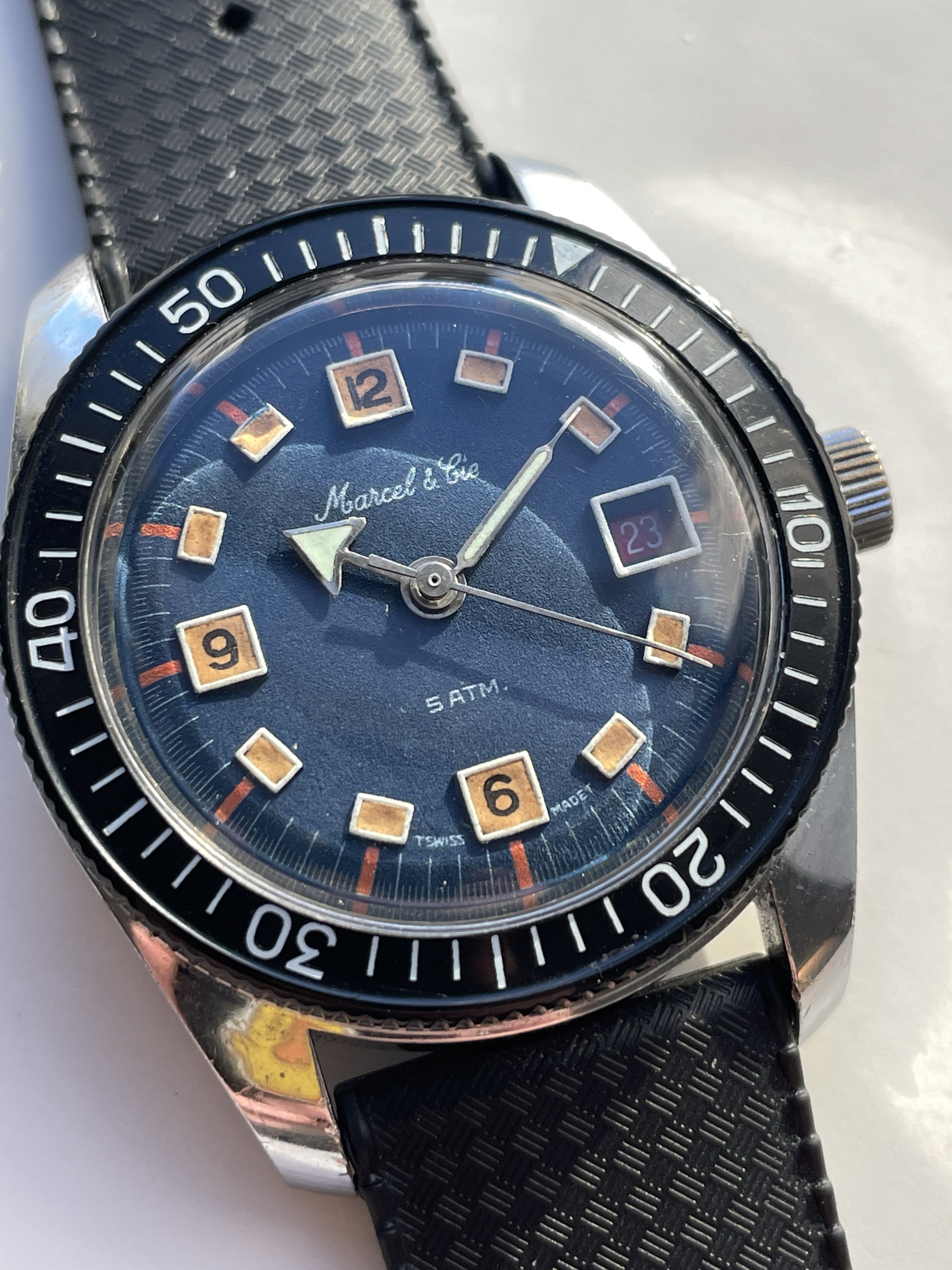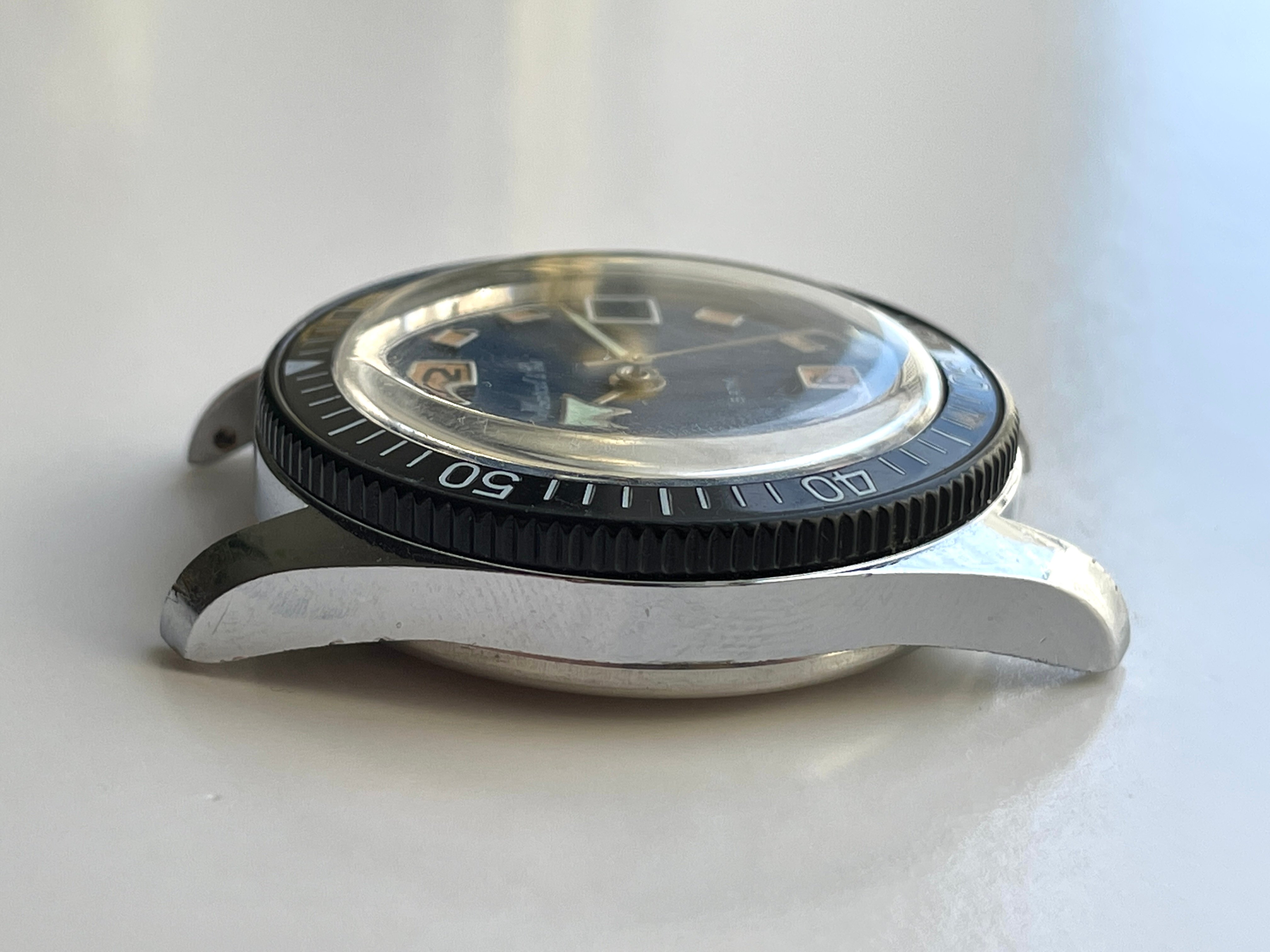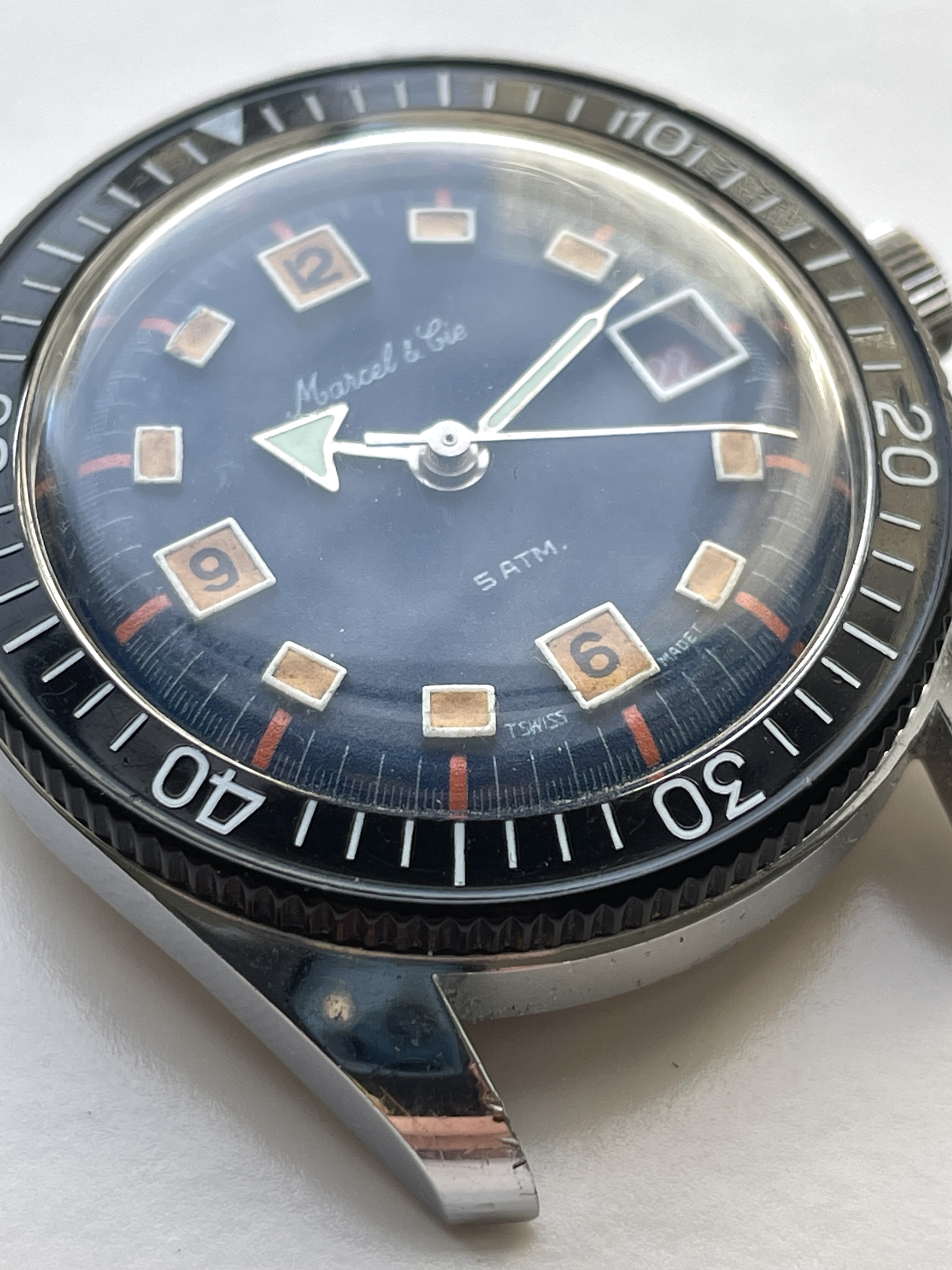 This is what we could call a good Frankenstein example. The stunning blue, tritium dial comes from a World Time GMT model from the same brand (as seen HERE), which was used to replace the standard dial that came on THIS Marcel & Cie skin diver. This offers the winning combo of awesome blue dial with much nicer skin diver case & bezel. The black tritium dial, which was original to the watch is also included in the sale (pictured below).