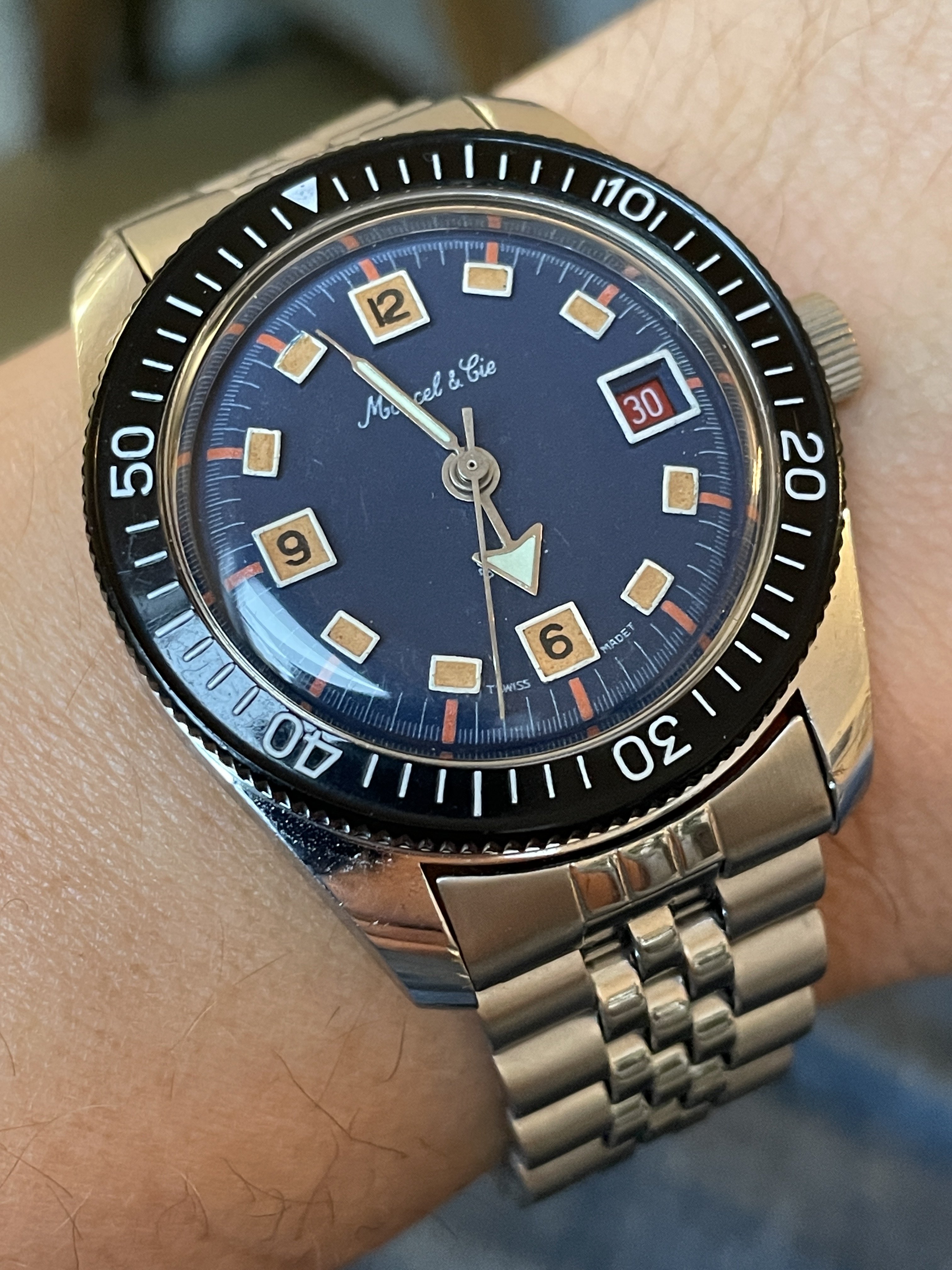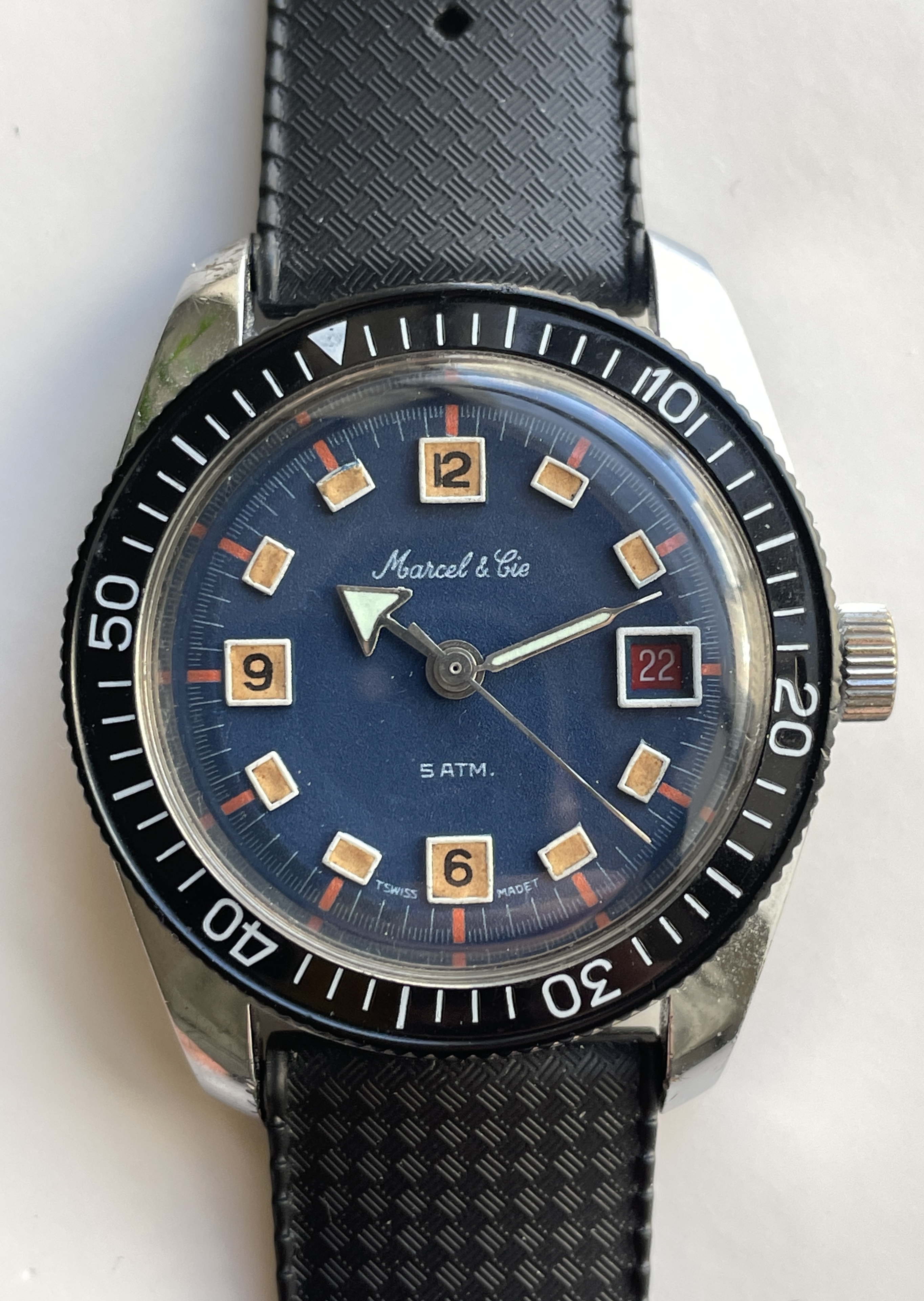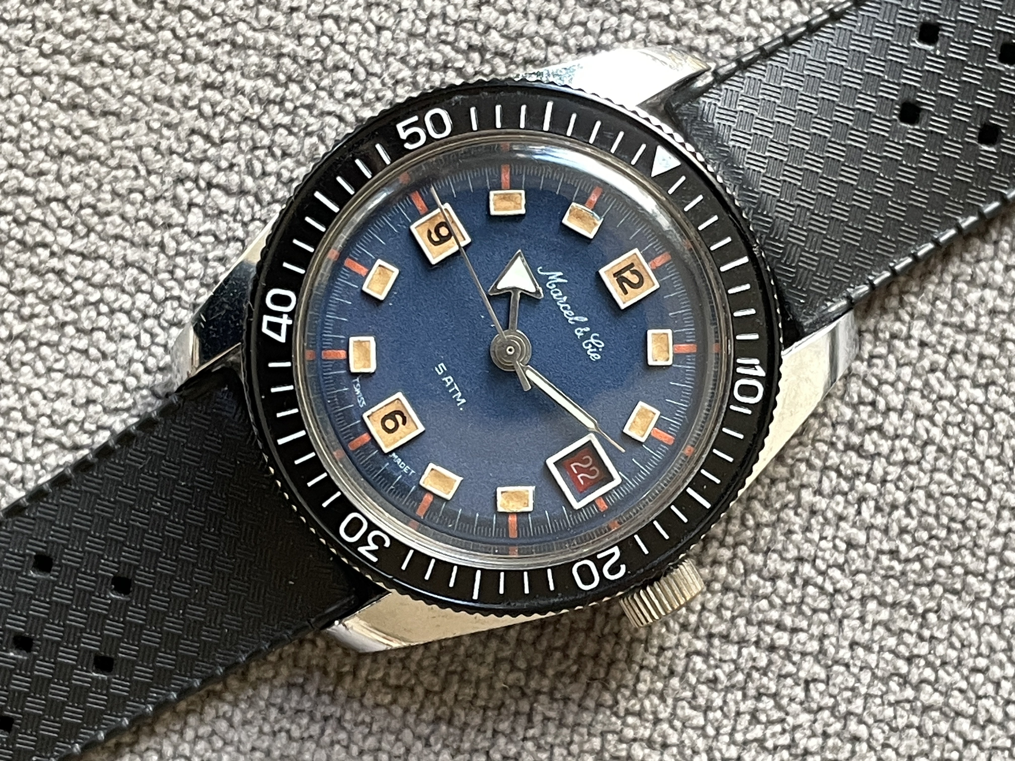 This is what we could call a good Frankenstein example. The stunning blue, tritium dial comes from a World Time GMT model from the same brand (as seen HERE), which was used to replace the standard dial that came on THIS Marcel & Cie skin diver. This offers the winning combo of awesome blue dial with much nicer skin diver case & bezel. The black tritium dial, which was original to the watch is also included in the sale (pictured below).