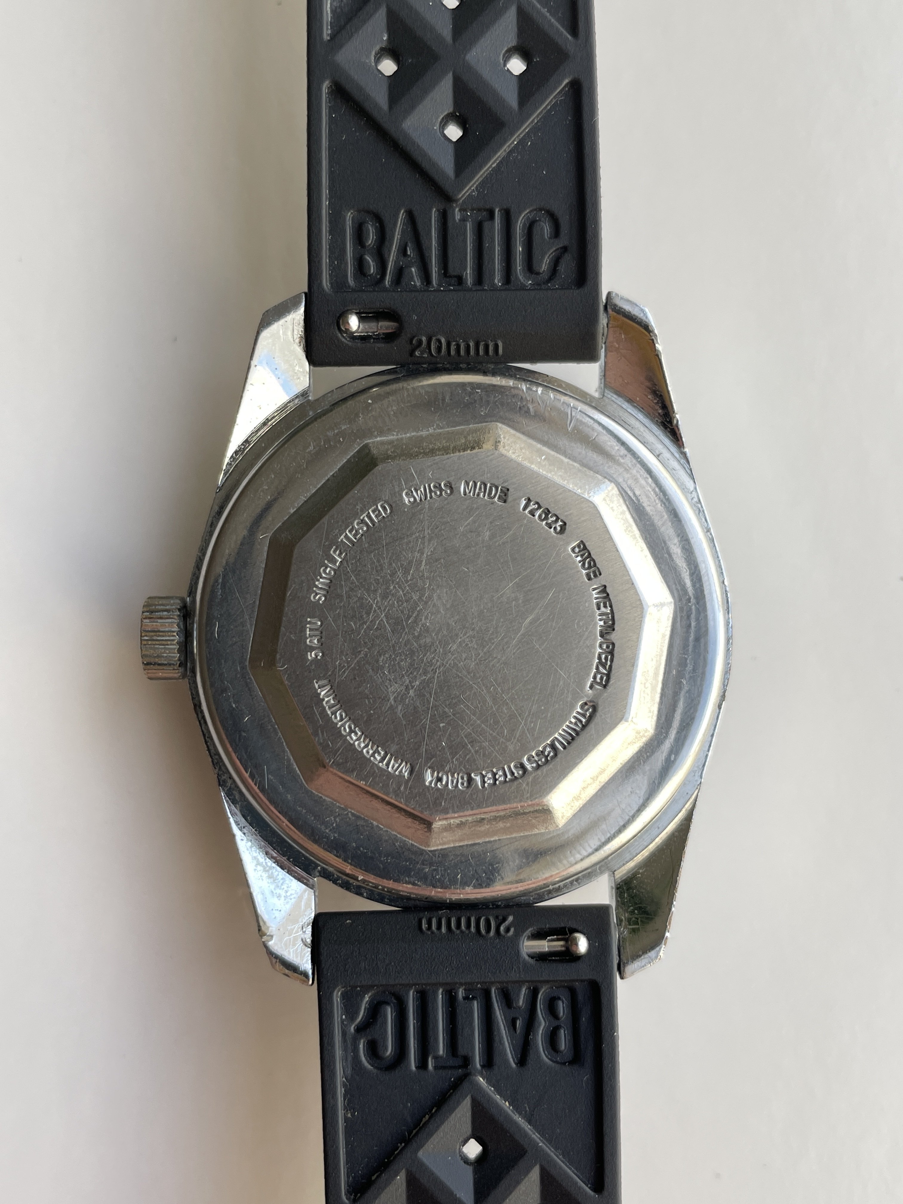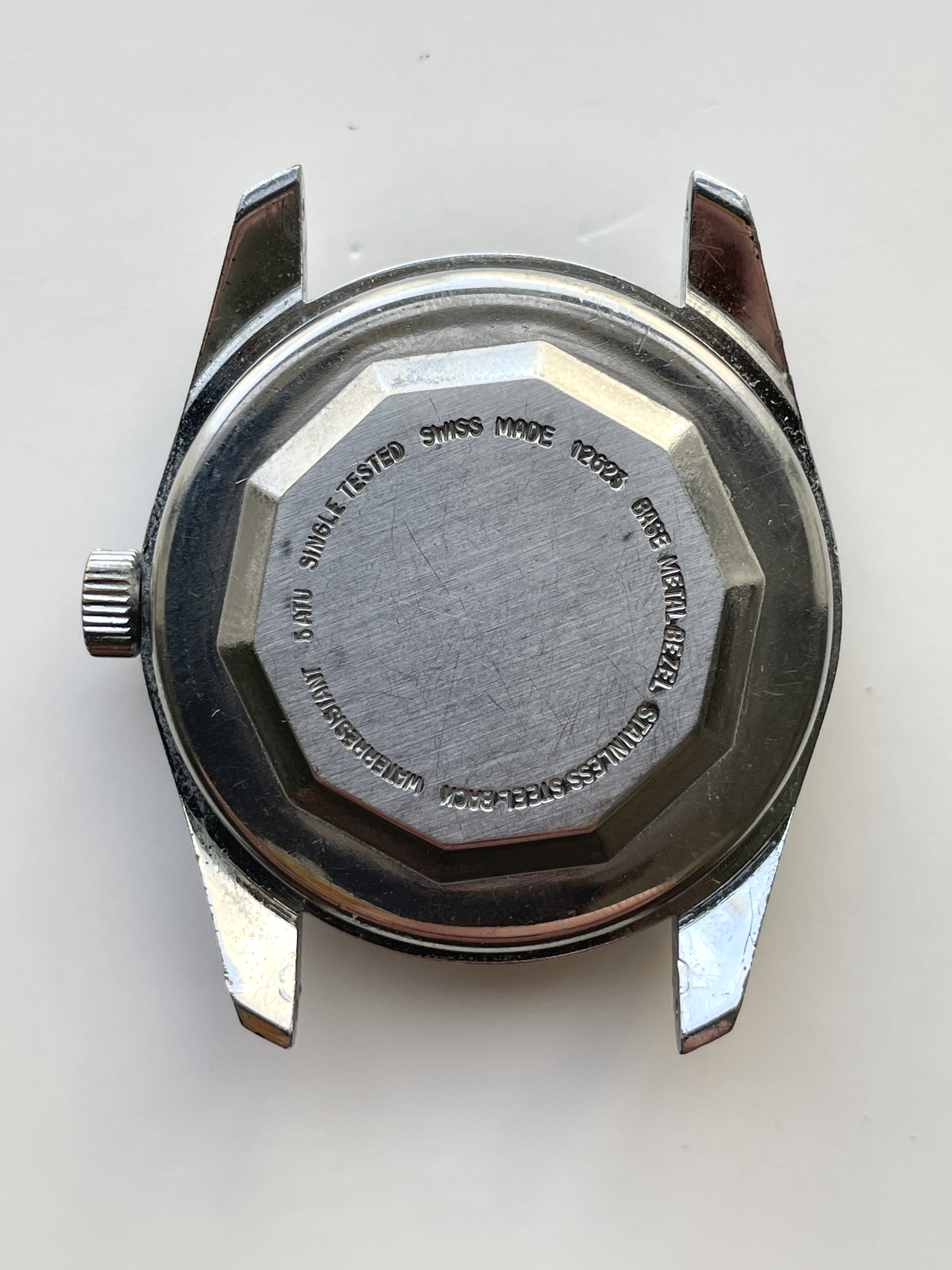 The chrome plated case measures 37mm excluding the crown, 45mm lug-to-lug and 20mm between the lugs. It presents excellent proportions and is still amazing shape, with a clean shiny finish and no pitting or corrosion. There is some superficial scratching on the top left lug (which I've photographed very closely to fully disclose), that is barely noticed when worn on the wrist. The crown shows a bit more deterioration than the case, as seen on the photos, which is only noticeable when looking very closely. The stainless steel case back is clean and free of wear.