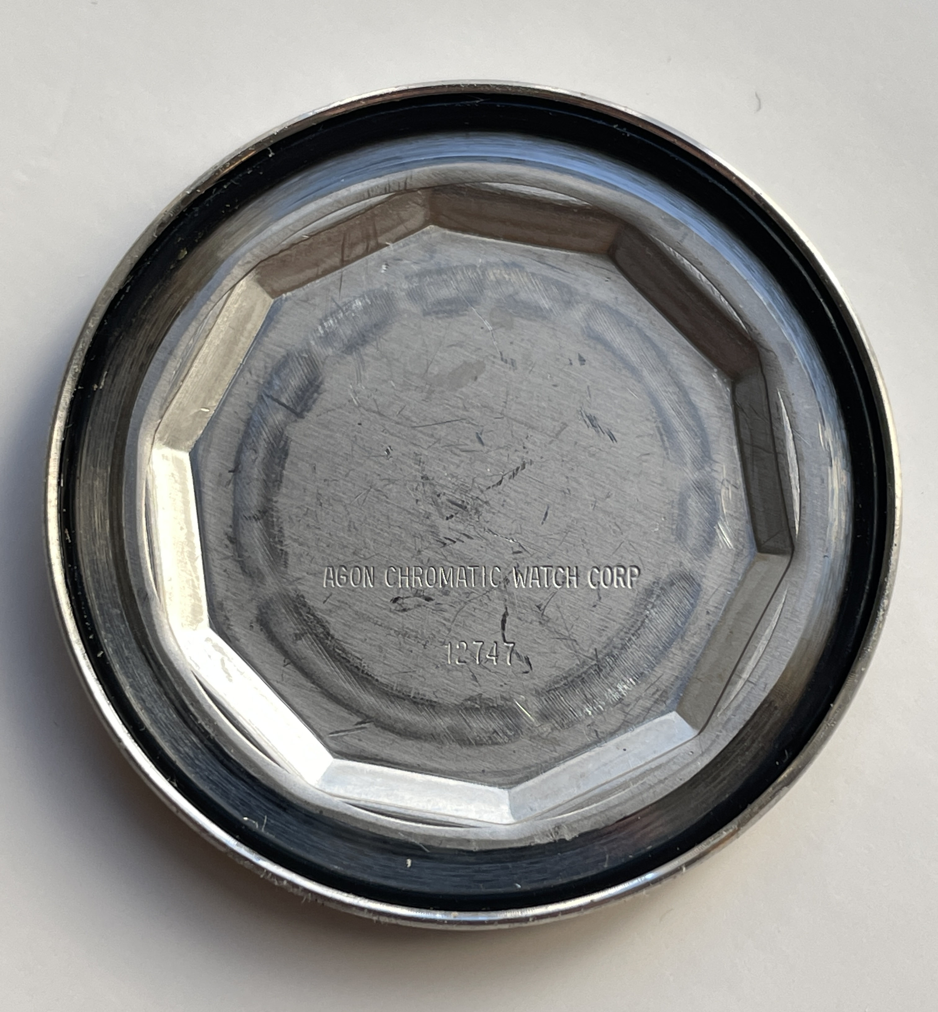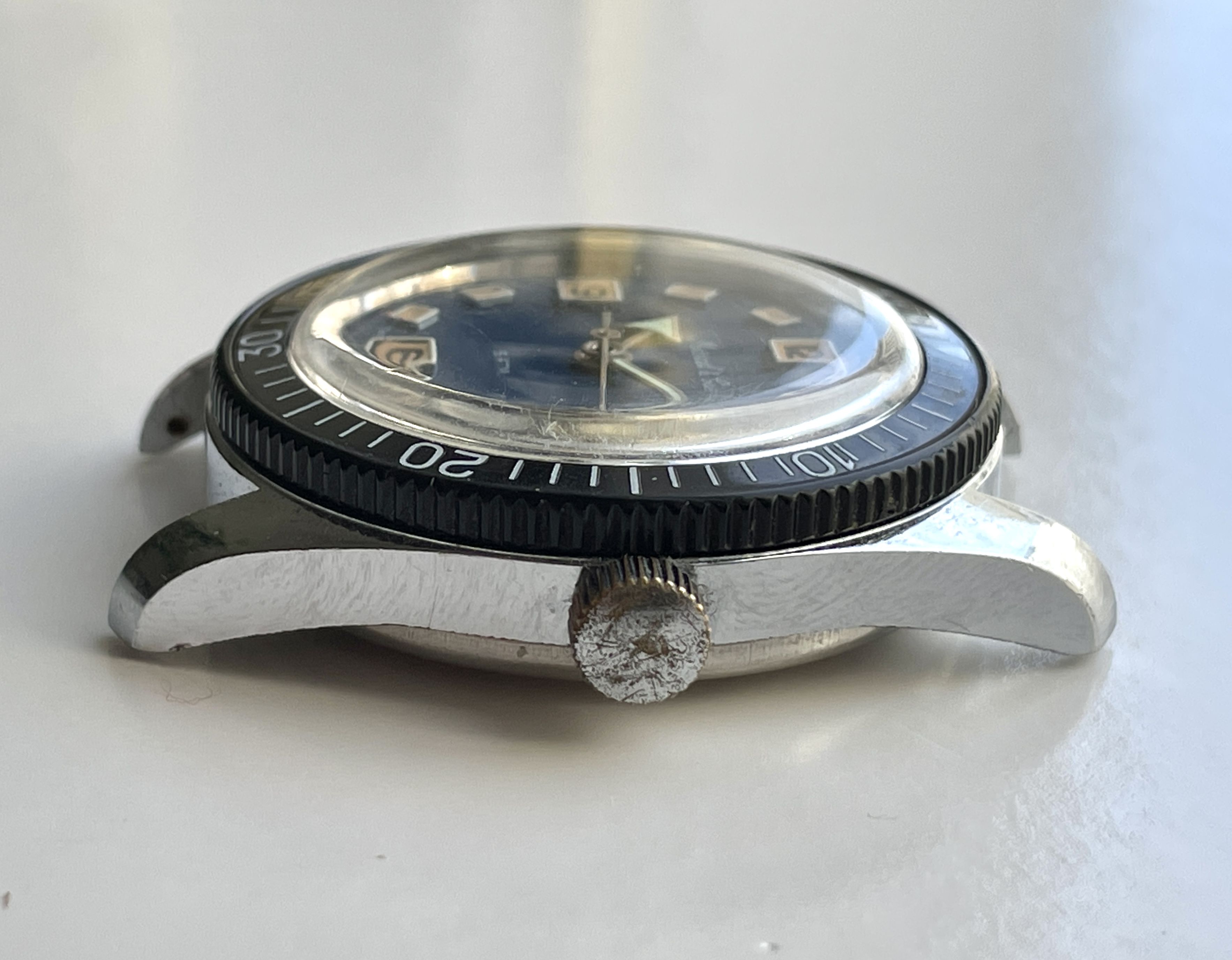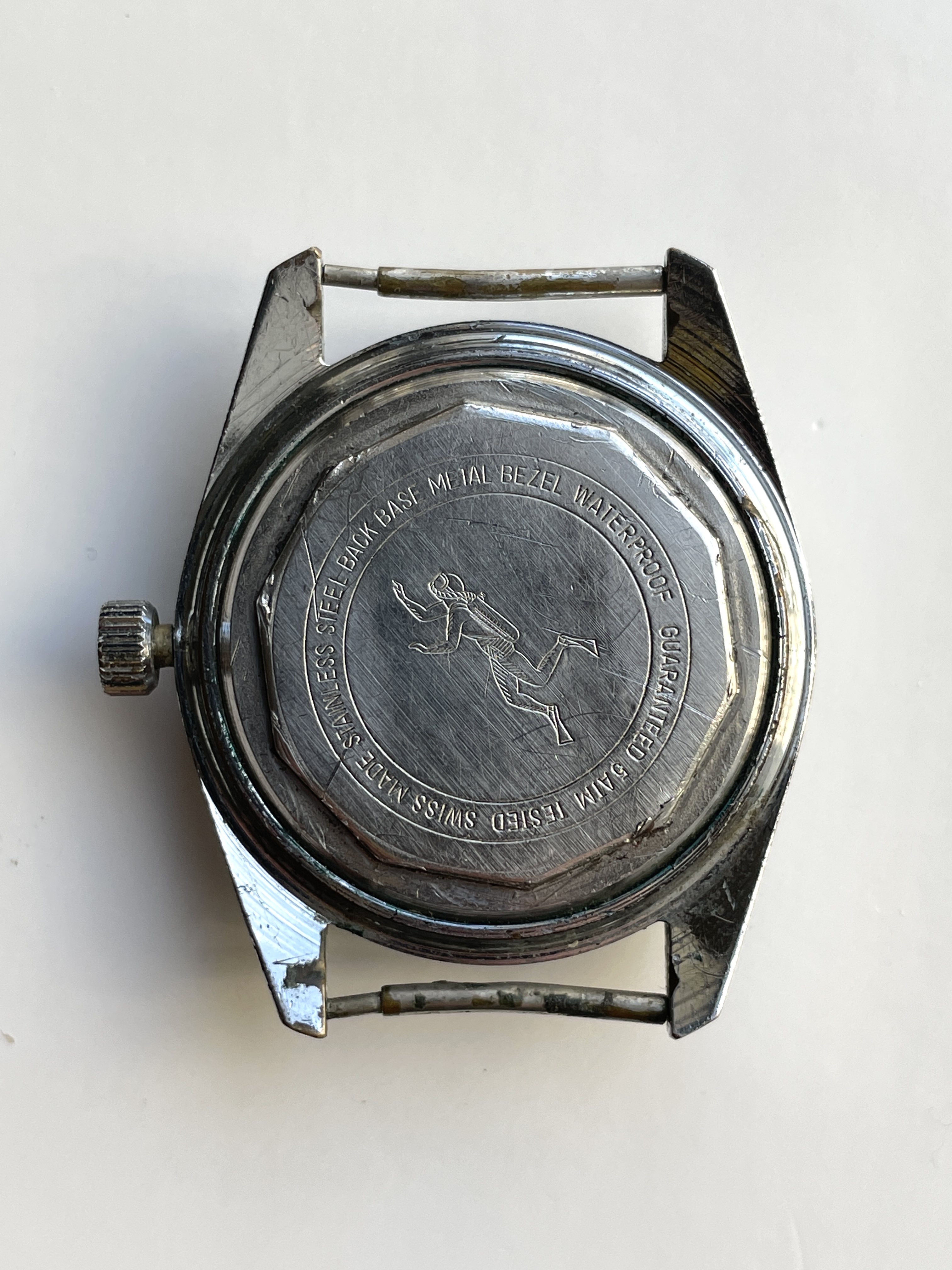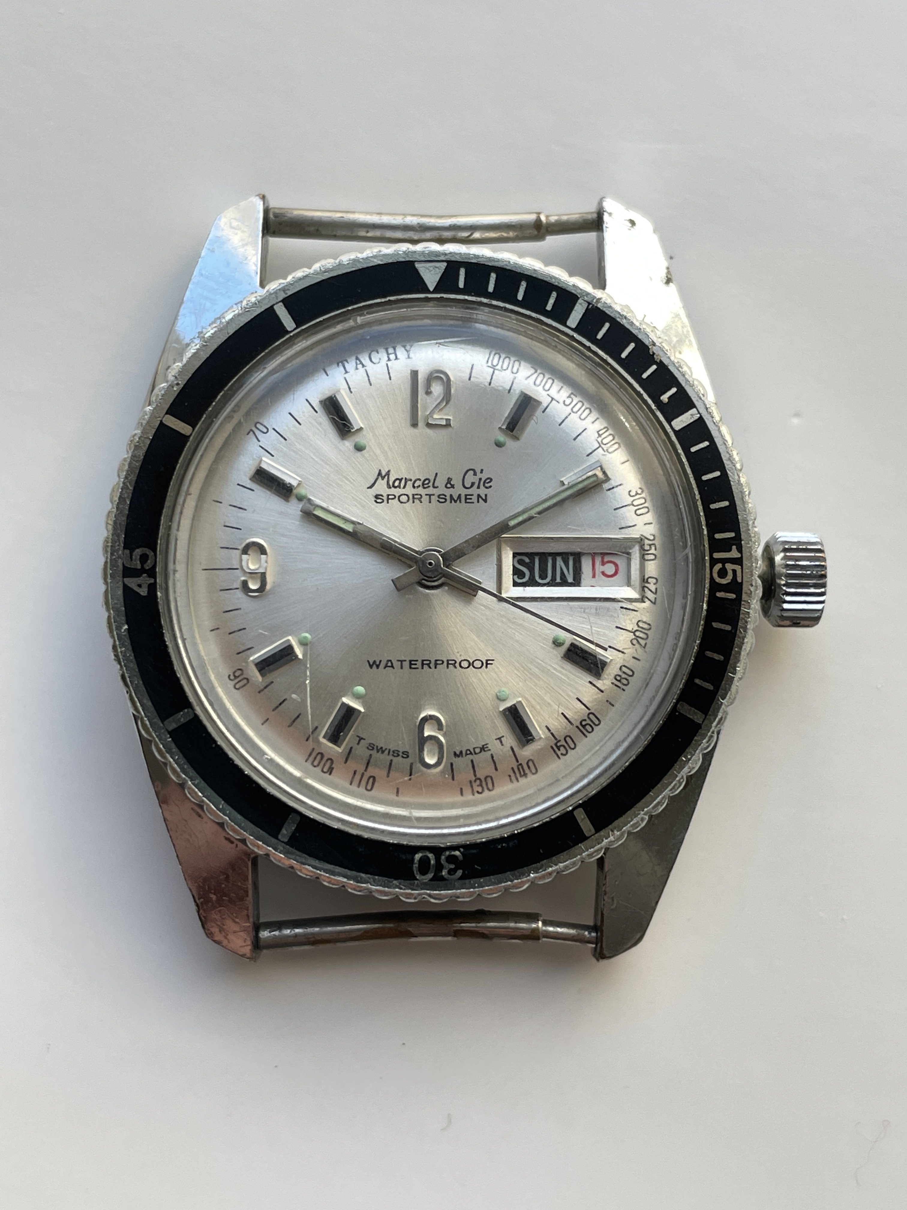 Also in the package— another Marcel & Cie "Sportsmen" diver. This one can only be qualified as "running, for parts" as it does wind and and the time can be set. The crown is hard to operate and it doesn't fully go back in to it's closed position, and doesn't allow the date to be set. The bezel is loose and comes off easily and the chrome plated case has some pitting and corrosion. See pics!