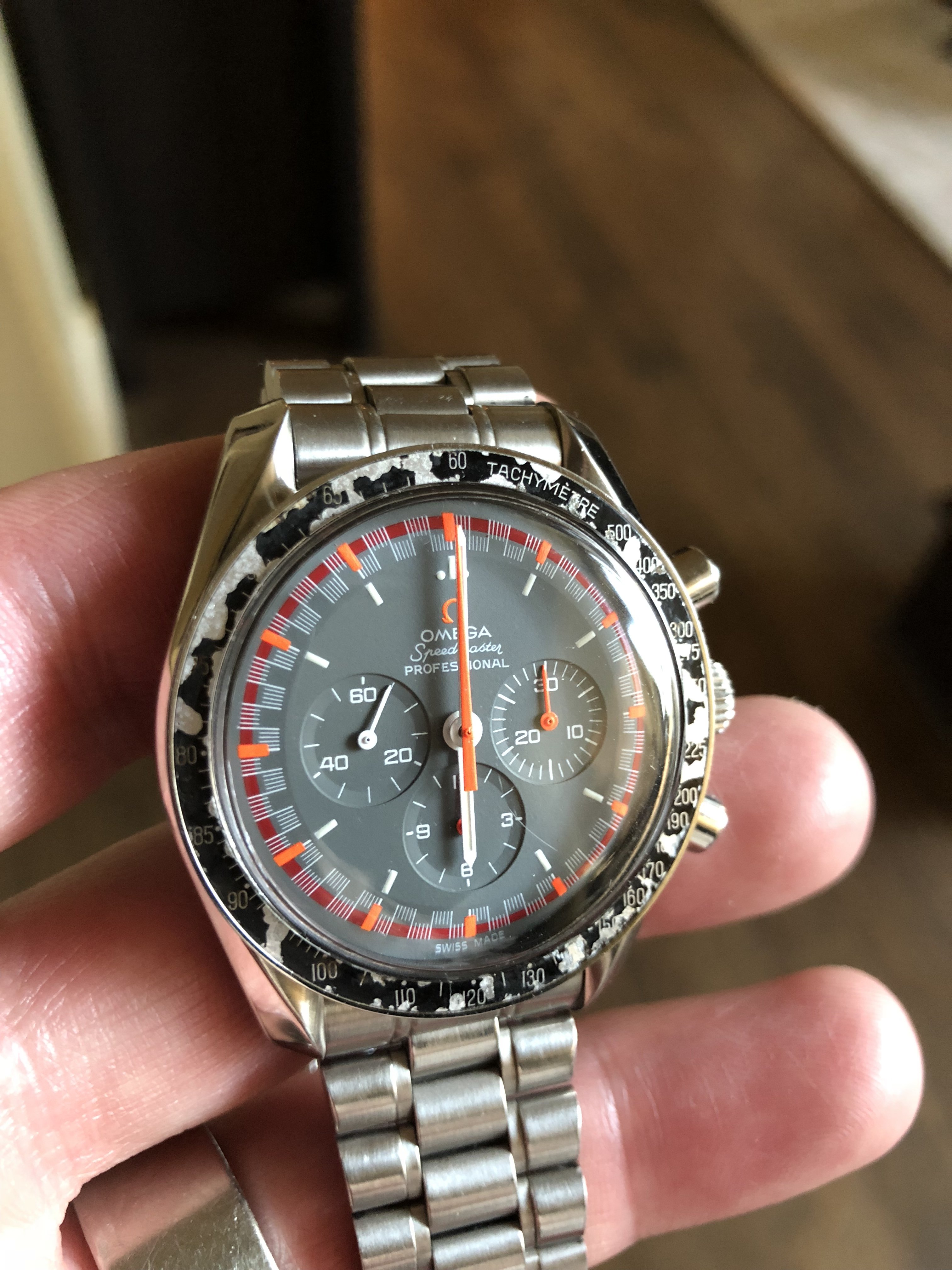 This was the best of the 3 pictures that were there. Whats wrong with it you may ask? Well, firstly, just wot-the-'ell is that bracelet 😲 ?! Secondly (and most off-putting) ... it had been photographed on (and thus had lots of contact with) that old urine-trap toilet mat 🤮 It appeared to be beaten half to death, however, the hour and minute hands are the less common 'exotic racing' variants found on the stupidly expensive exotic racing speedmasters, the lume appears clean (but its hard to tell much from these low res blurry pics), there appear to be no chipped/destroyed paint near the stems of any of the hands...and the fade of the hands is very appealing. It was a private seller in Norway, and he was asking about half of the going rate. Up until that date, I had never bought a watch on C24, but this one was promising, and whilst not cheap, much cheaper than anything I had seen. Thus for the princely sum of 1800USD (1615CHF), it became mine.