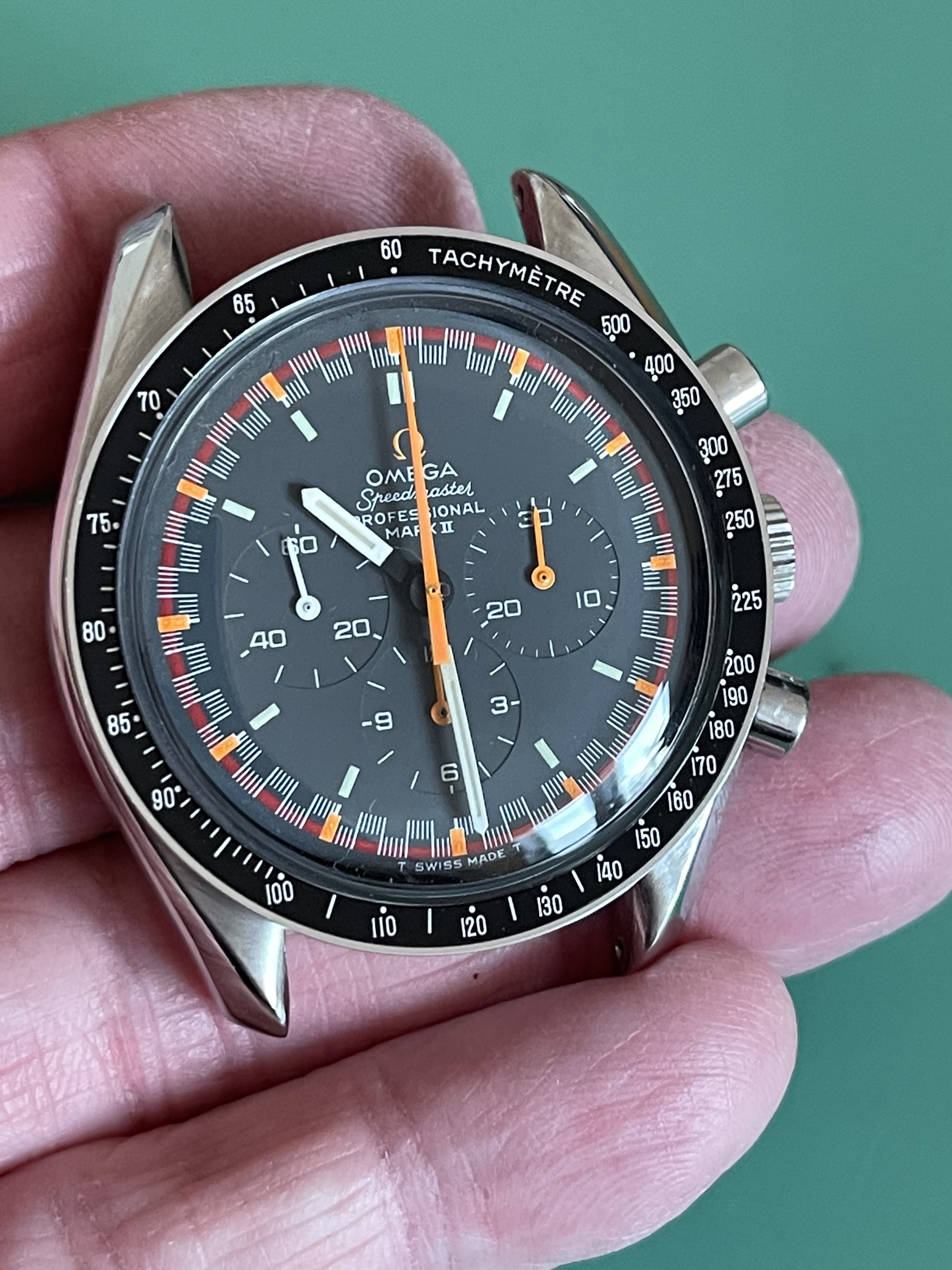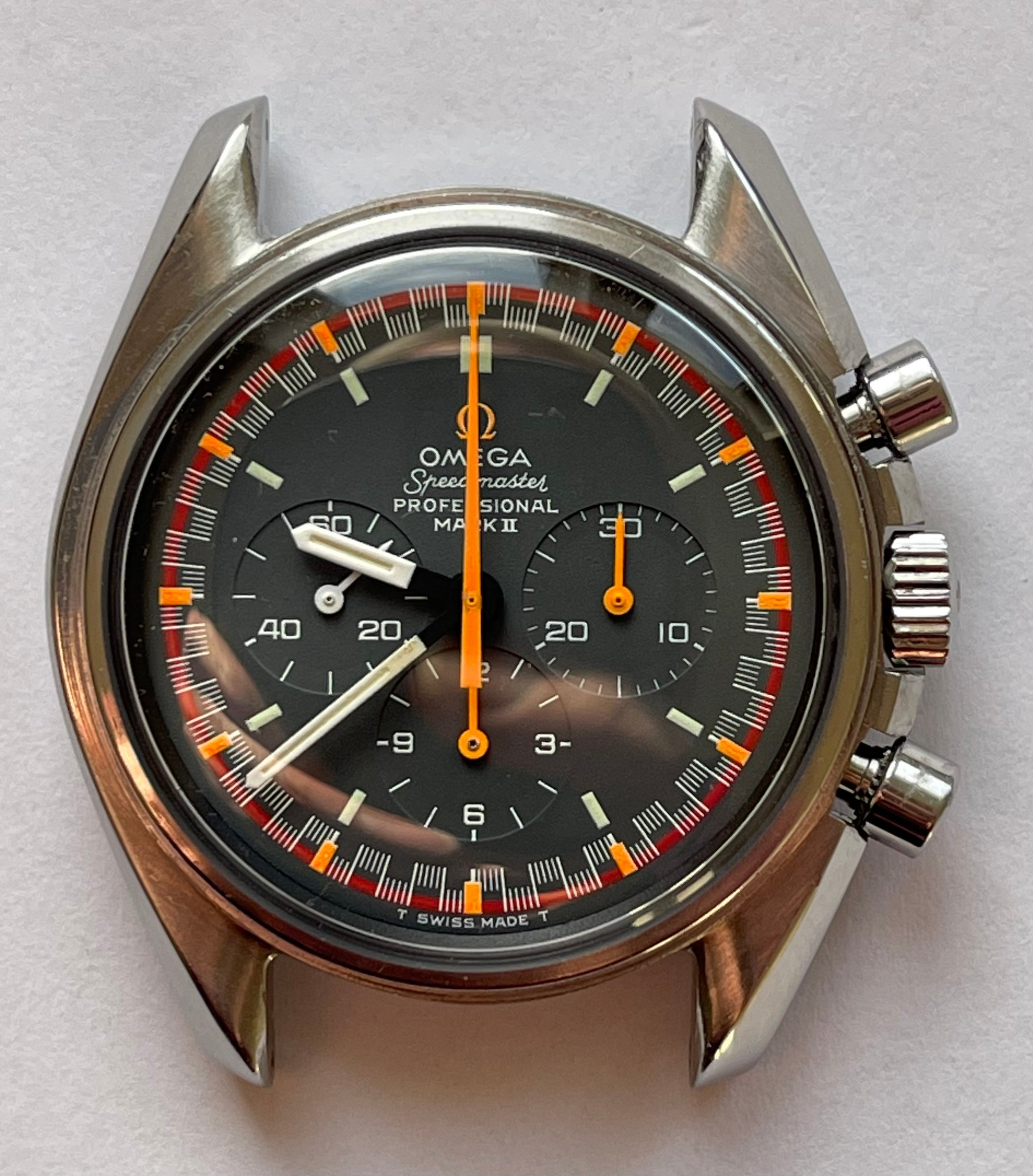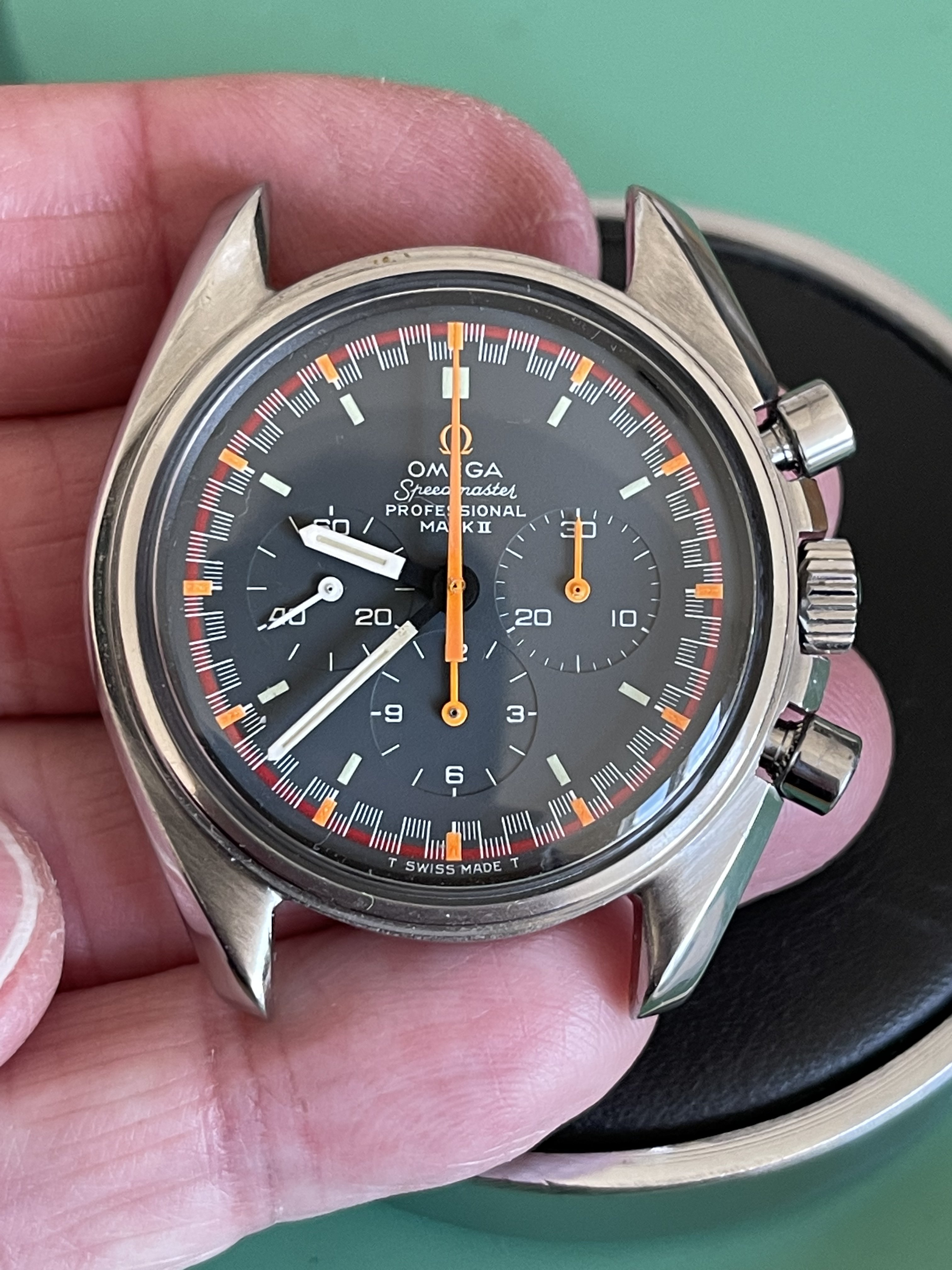 I found a Mk11 in Spain with a beaten up case (bracelet was nice though), however the dial and hands were all original and in absolutely beautiful condition, this piece had certainly had a life, but the dial and hands were just about perfect inside, ever so slight ageing, but all the original mkII’s hands were still displaying their original bright and matching orange colour, I had been looking for quite a while and usually the sweep hand and subdial hands have aged to the point of not looking so good, very rare to find when all orange hands match…. So I bought it.