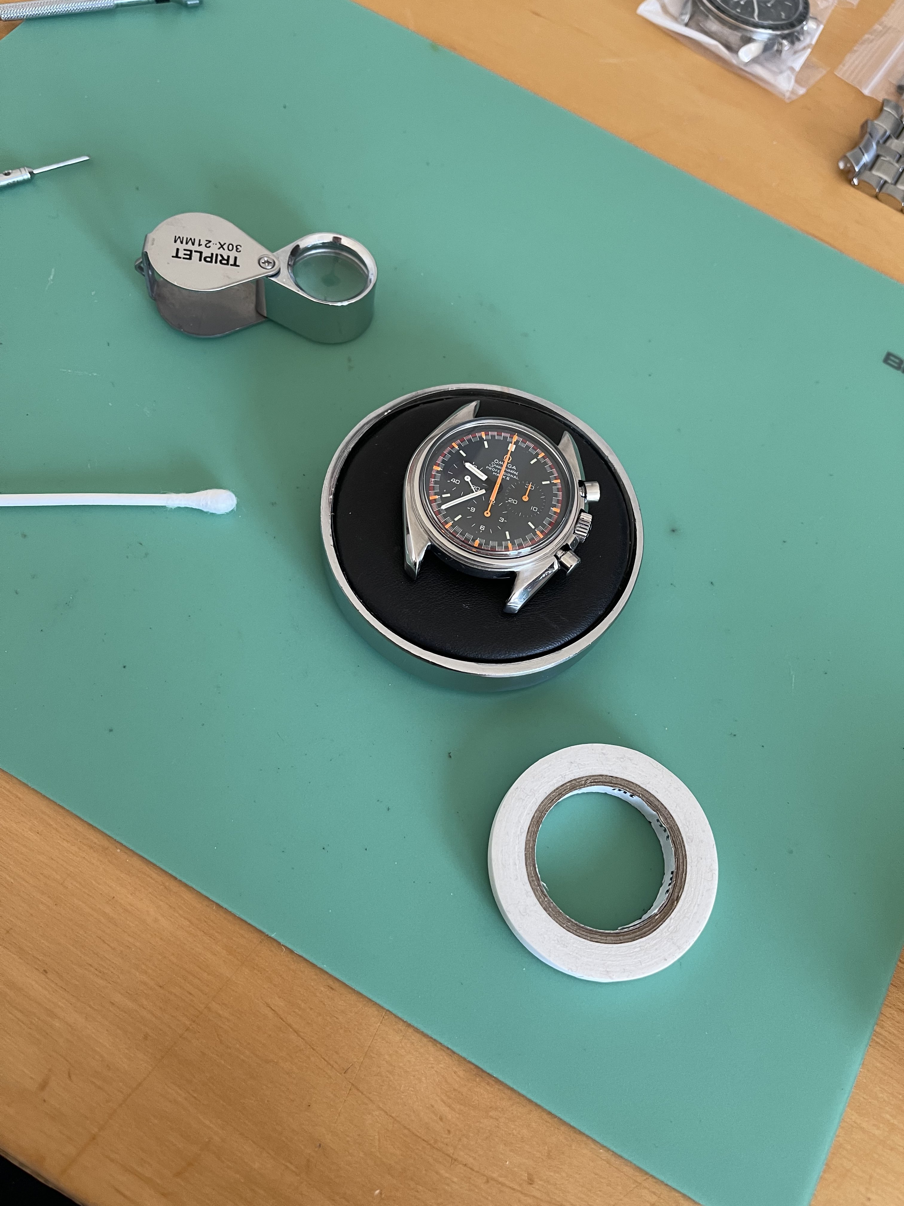P.S. The masking tape on the pushers and crown was put there whilst I polished the hesalite crystal, I didn’t want to get polish residue anywhere other than the crystal.