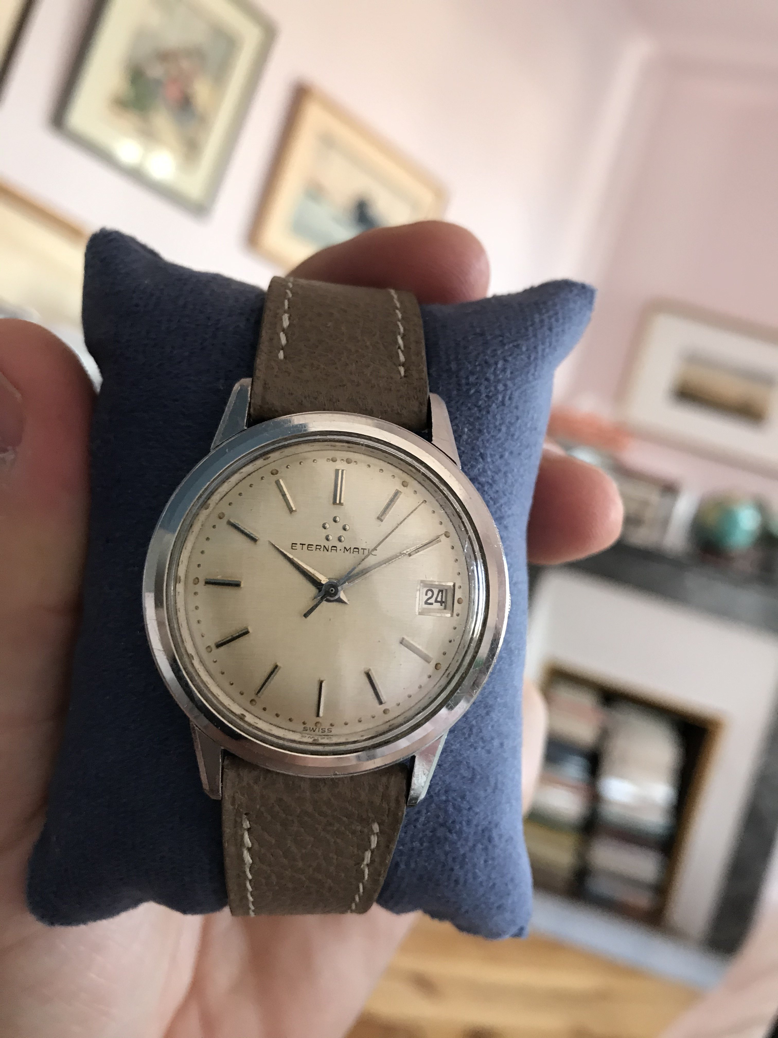 I realize I've been searching (getting inspiration from other nice combos) without thinking by myself 😀 Got it right most of the time but some are more complex. For instance this eterna with a stainless steel case + slightly goldish (or eggshell with some shining ?) linen dial (Can't capture it with my phone) & indexes... I finally opted for a taupe calf slightly textured one to realize it is a little boring...