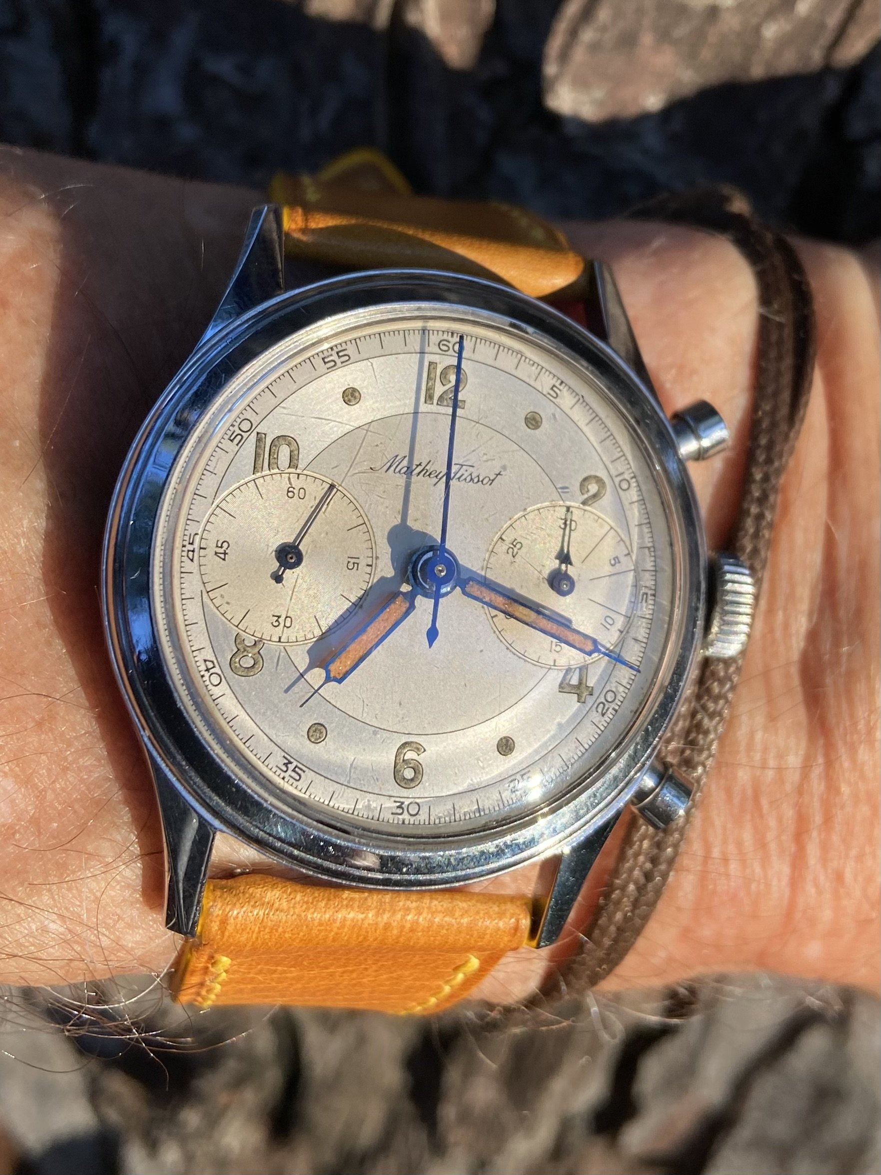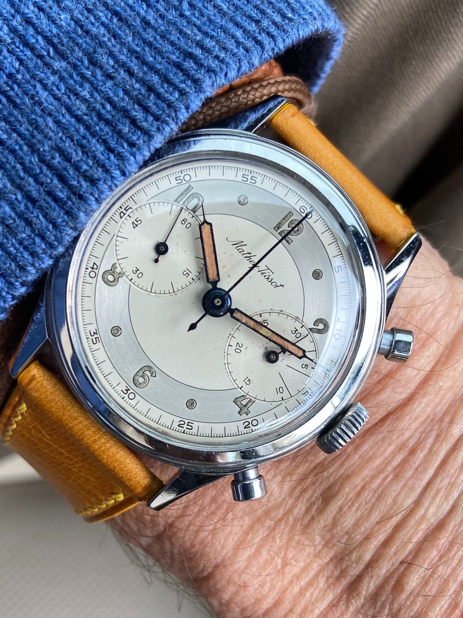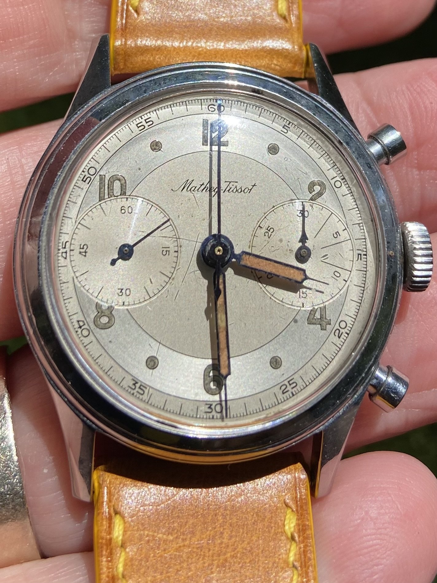 ·For sale is my rare circa 1940s-50s Mathey-Tissot chronograph running a Valjoux 22 in a 38mm stainless steel screw back case.