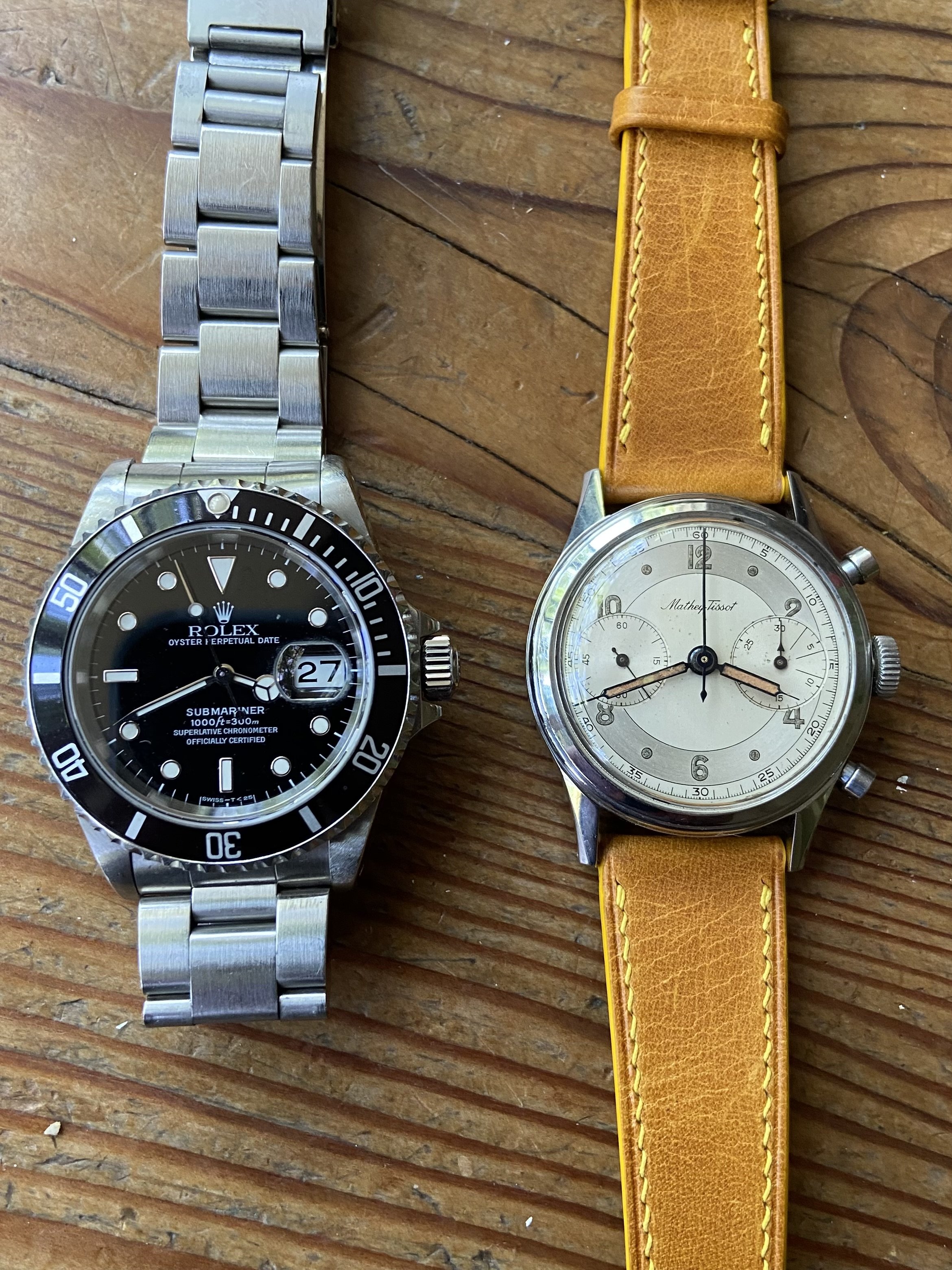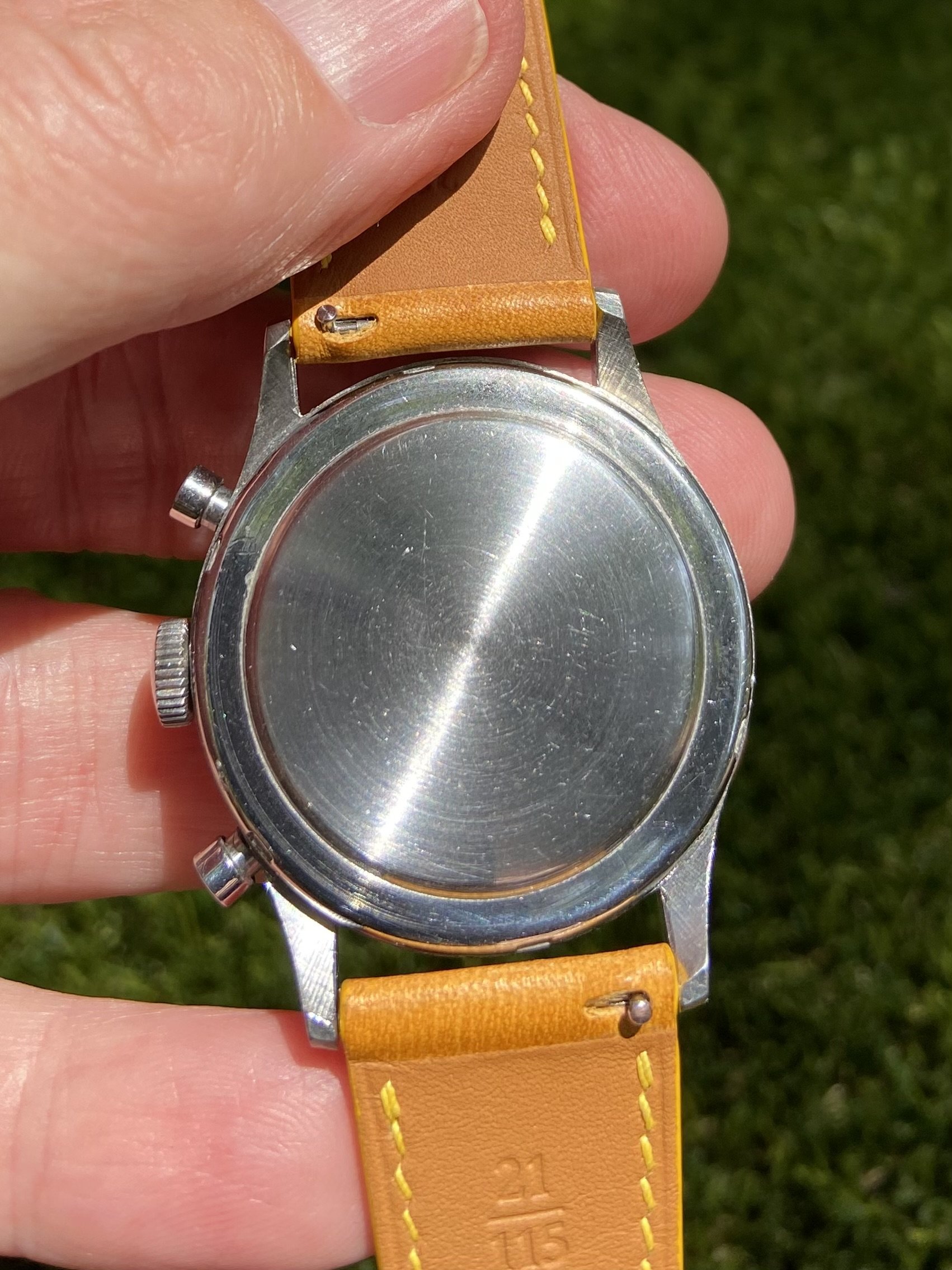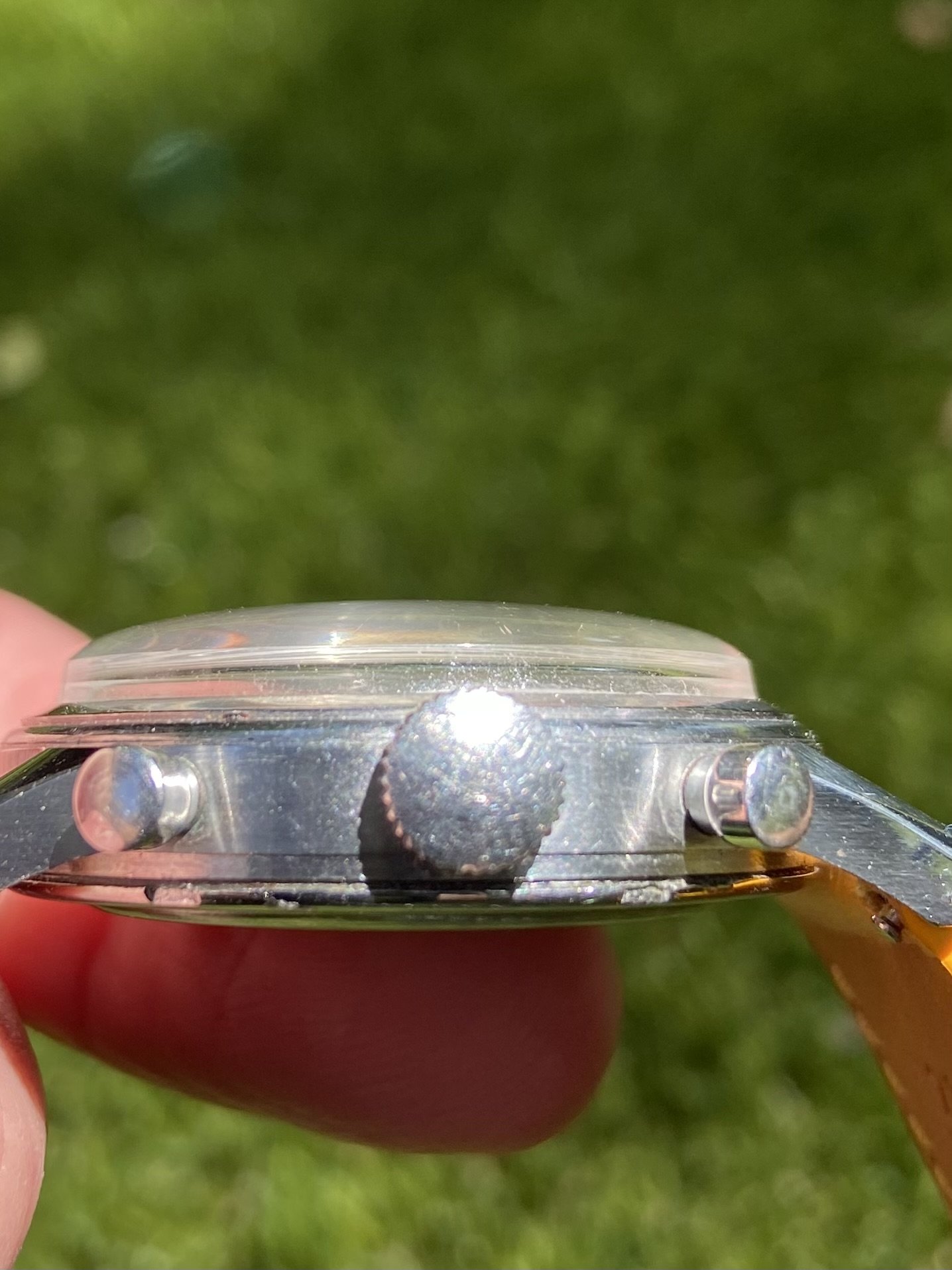 CASE: Large 38mm (see pic next to my Submariner for size) all stainless-steel two-piece screwed case. Drilled lugs retain beveled edges. Case has surface wear expected from a 70+year-old watch - with no prominent gouges or nicks. Inside steel case back is stamped Mathey-Tissot and 8638. Oversized crown is unsigned and believed to be original. Case in overall VG condition.