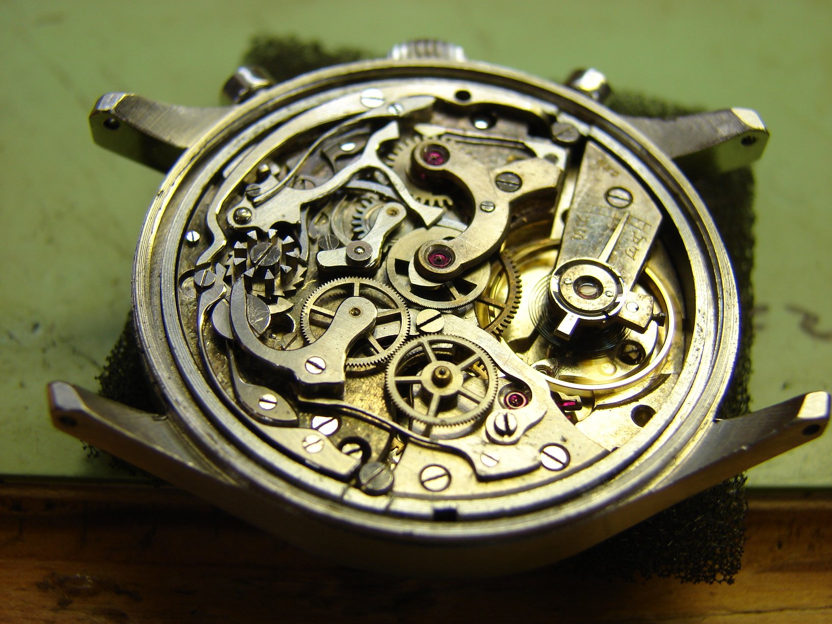 MOVEMENT: Valjoux caliber 22 chronograph movement - a ton of online info available on this high-quality column wheel movement. Recently replaced chrono runner. Watch runs well. Keeps time, sets and winds as it should. Chrono pushers and chrono functions are performing as they should (watchmakers receipt included with sale - no watchmaker warranty).