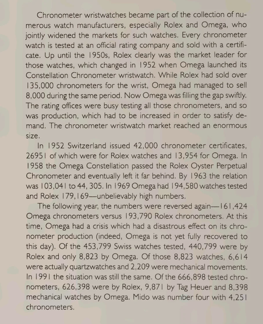 ·I think it's much more interesting to confine the comparison to the mid-century vintage era. It's basically self-evident that Omega completely fell apart in the 70s whereas Rolex was able to chart a successful path forward, whatever one thinks of it. But in the 50s and 60s, Omega and Rolex were much more evenly matched. The Anton Kreuzer book has this interesting passage about their closely competitive numbers in chronometer certificates in this period.