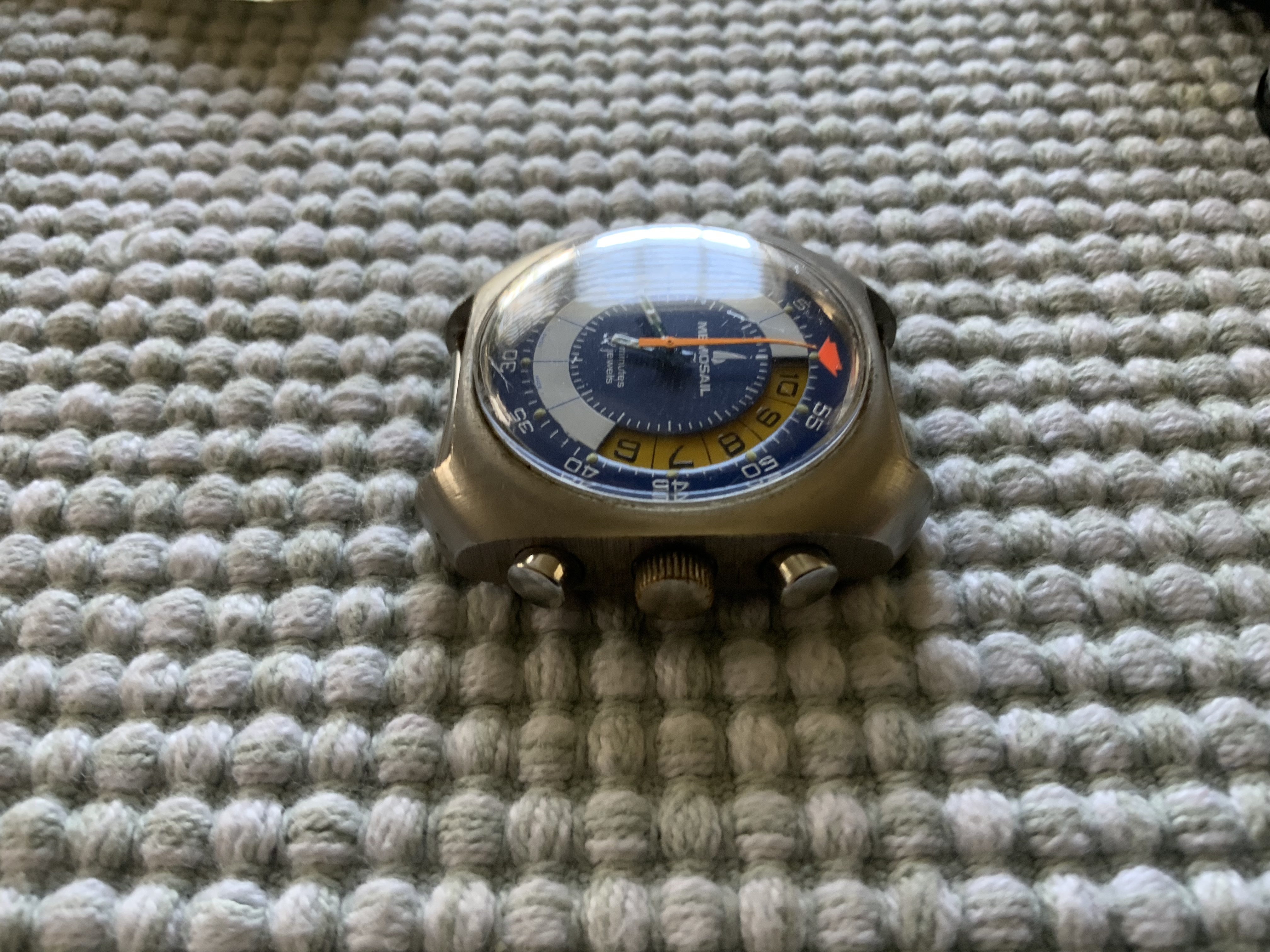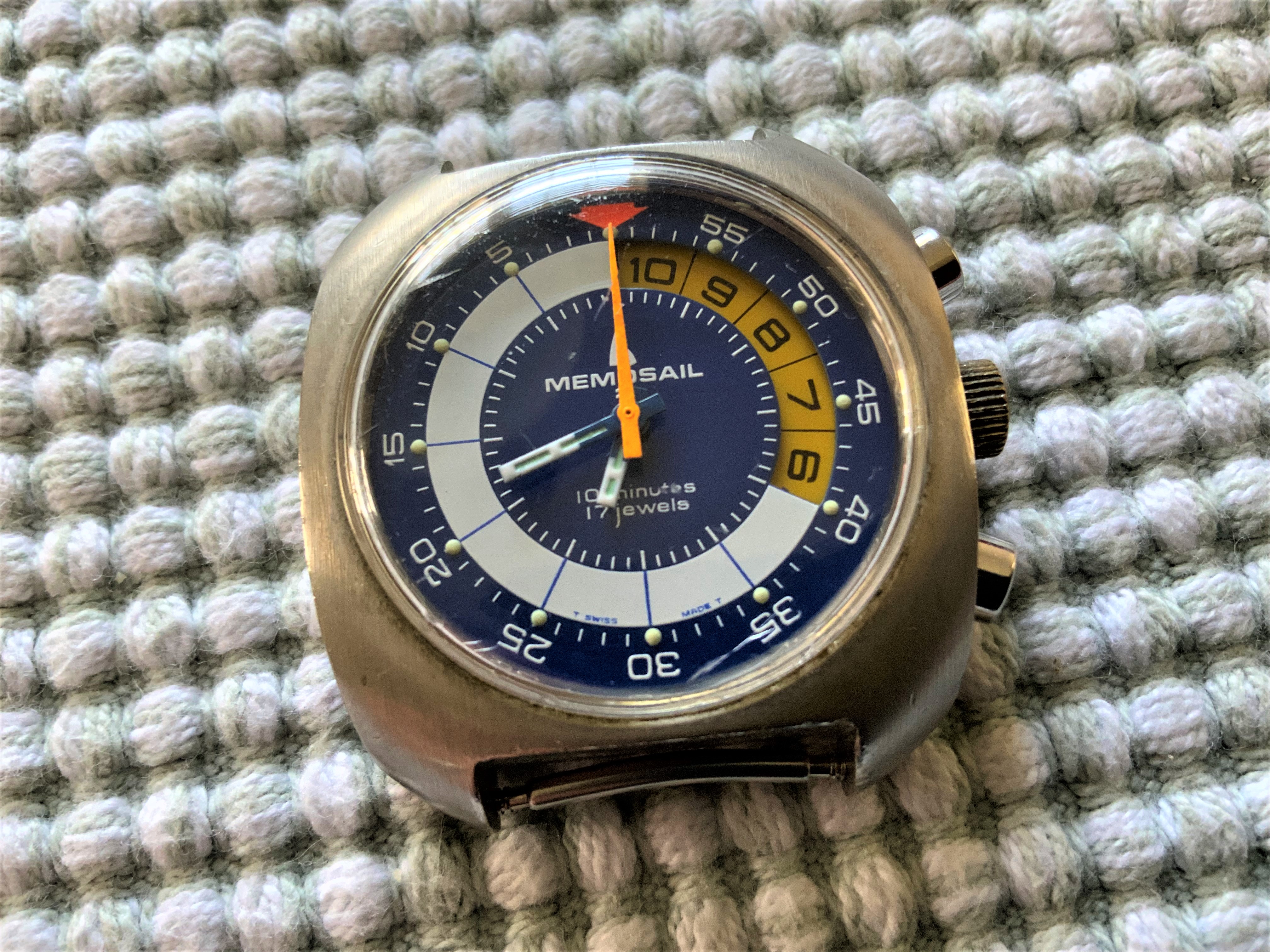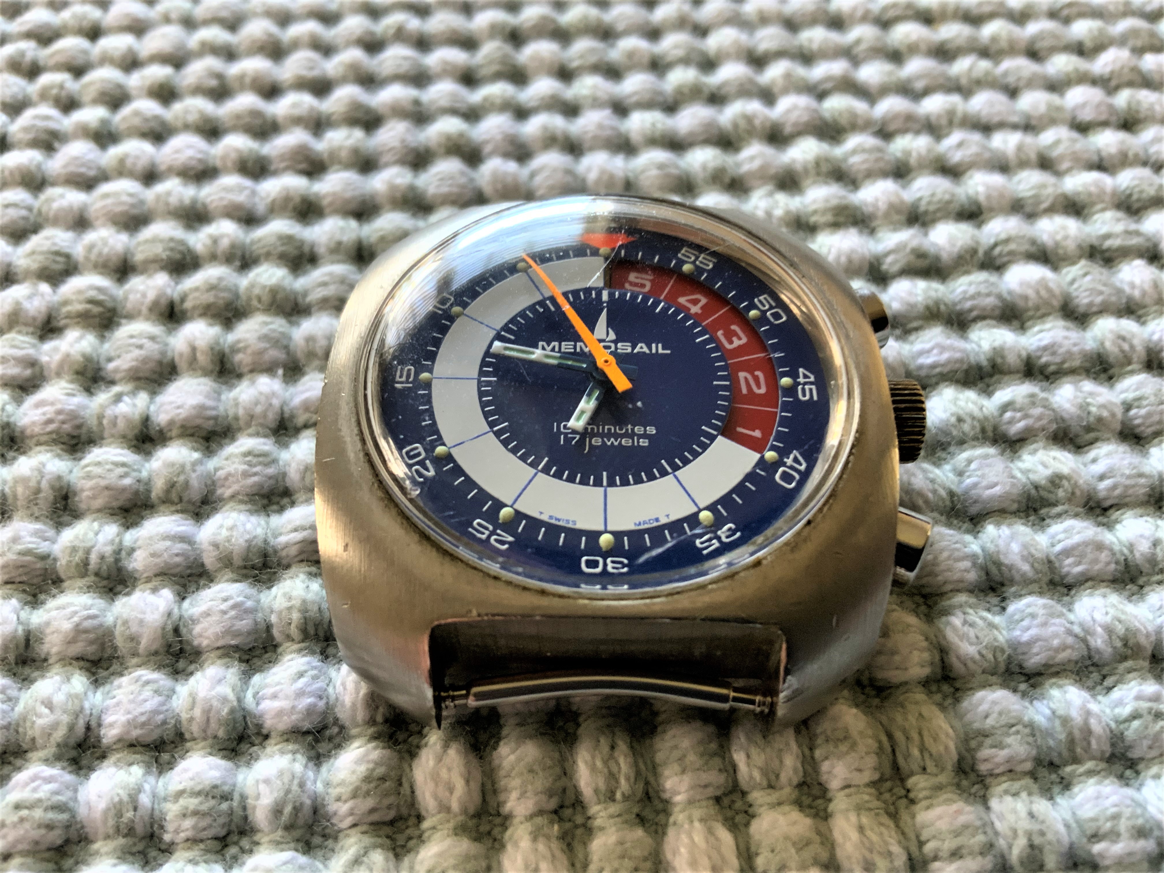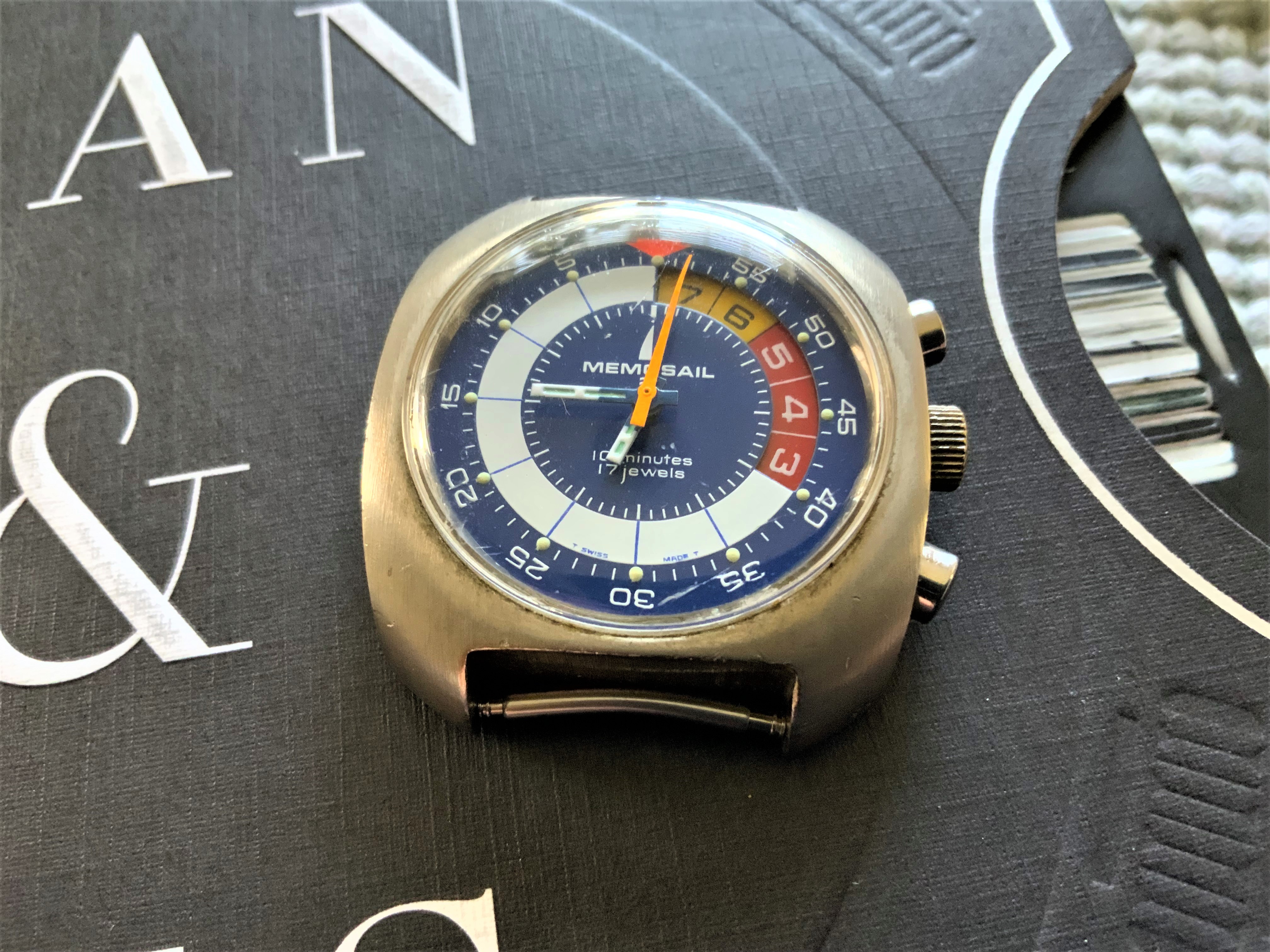 ·This is a fun watch and it works fine. It uses a Valjoux 7737 movement in an almost square case. The case measures 38 x 42 mm. The watch shows little signs of use and the crystal has some minor scratches. The watch was bought in the 70s by a woman sailor who raced on Lake Michigan, and I bought it from her. There is a color coded disc visible in a large window (12:00-4:00) that reveals a moving disc that jumps every 30 seconds, starting at 10 minutes and counting down to 0, which is START. Sailboat racing has a 10 (or 5) minute countdown before the start of the race.