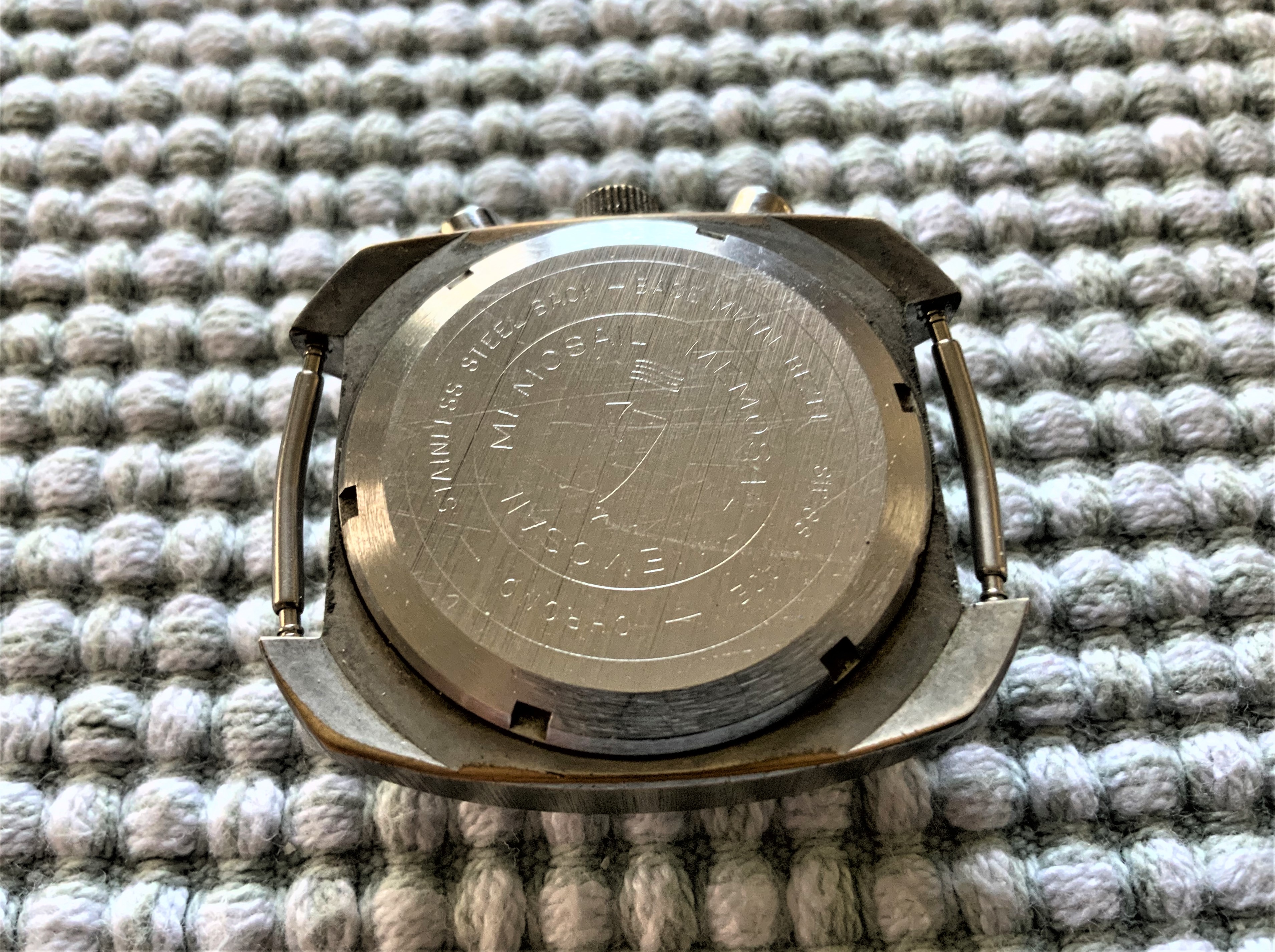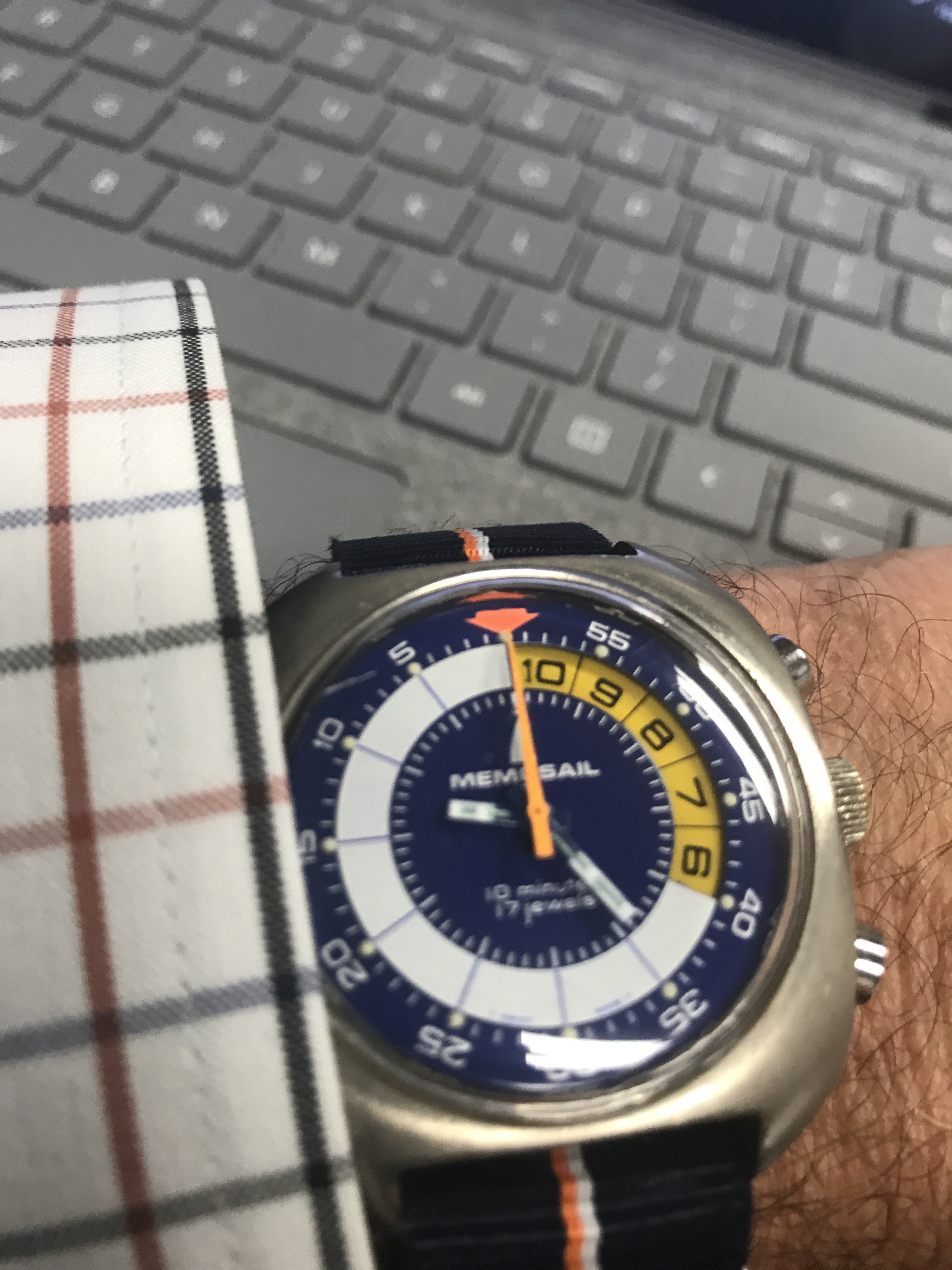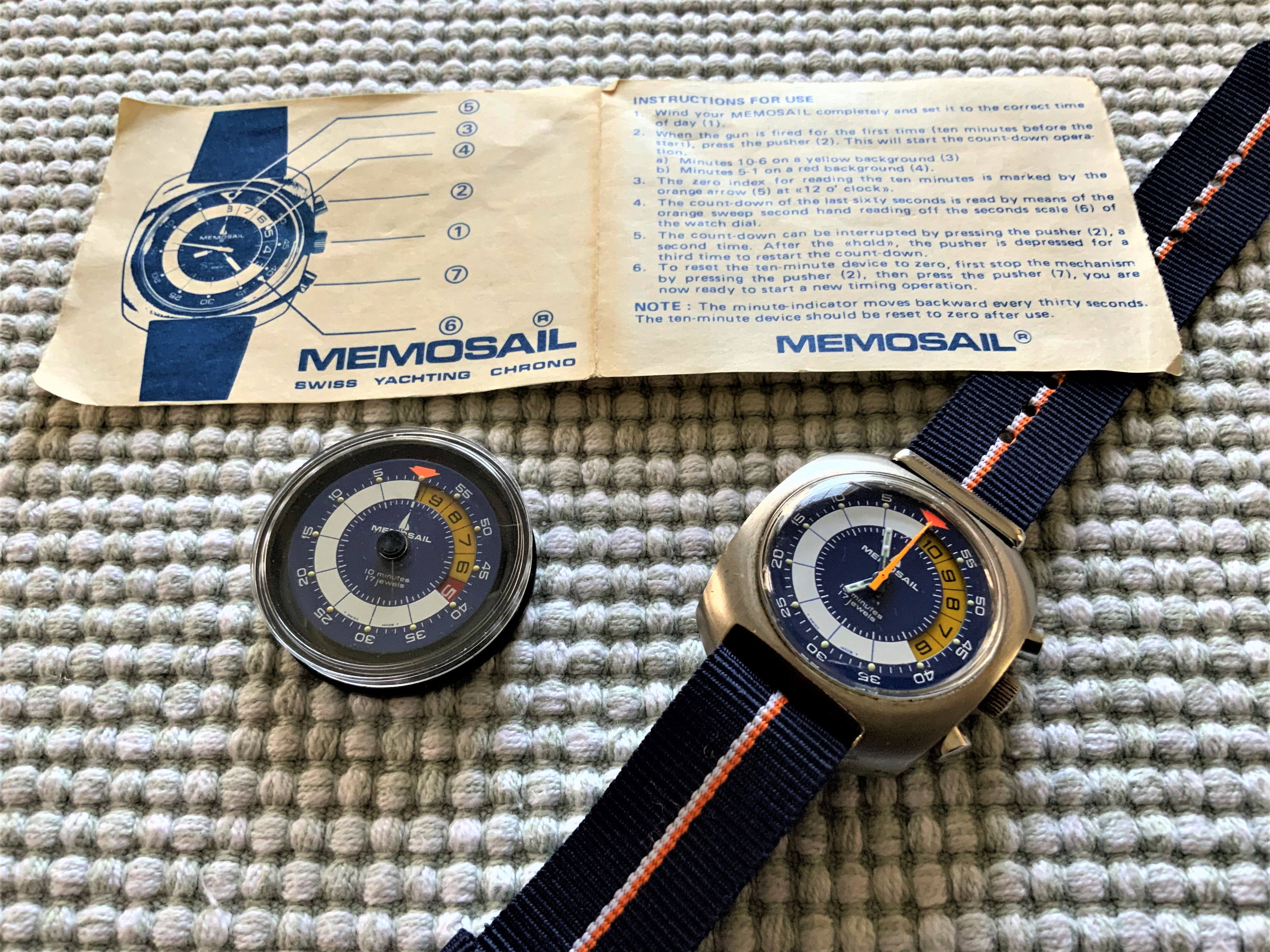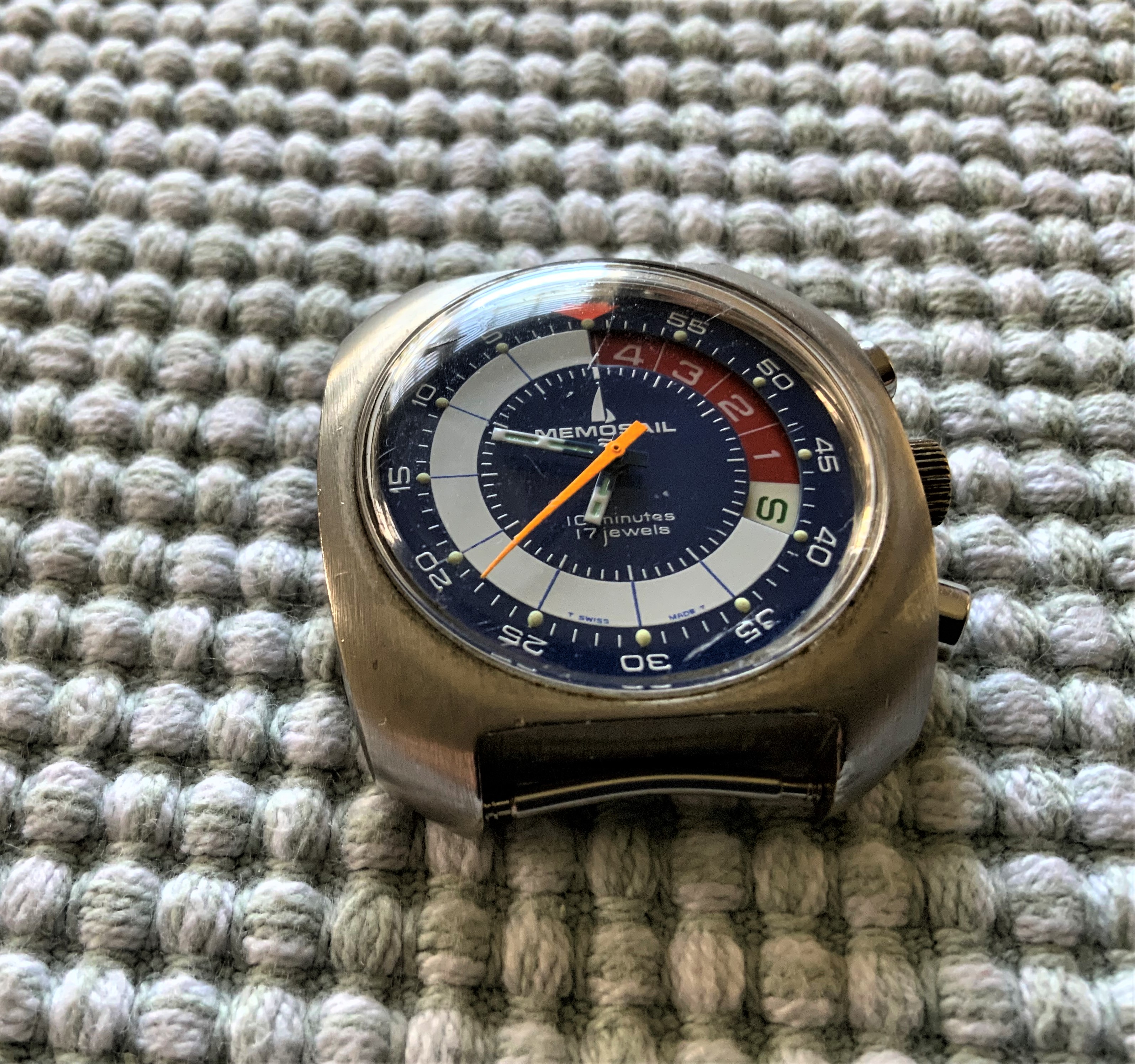 ·This is a fun watch and it works fine. It uses a Valjoux 7737 movement in an almost square case. The case measures 38 x 42 mm. The watch shows little signs of use and the crystal has some minor scratches. The watch was bought in the 70s by a woman sailor who raced on Lake Michigan, and I bought it from her. There is a color coded disc visible in a large window (12:00-4:00) that reveals a moving disc that jumps every 30 seconds, starting at 10 minutes and counting down to 0, which is START. Sailboat racing has a 10 (or 5) minute countdown before the start of the race.
