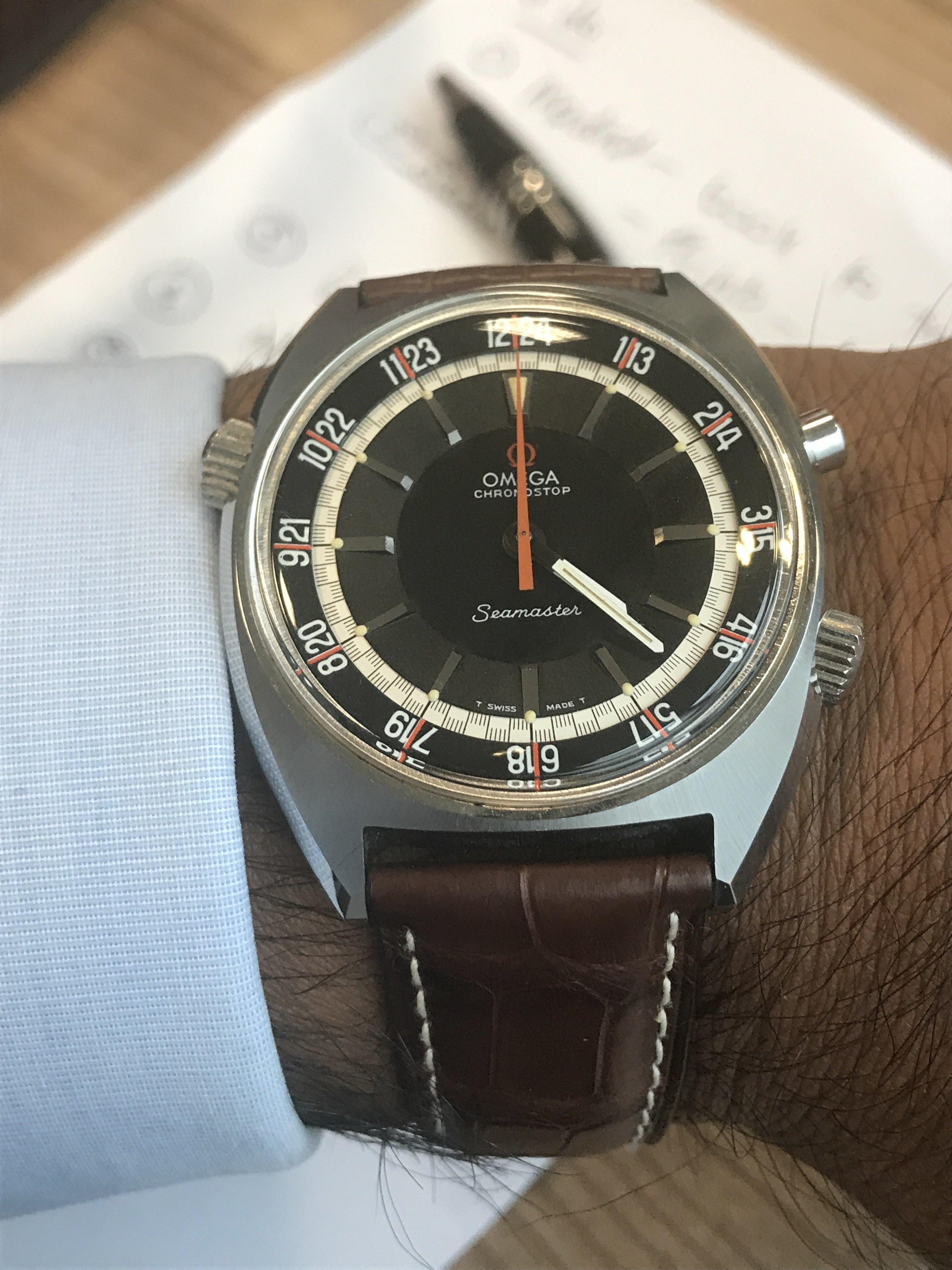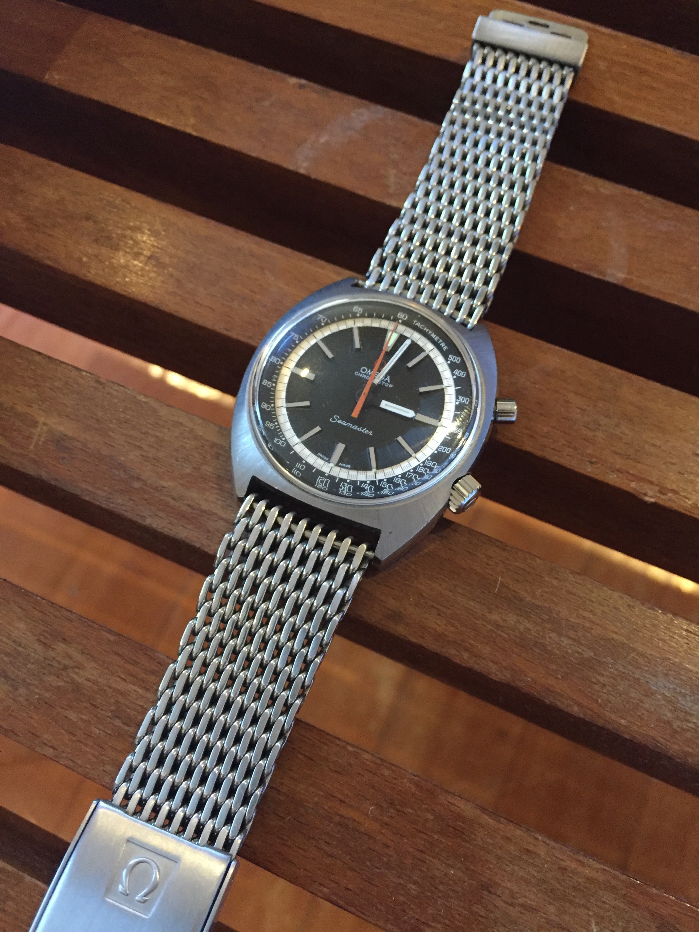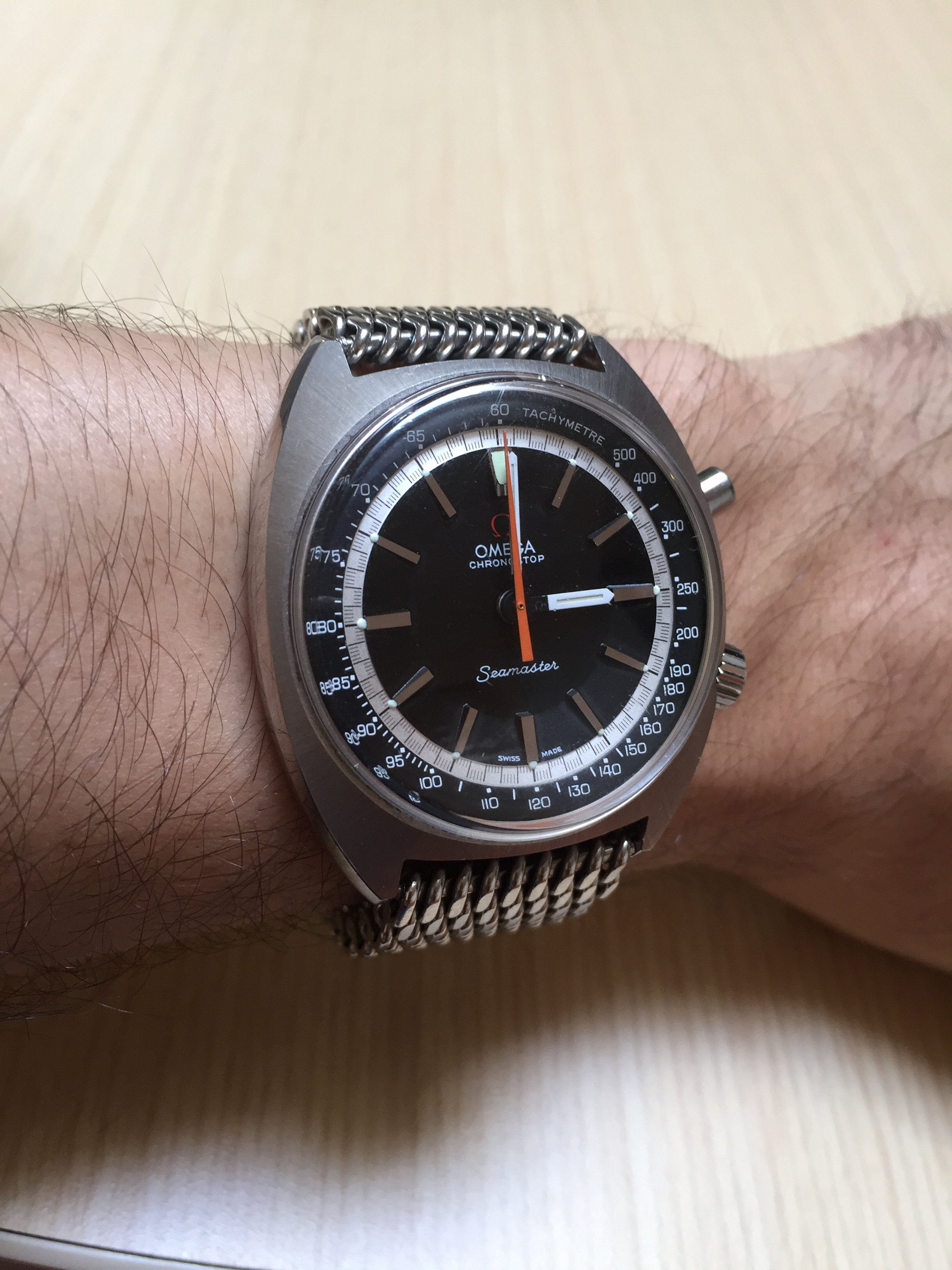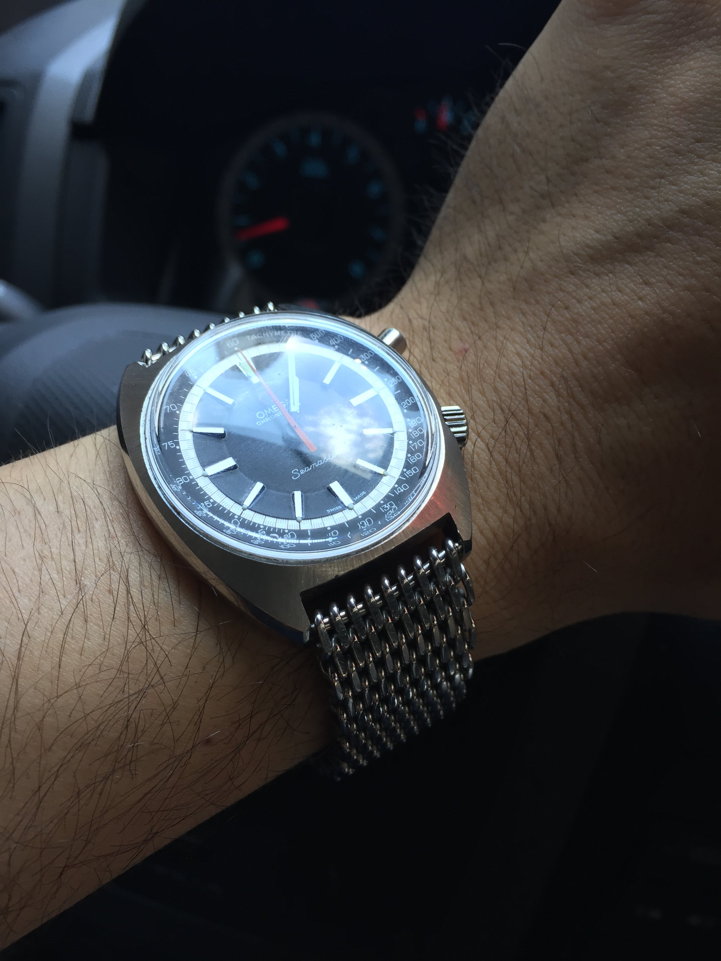 I'm now considering the "shark" or metal "mesh" band as found on some of these larger casing Chronographs. I'm also considering a less involved NATO. This watch is an interesting one because it is, by nature, very big on its own, but boasts an almost casual look (vs. a vintage Breitling, for instance).