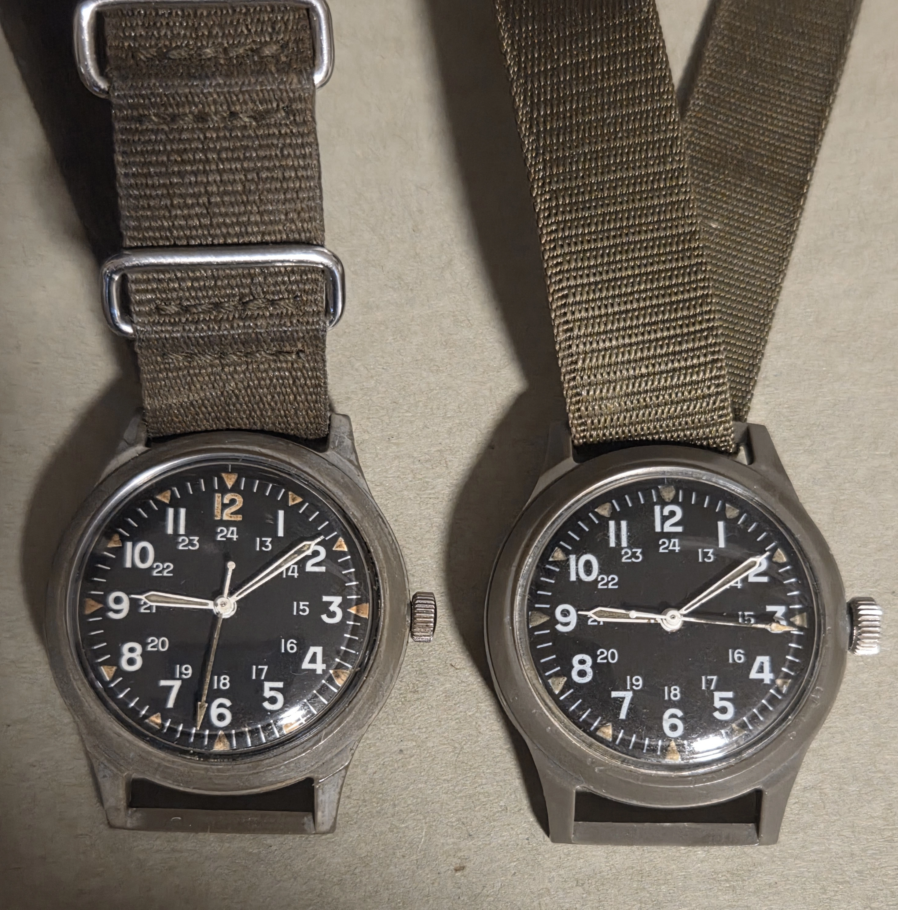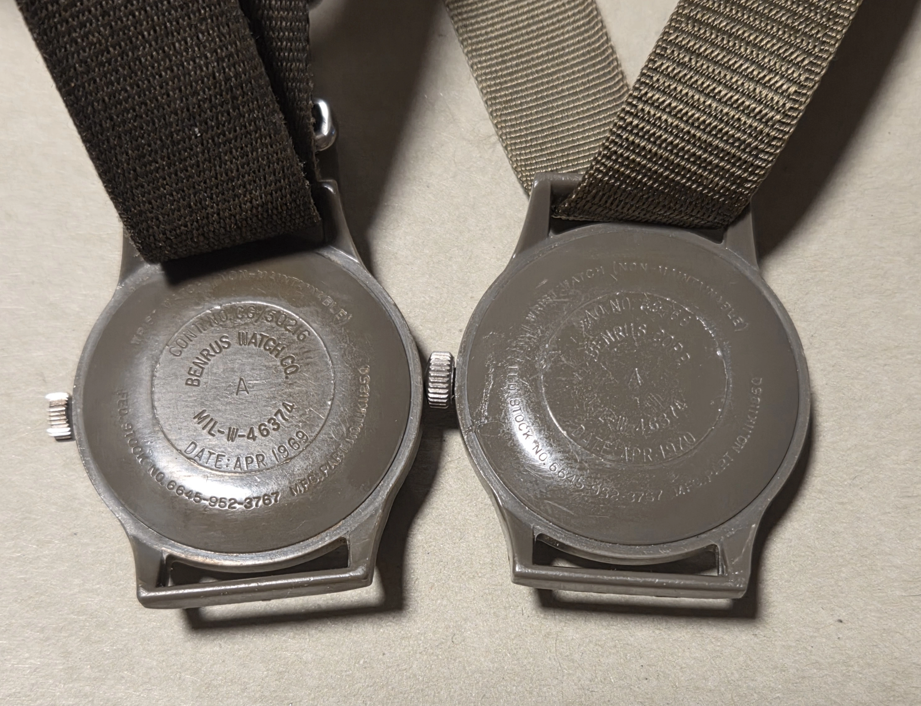 Happy to bag this great pairing of these two 1969 & 1970 "plastic fantastic" Benrus Mil-W-46374's and both stamped A (Australian issue). Interesting pairing as the last of the lumed 12 (1969) and the first of the non lumed 12 (1970)