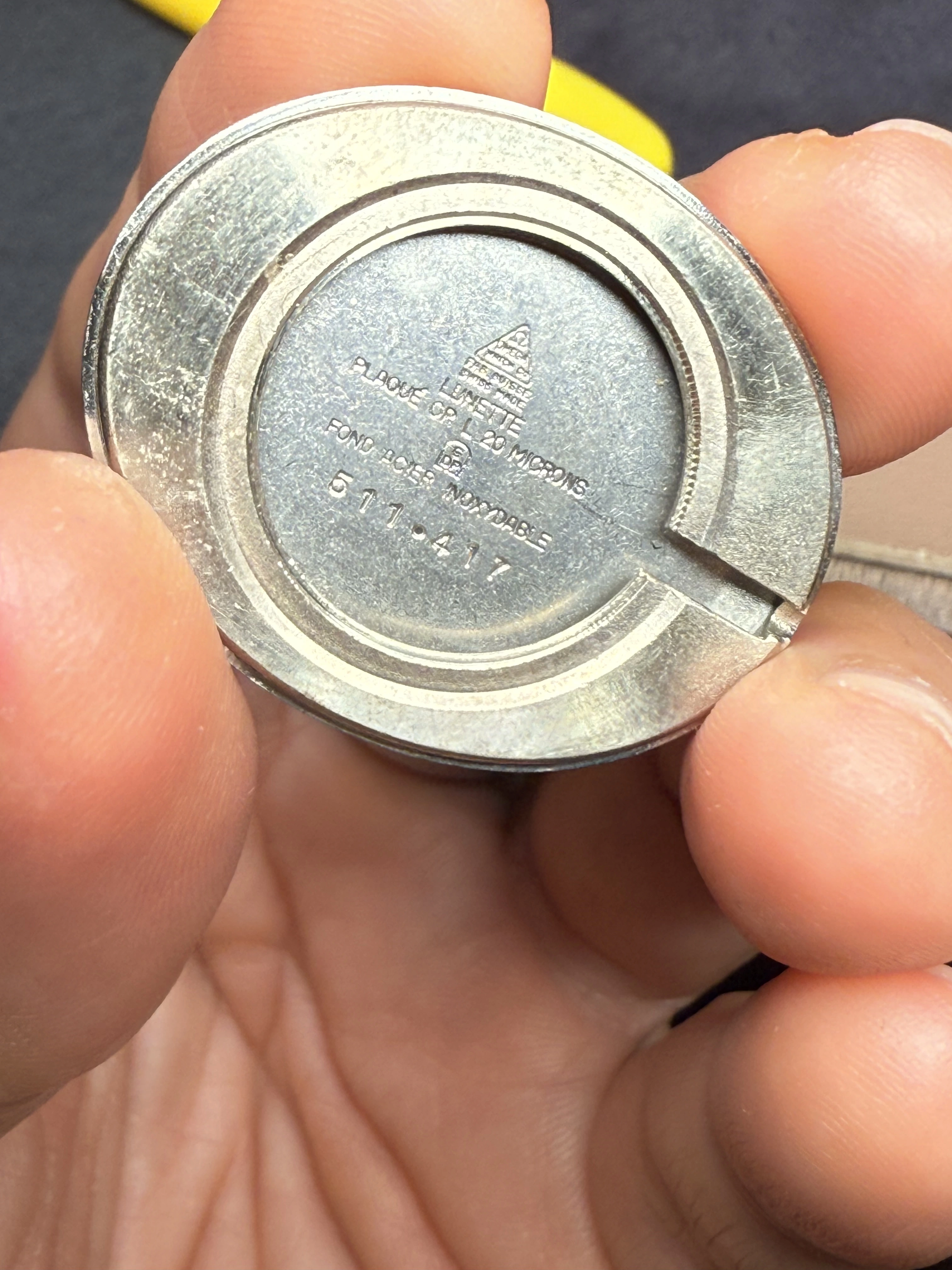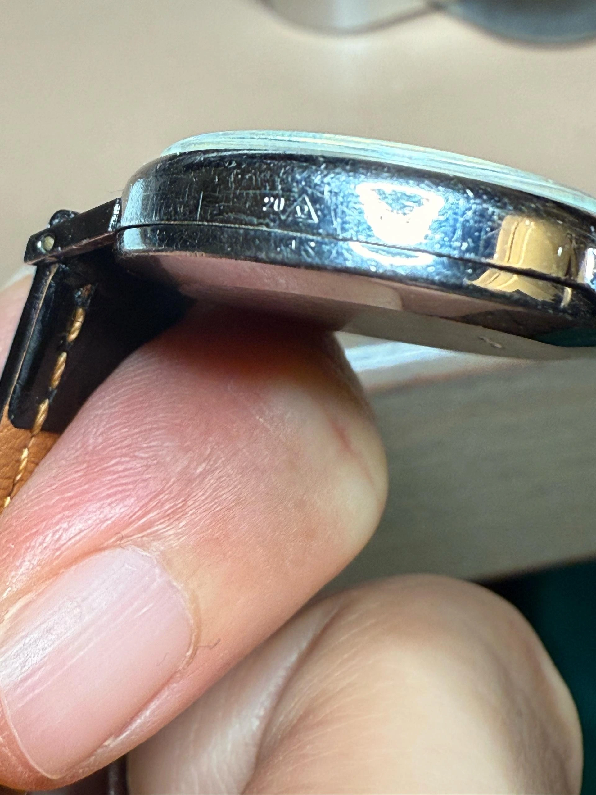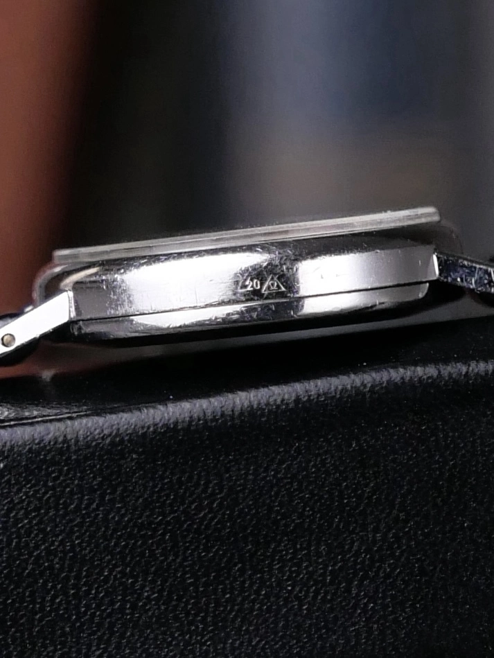 The inside of the caseback confirms that the caseback is steel (Fond Acier Inoxyable) and it also says “Lunette Plaque Or L 20 Microns” with a “tombstone” hallmark with what appears to be the letters “GDR”.