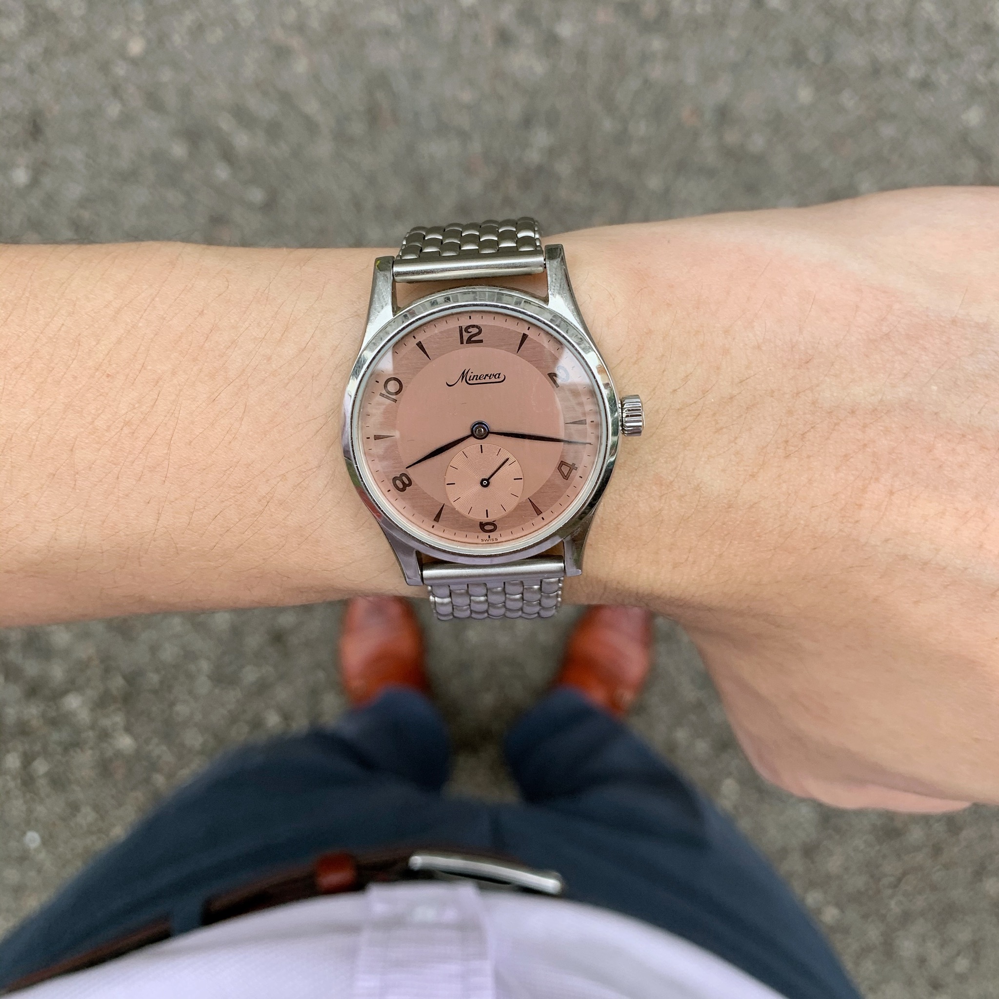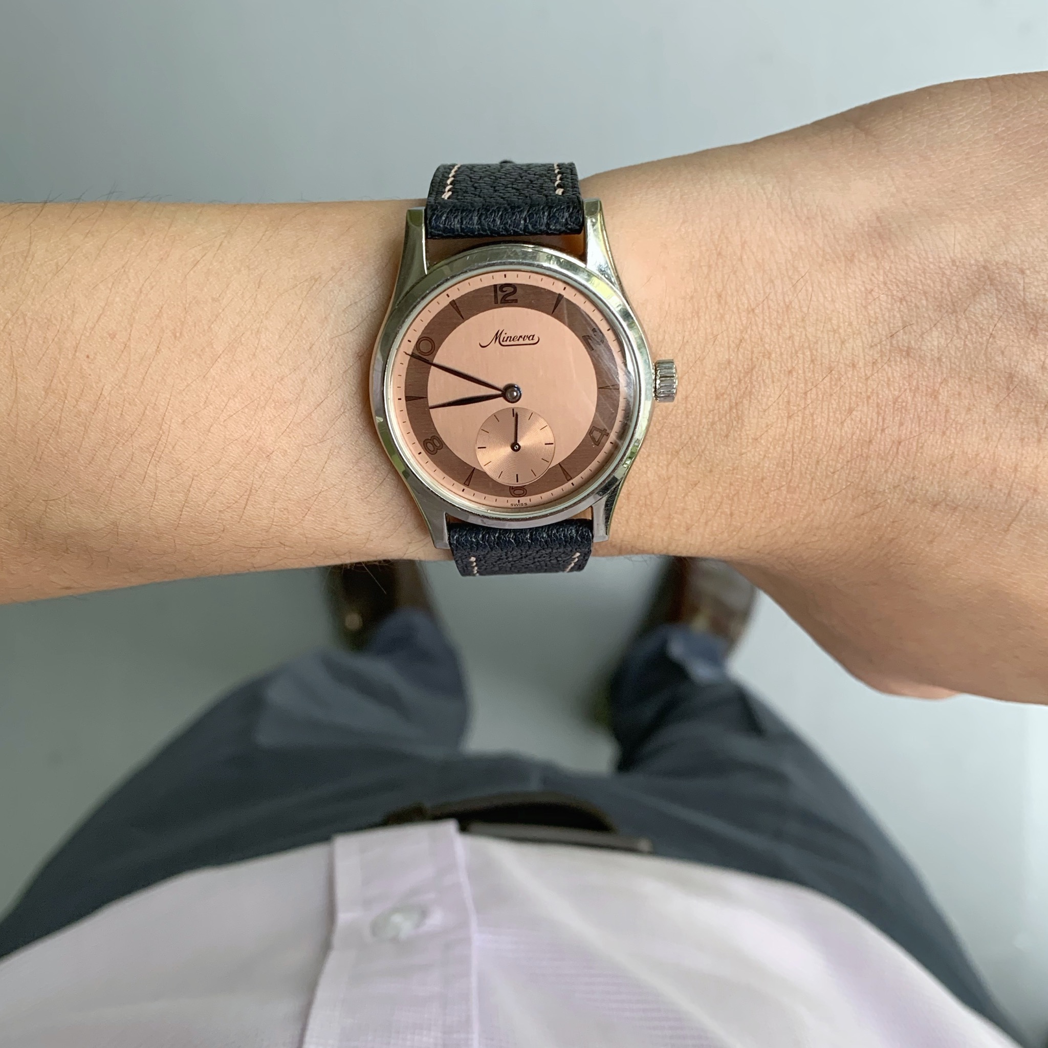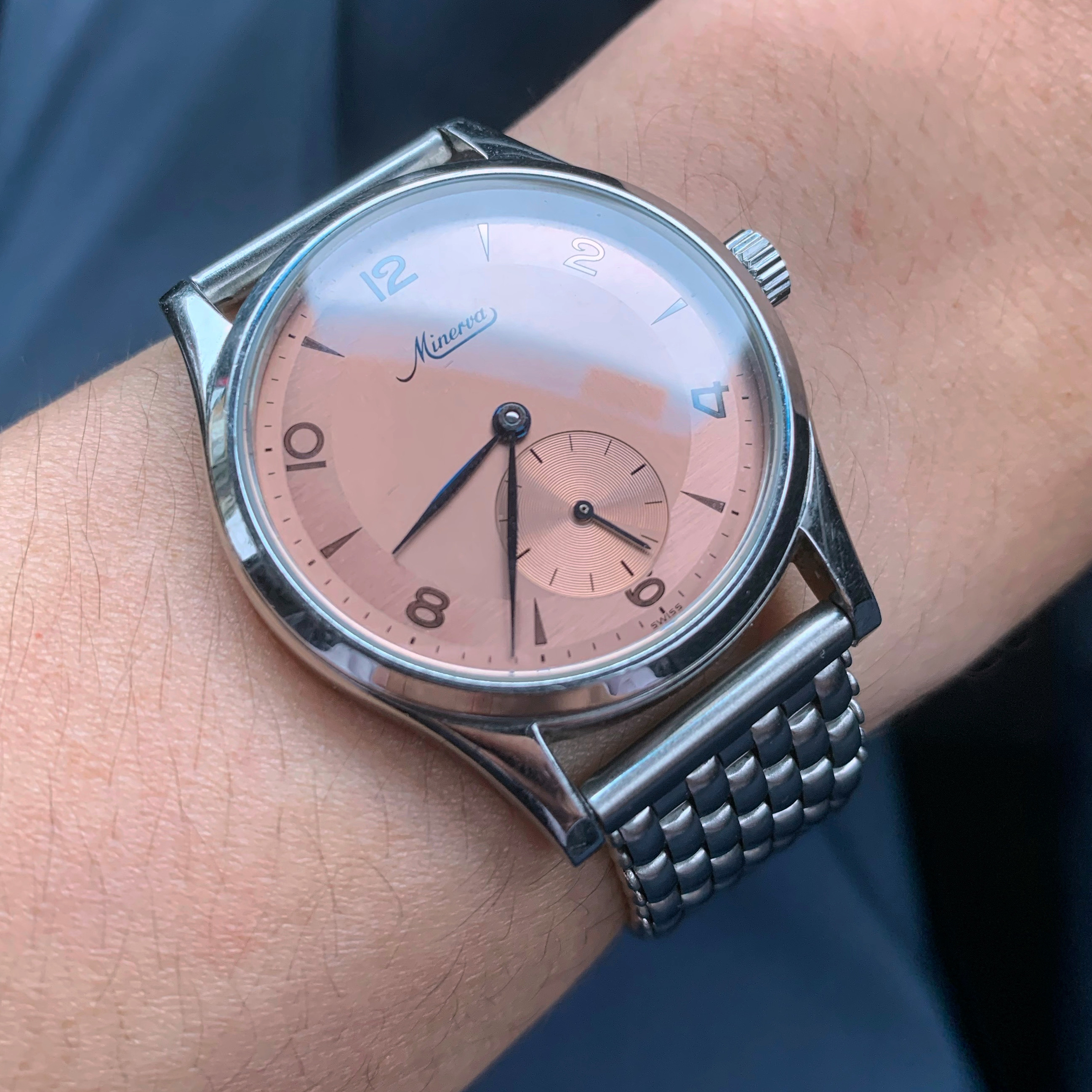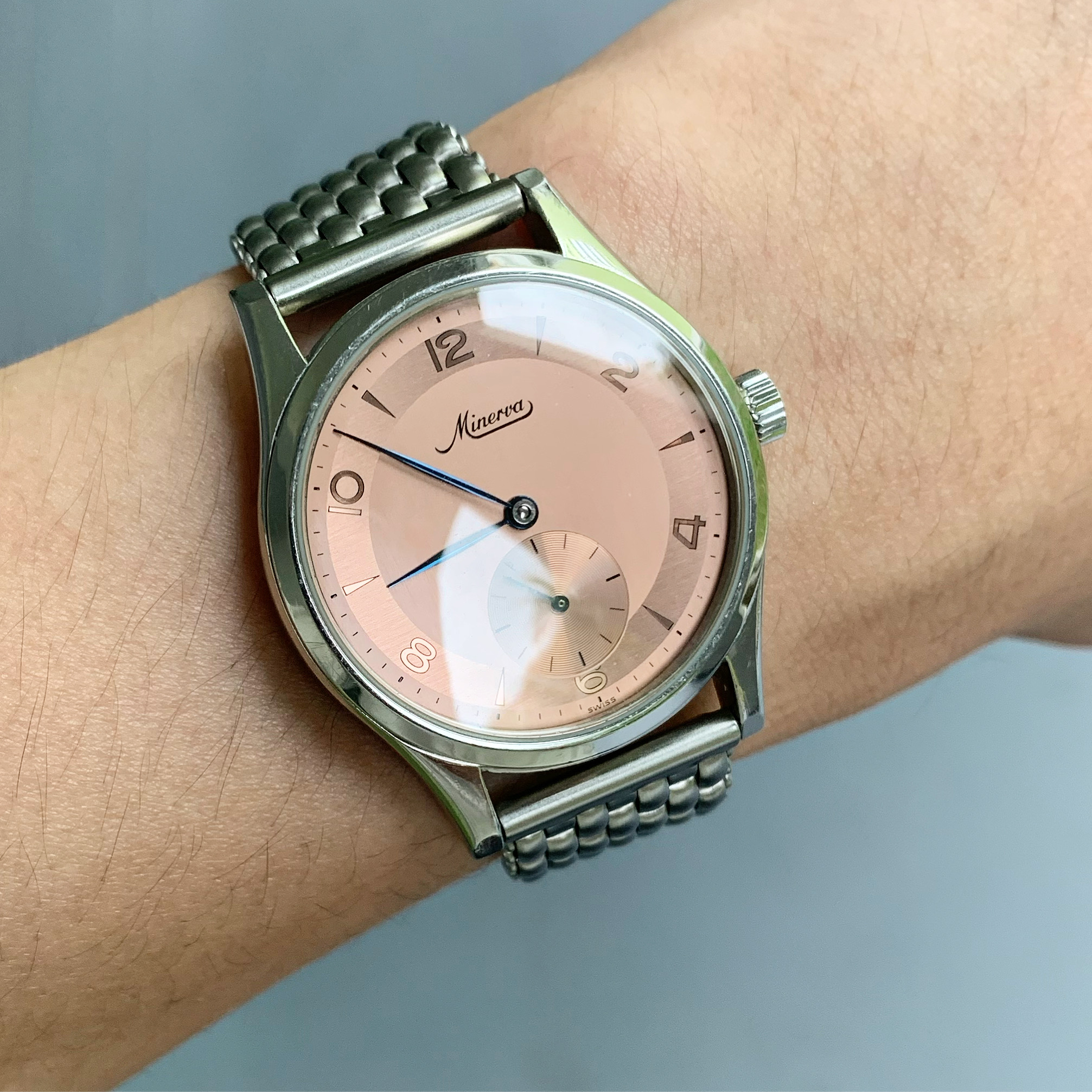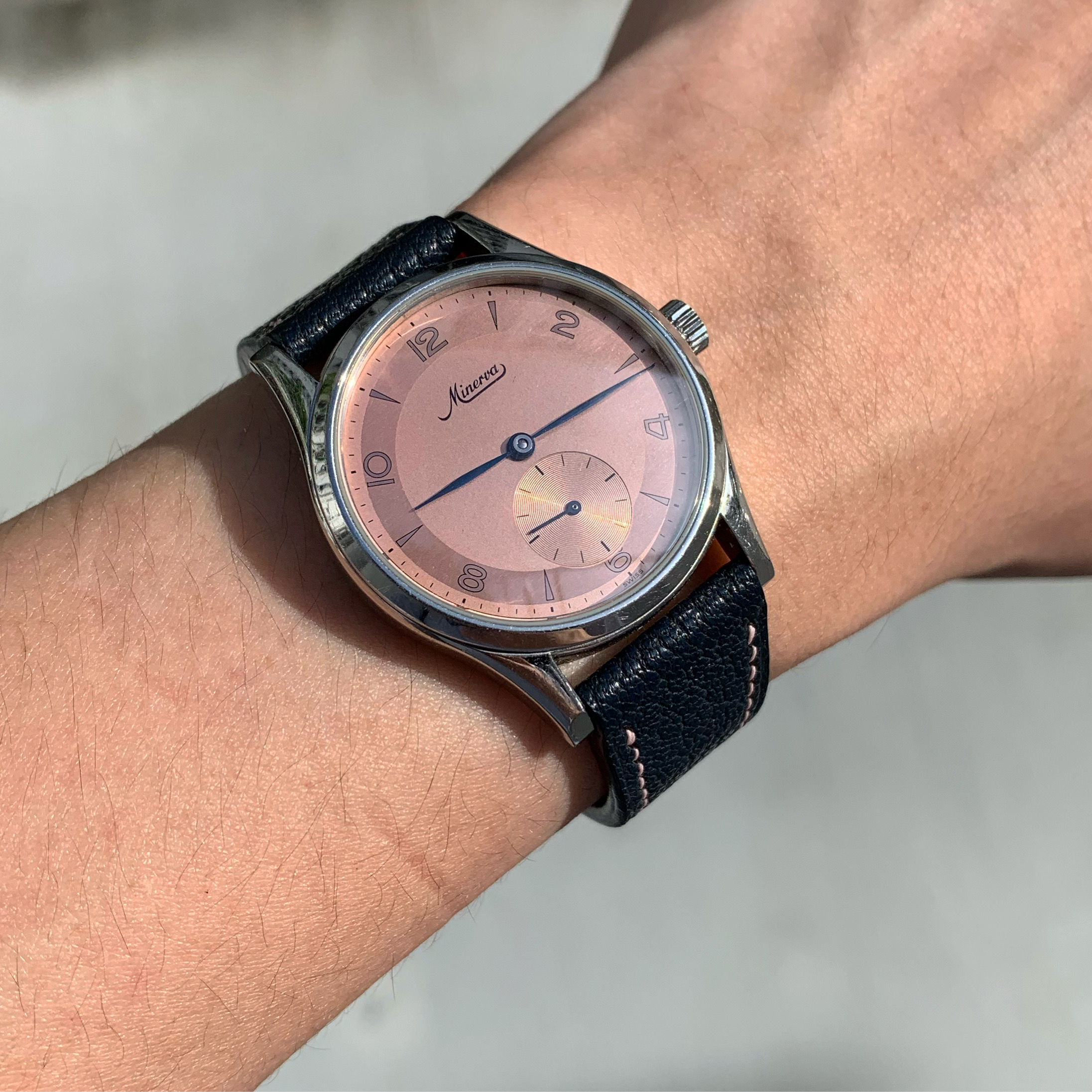 A salmon dial Minerva Pythagore for sale. This was released just before Minerva was taken over by Montblanc.