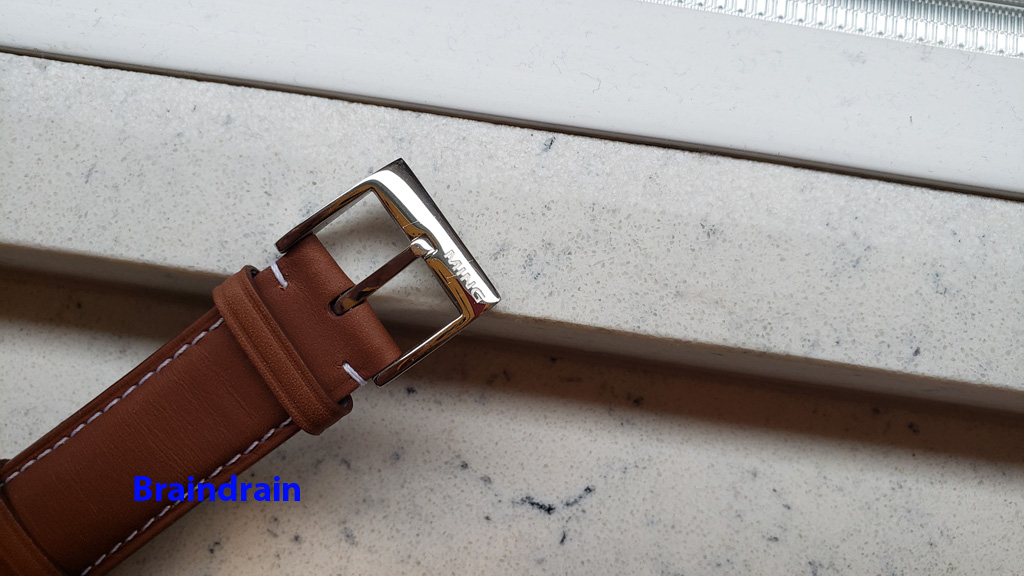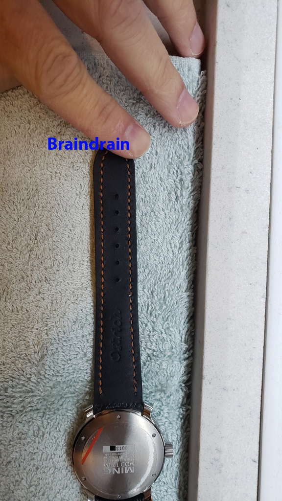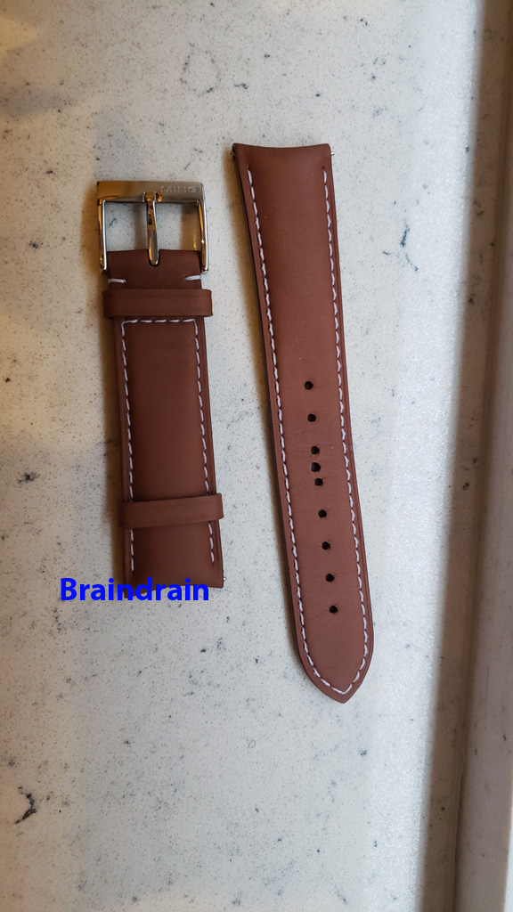 The watch comes with the OEM Jean Rousseau strap, as well as 2 more custom ostrich curved straps (nubuck/sueded black and nubuck/sueded blue). All of these straps are in like-new condition except the OEM strap had an extra hole punched in it. The original Ming buckle is also there.