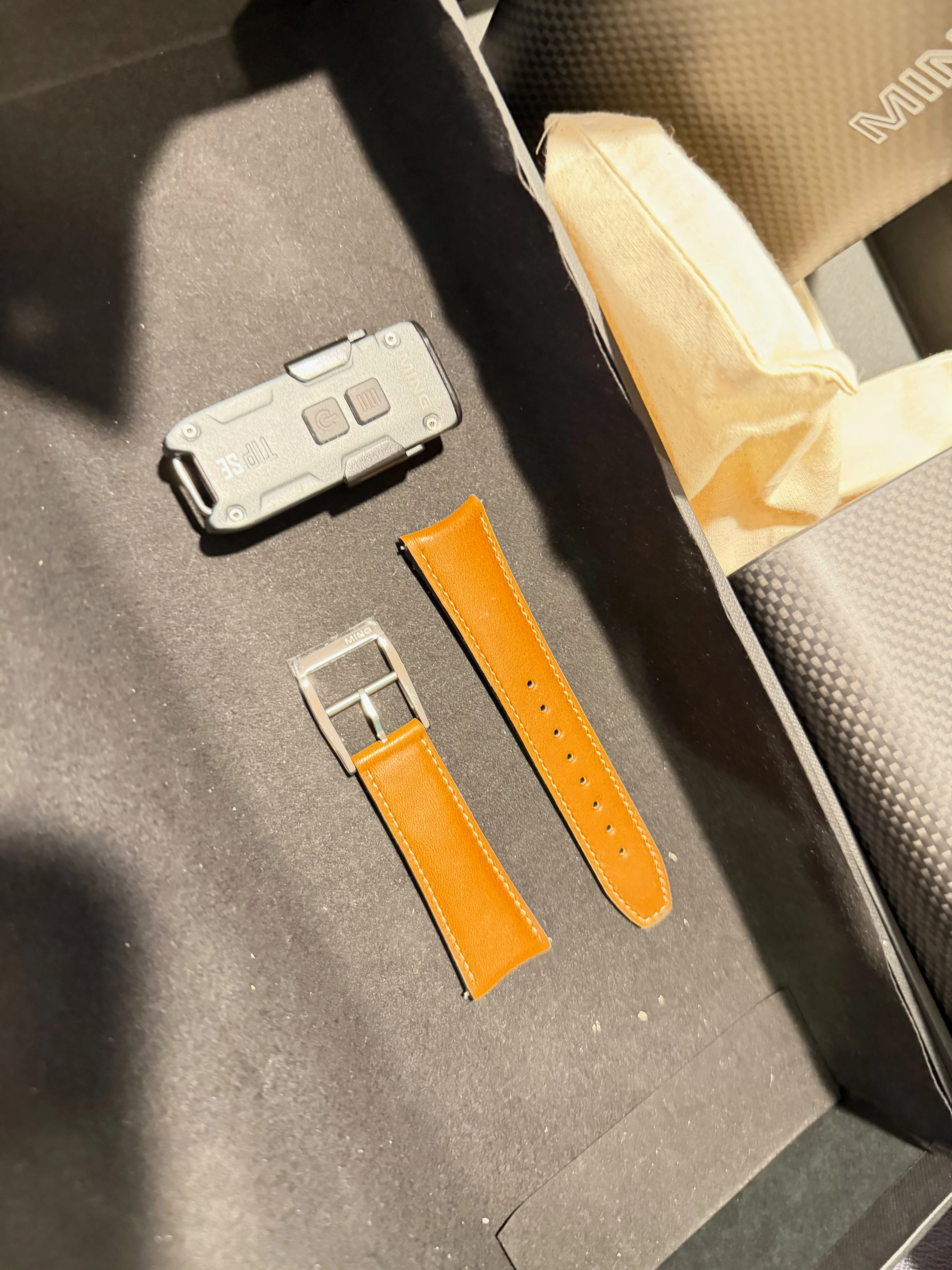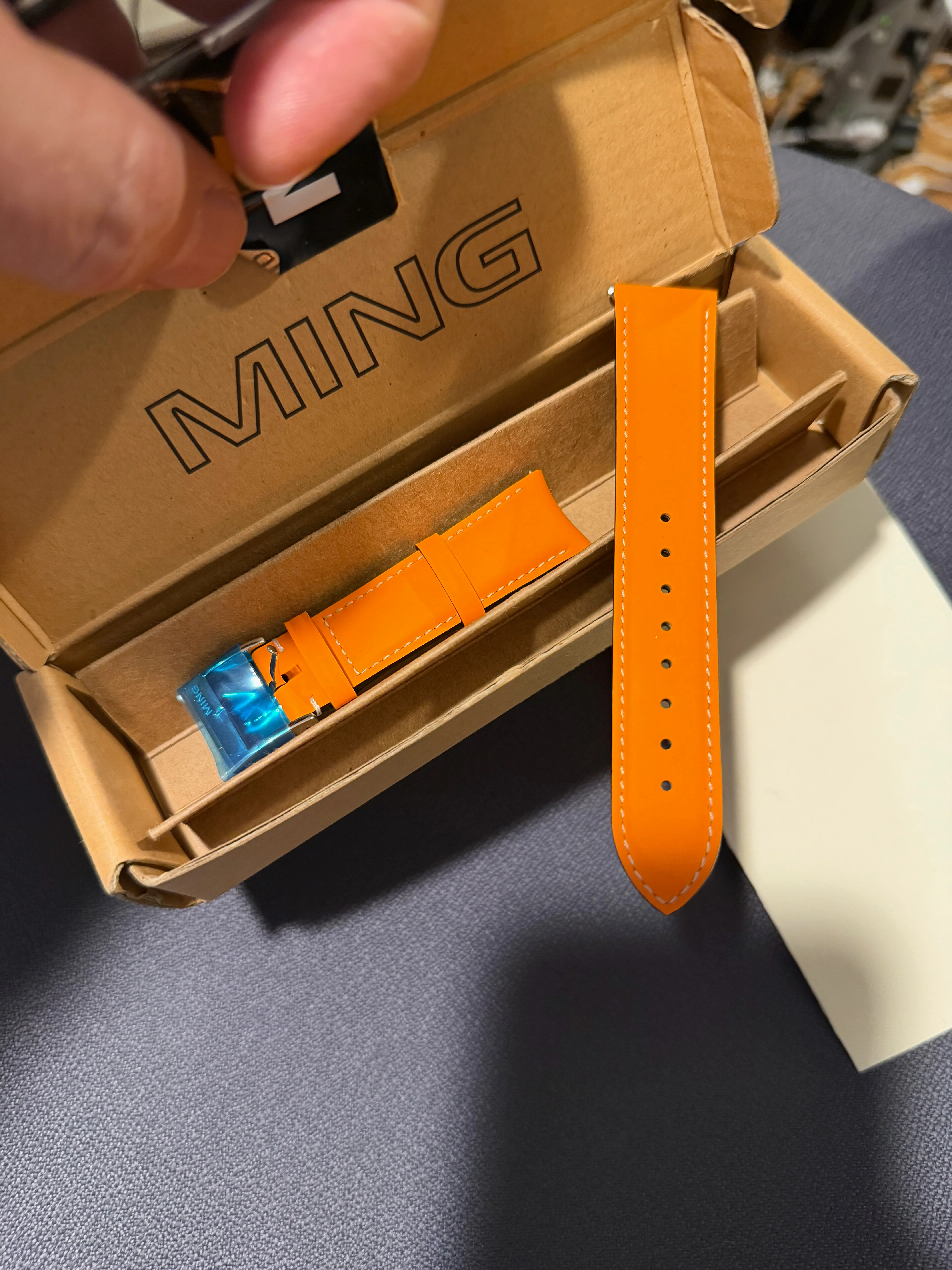 This watch is brand new in box and has never been worn. The plastic protection has never been removed. This is the whole kit, and I am also adding a Ming orange band. The stock photo here is just here for illustration of what it looks like unwrapped.