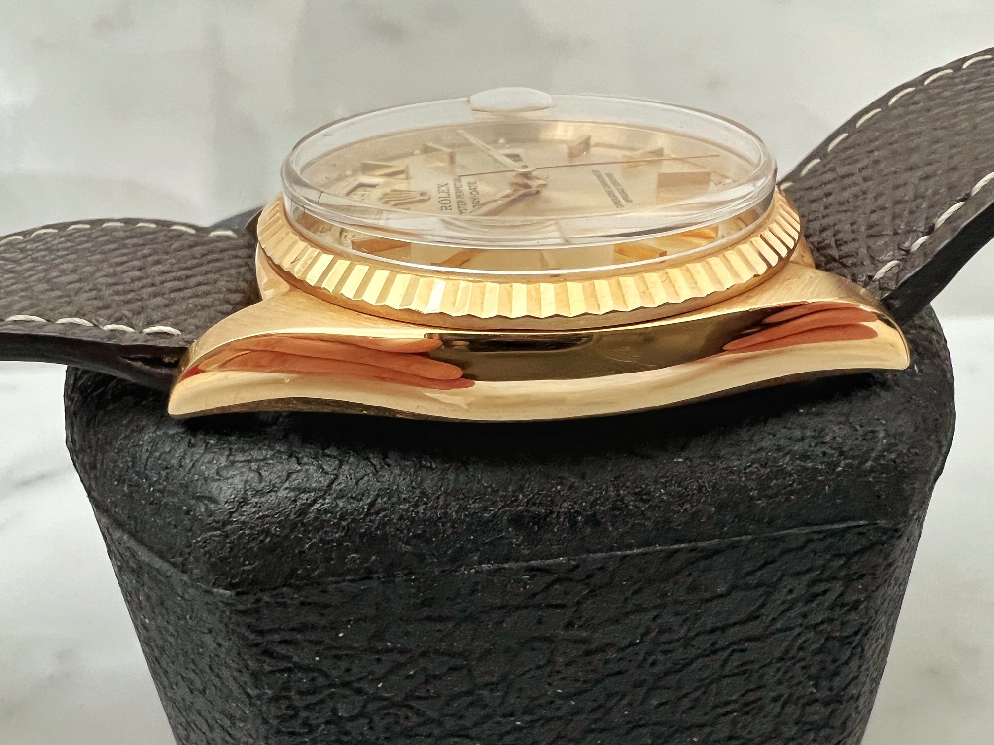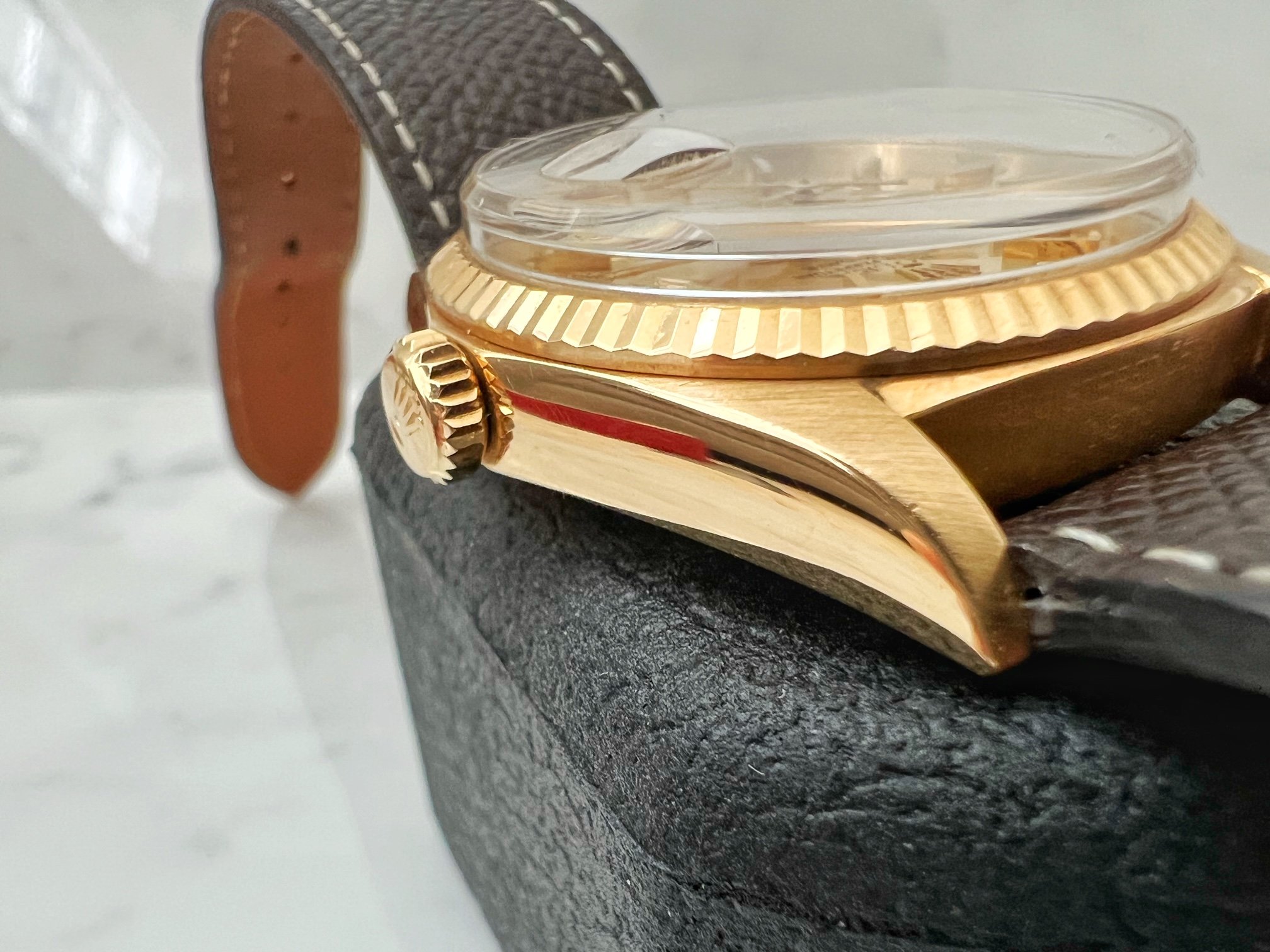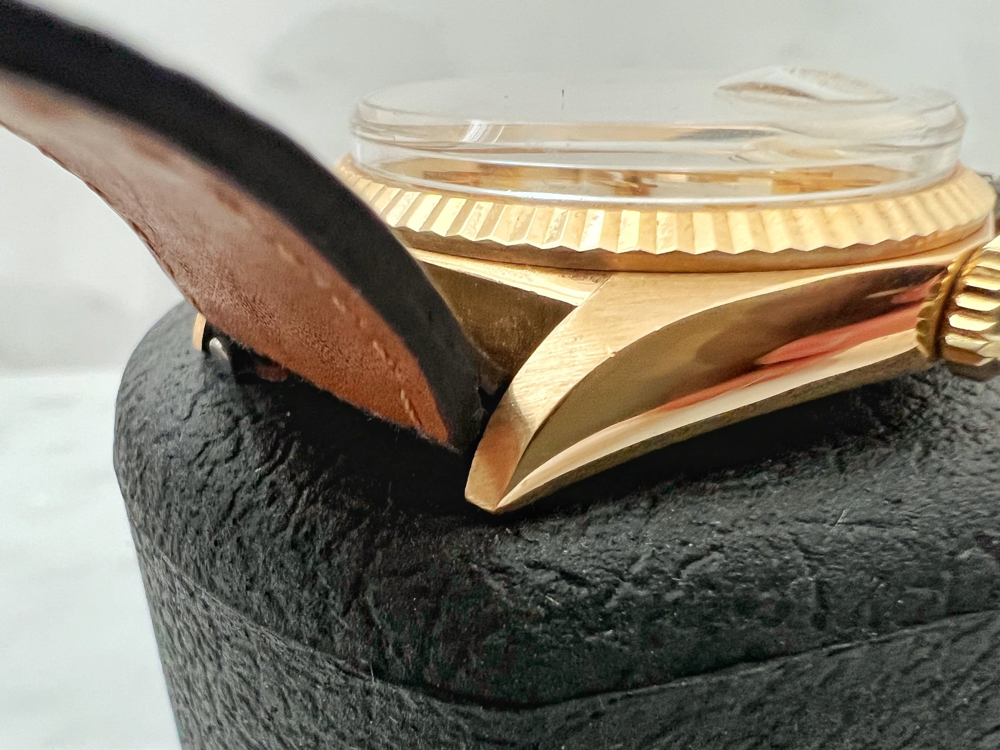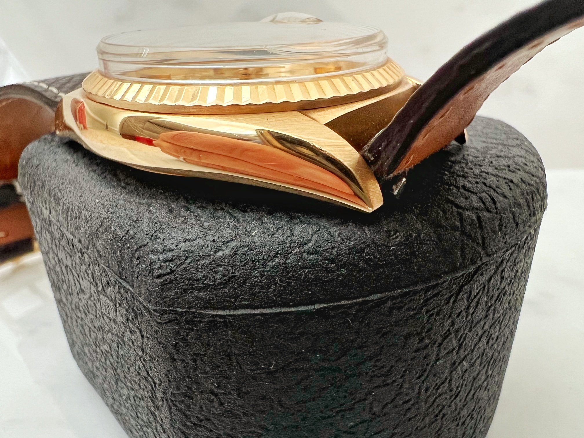 Day-Dates always seem to be over polished, and although I hate to use the term "unpolished," it is a very fat case. All hallmarks and stamps are extremely sharp. Watch comes on a Bulang and Sons calf skin band with an authentic Rolex gold plated buckle.