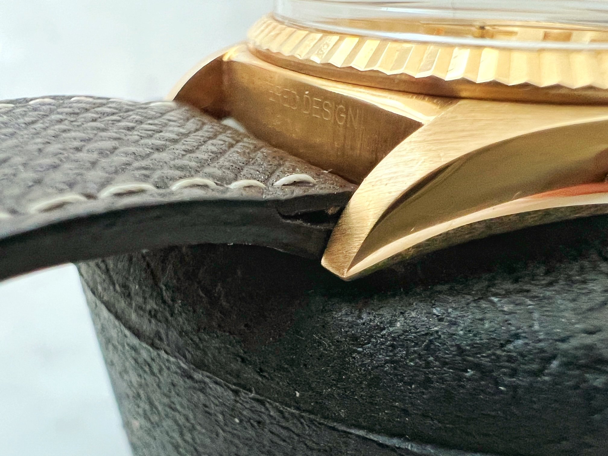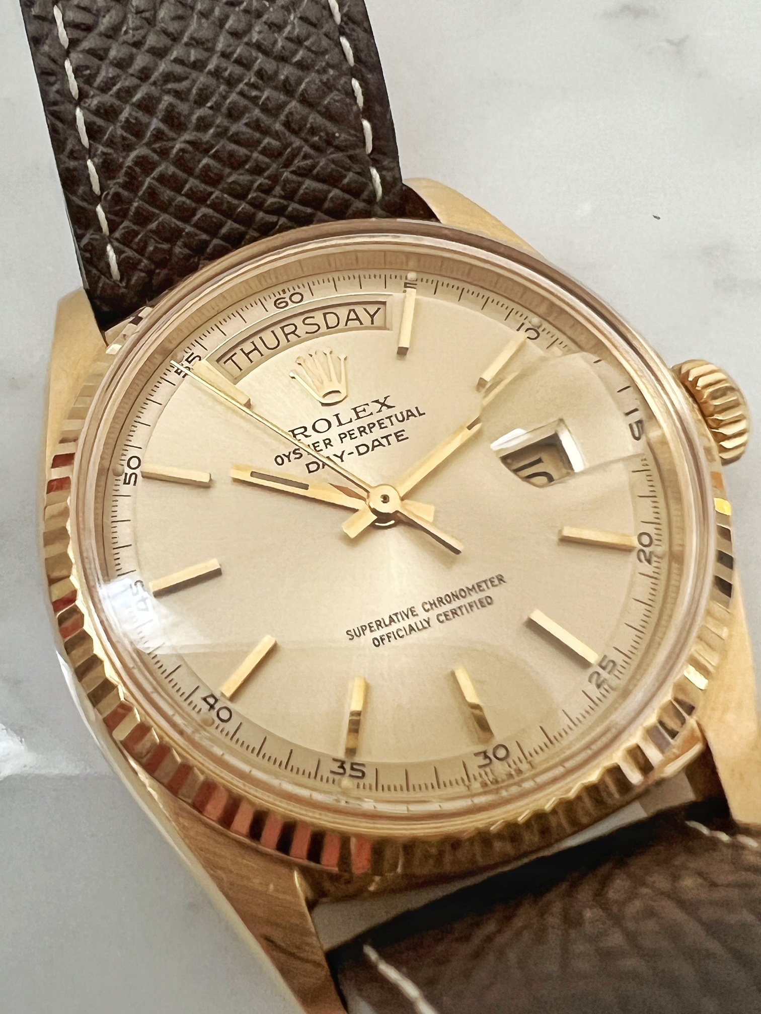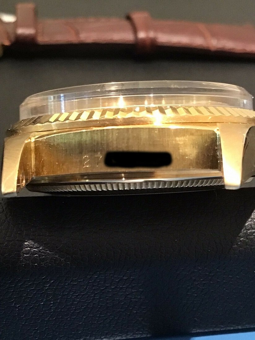Day-Dates always seem to be over polished, and although I hate to use the term "unpolished," it is a very fat case. All hallmarks and stamps are extremely sharp. Watch comes on a Bulang and Sons calf skin band with an authentic Rolex gold plated buckle.