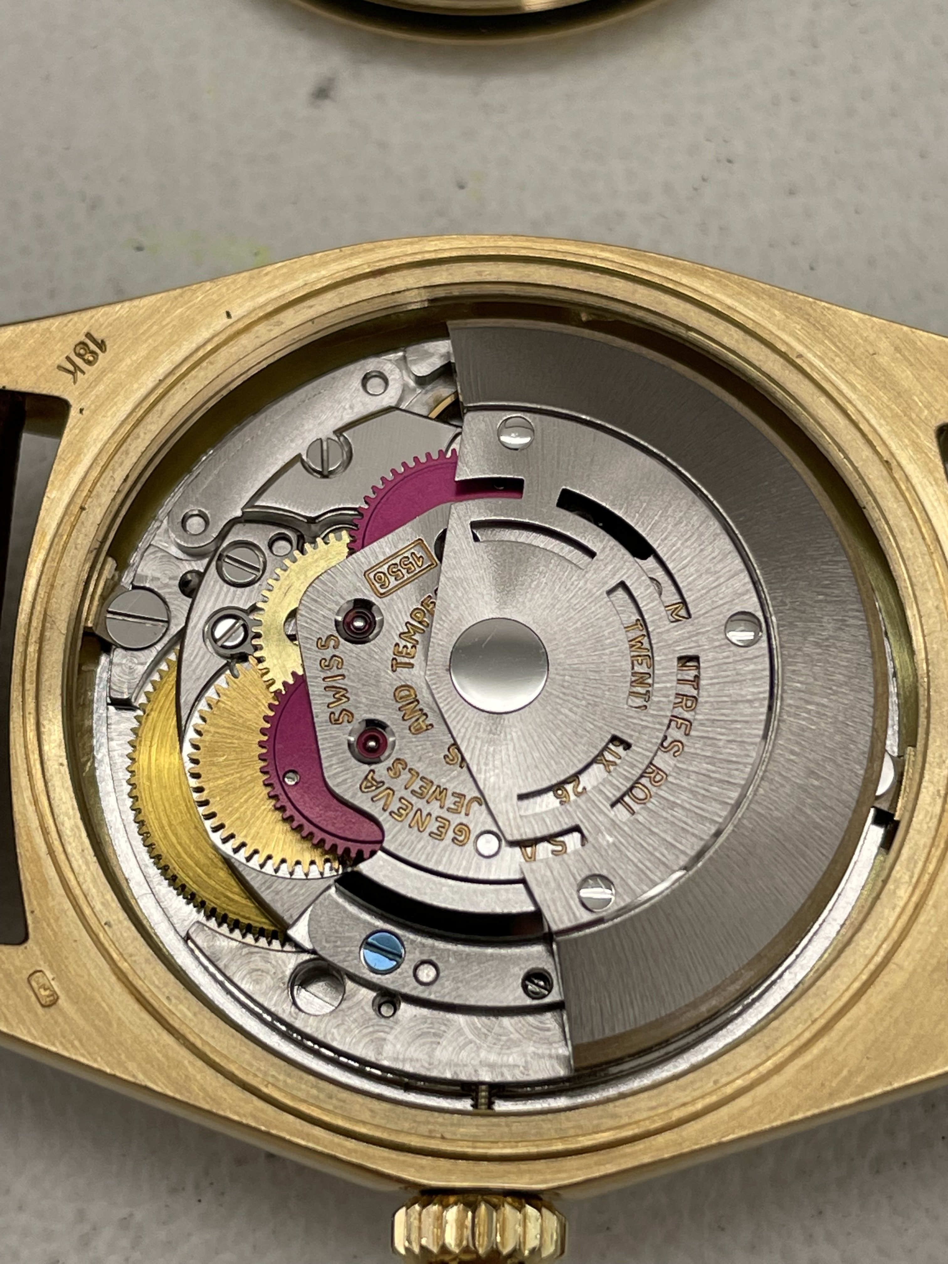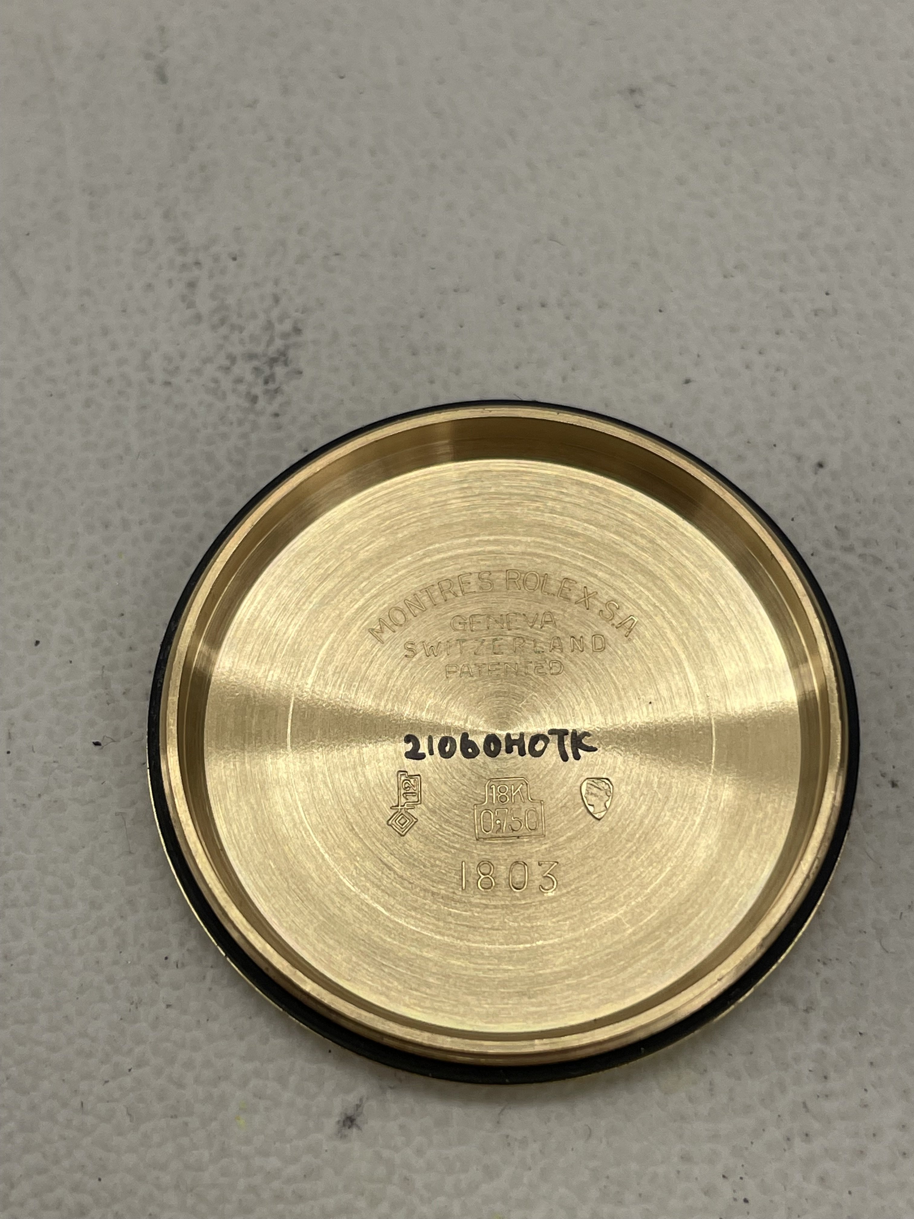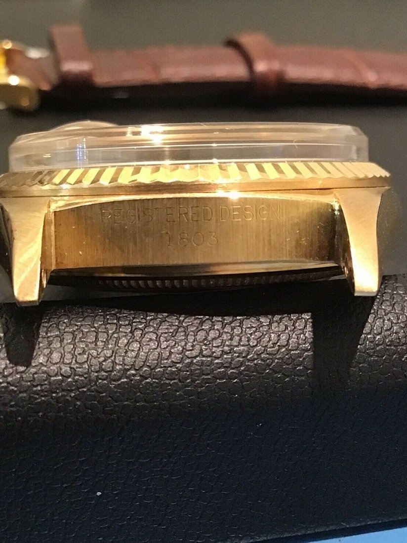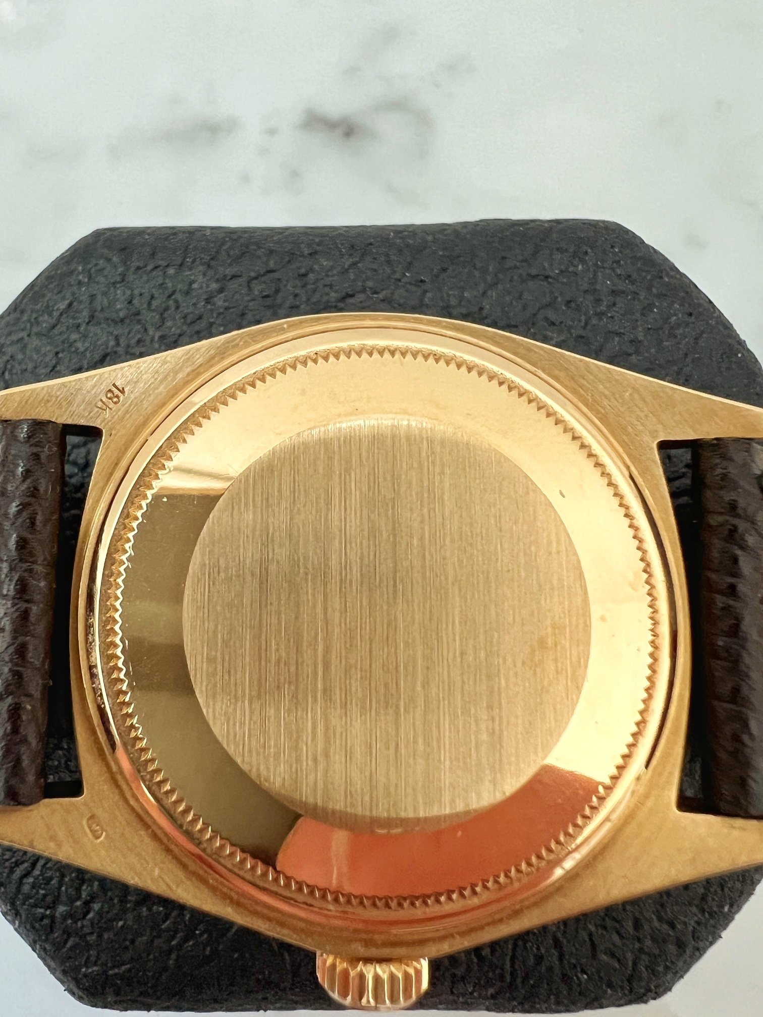 Day-Dates always seem to be over polished, and although I hate to use the term "unpolished," it is a very fat case. All hallmarks and stamps are extremely sharp. Watch comes on a Bulang and Sons calf skin band with an authentic Rolex gold plated buckle.