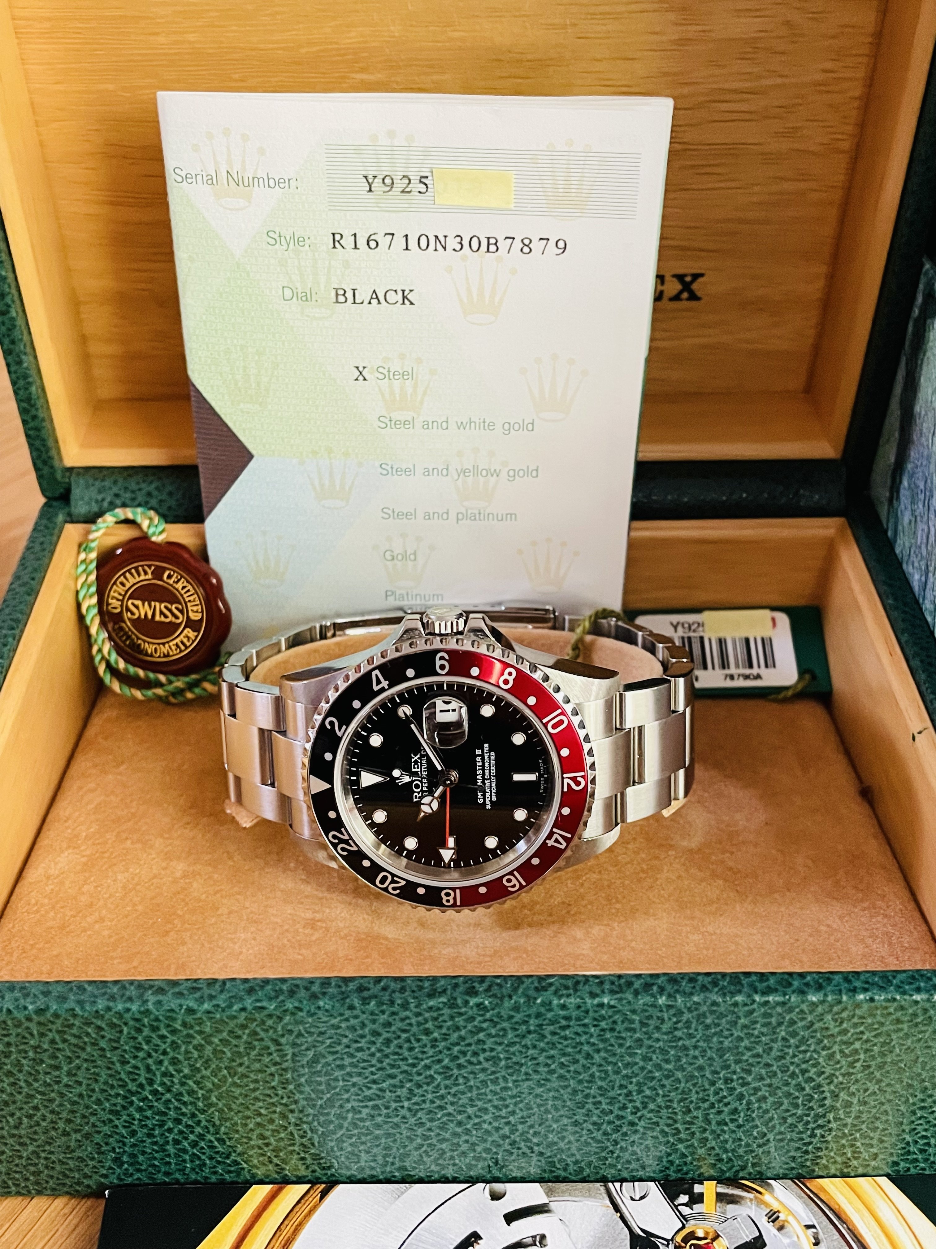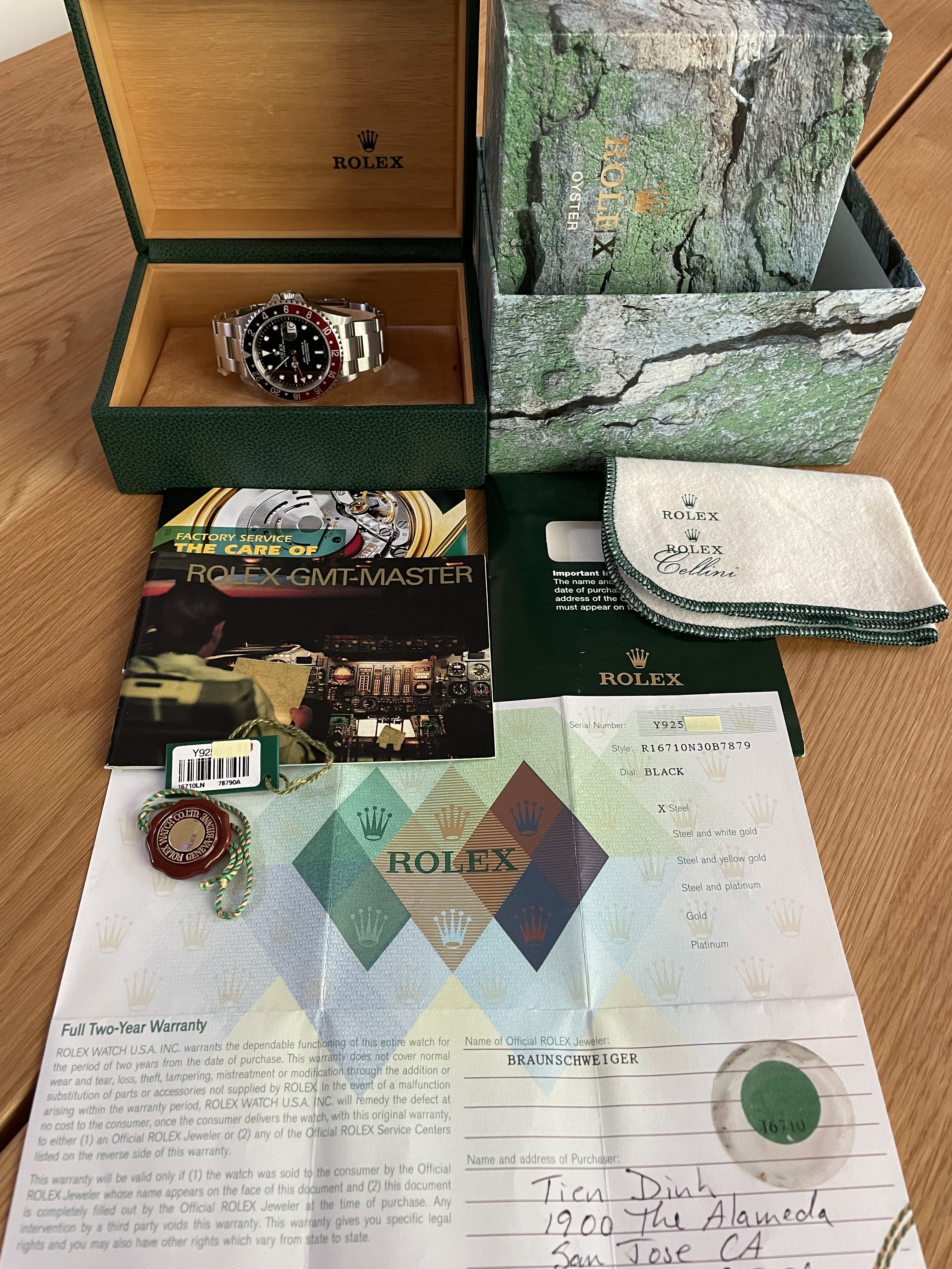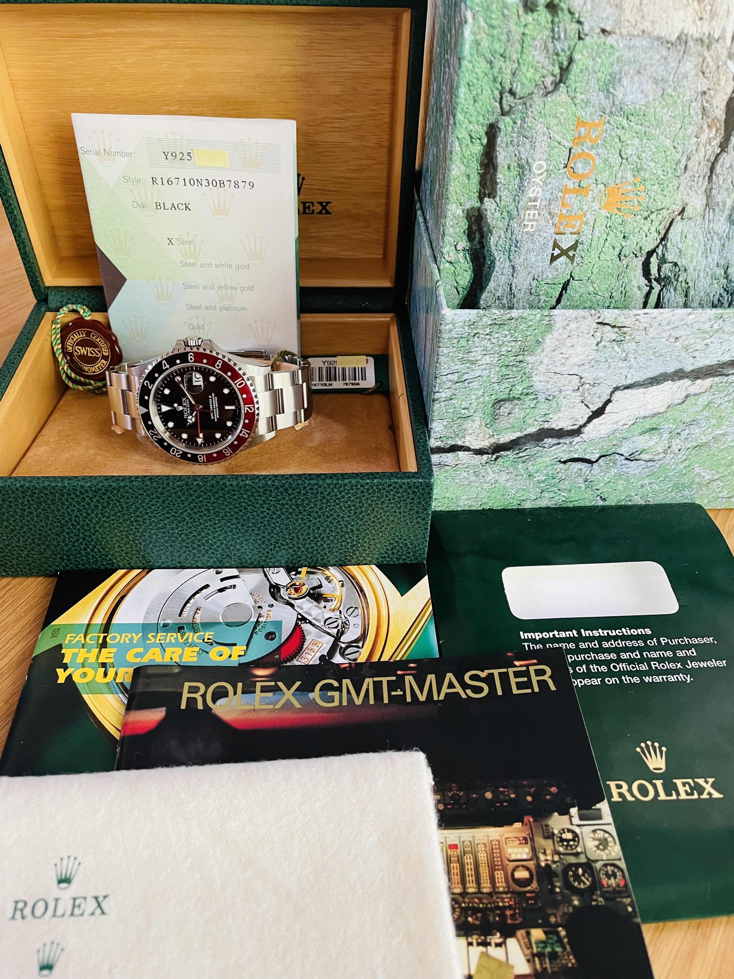 ·Dear friends -- For sale, from my personal collection an absolutely gorgeous Rolex 16710 GMT Full Kit. What sets this full set apart is it's amazing condition with full compliment of accessories. The case is flawless with beautiful chamfers and factory brushed steel on lugs still in tact. No blemishes on the crystal and the bracelet is practically brand new with no visible blemishes or stretch. The watch winds smoothly and keeps good time but has not been serviced during my ownership.