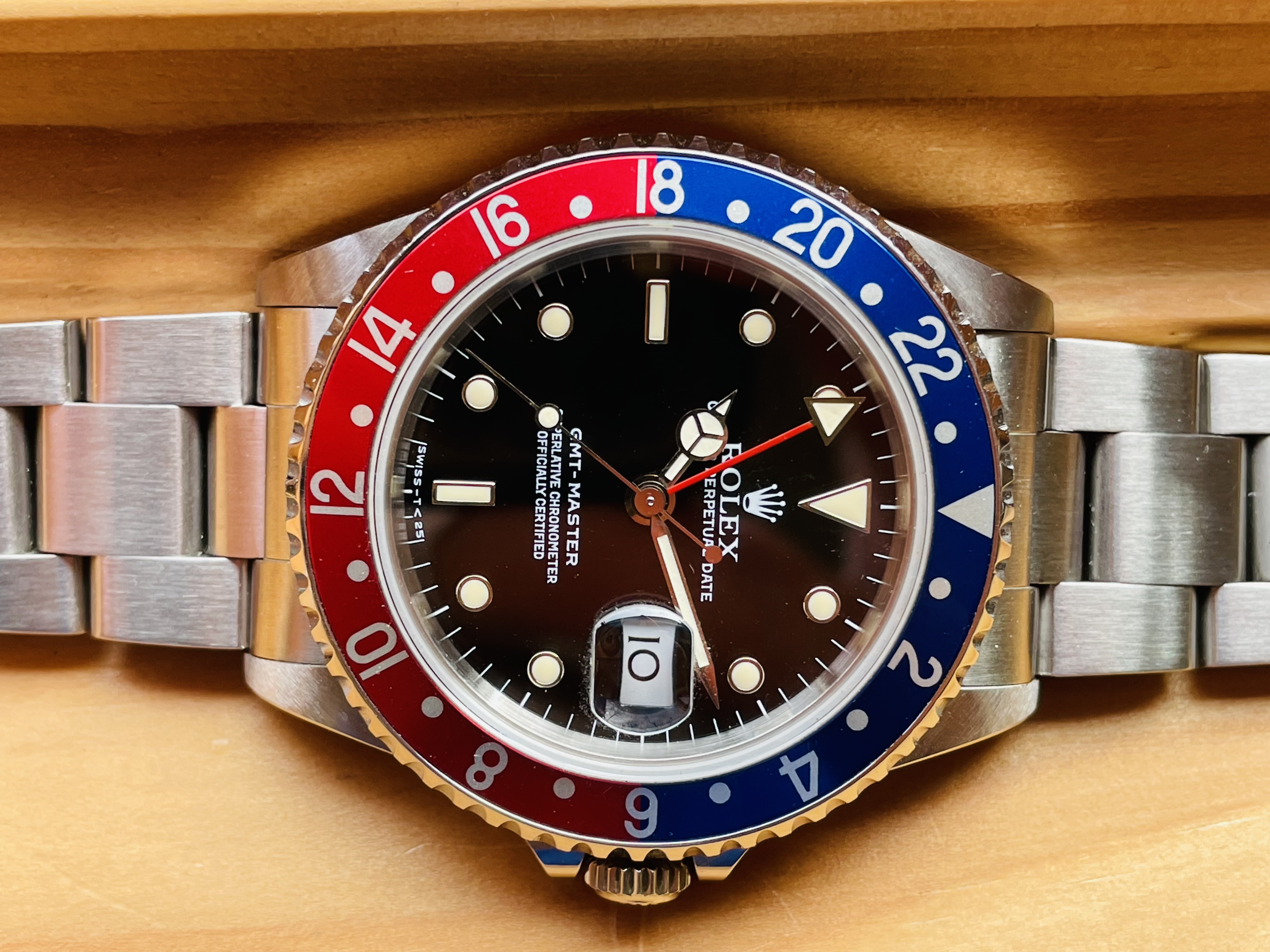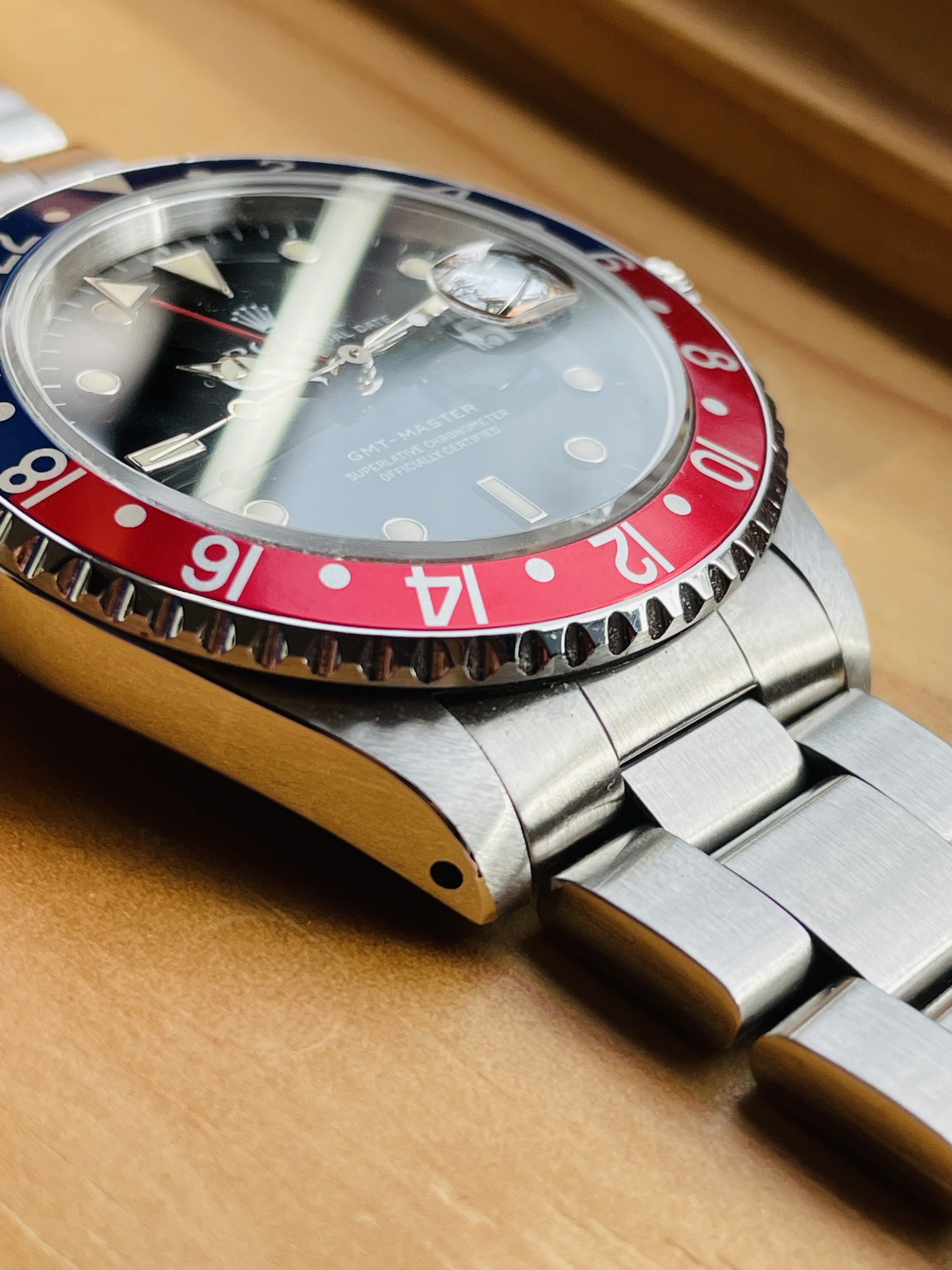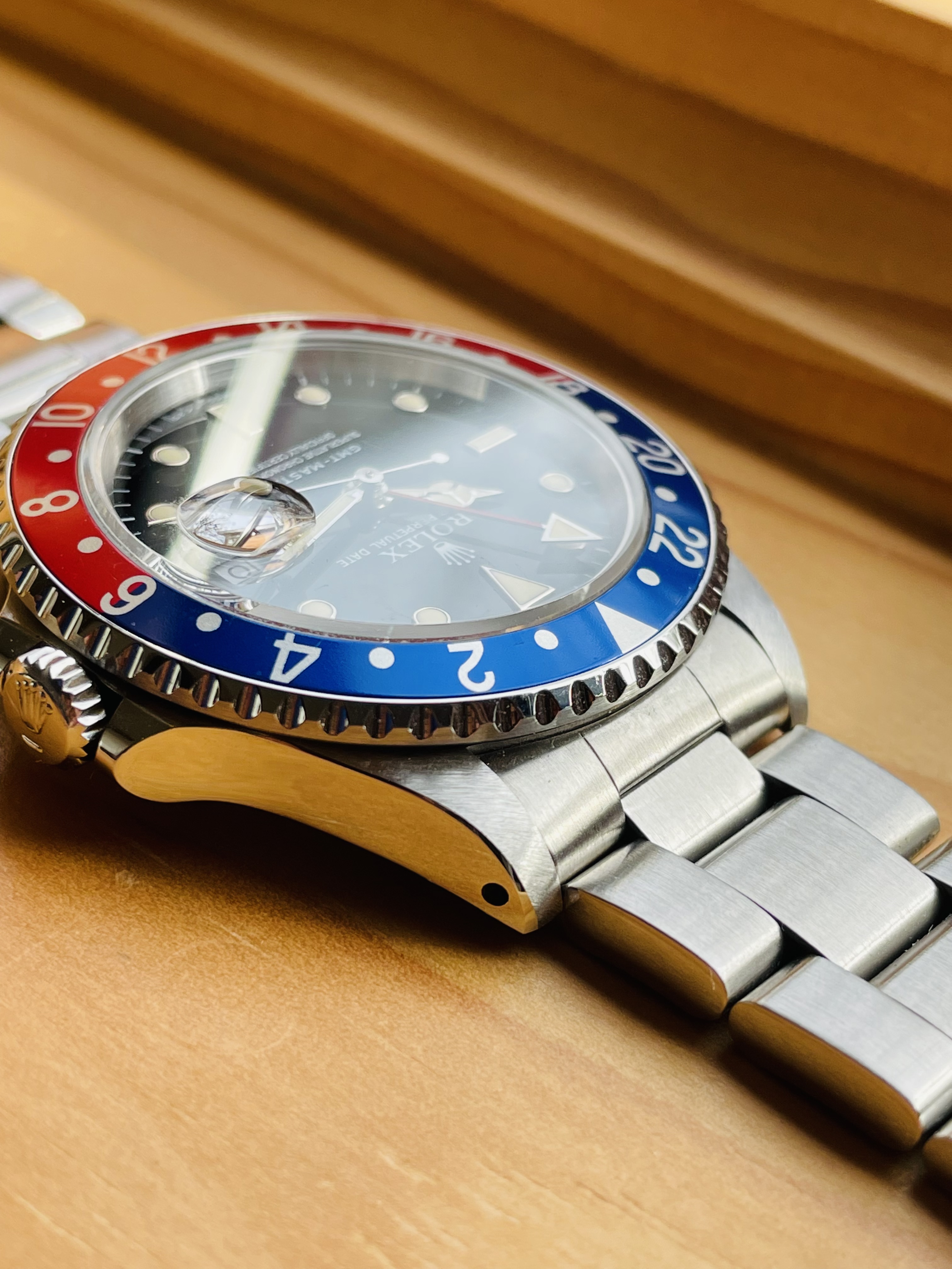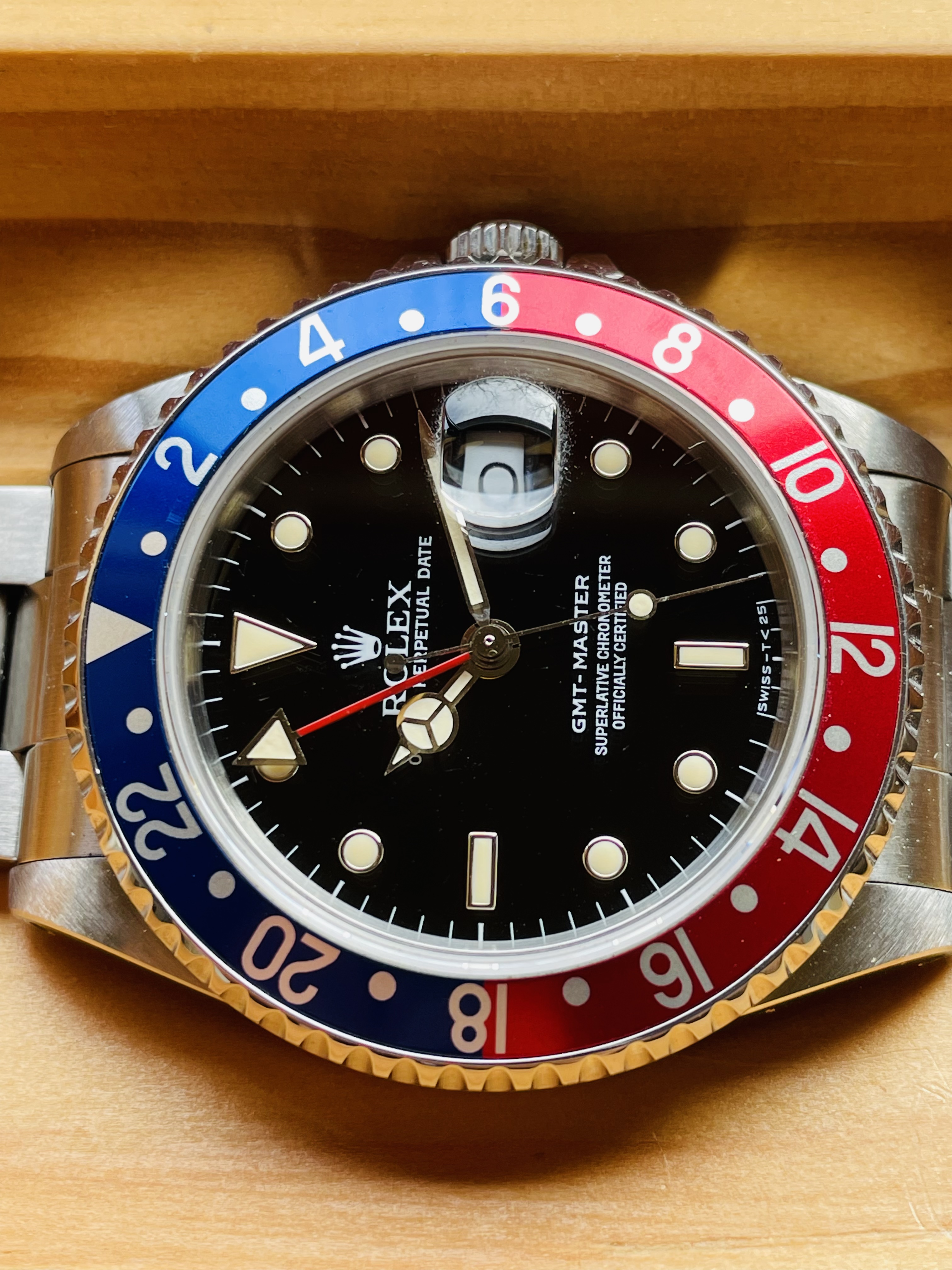 ·Dear OF: for sale, from my personal collection a stunningly beautiful 1991 Rolex GMT 16700 Full Set Pepsi. The watch is flawless with gorgeous patina on the hour markers as well as matching hands. The case is very strong with factory spec brushed finish on top of the lugs and 'no cratering' around the lug holes. Mechanically, it winds smoothly and keeps good time, it has not been serviced during my ownership. The Pepsi bezel insert is practically brand new without any blemishes or scratches. The 78360 bracelet comes with period correct clasp code (P8) and 501 endlinks which are in excellent condition.