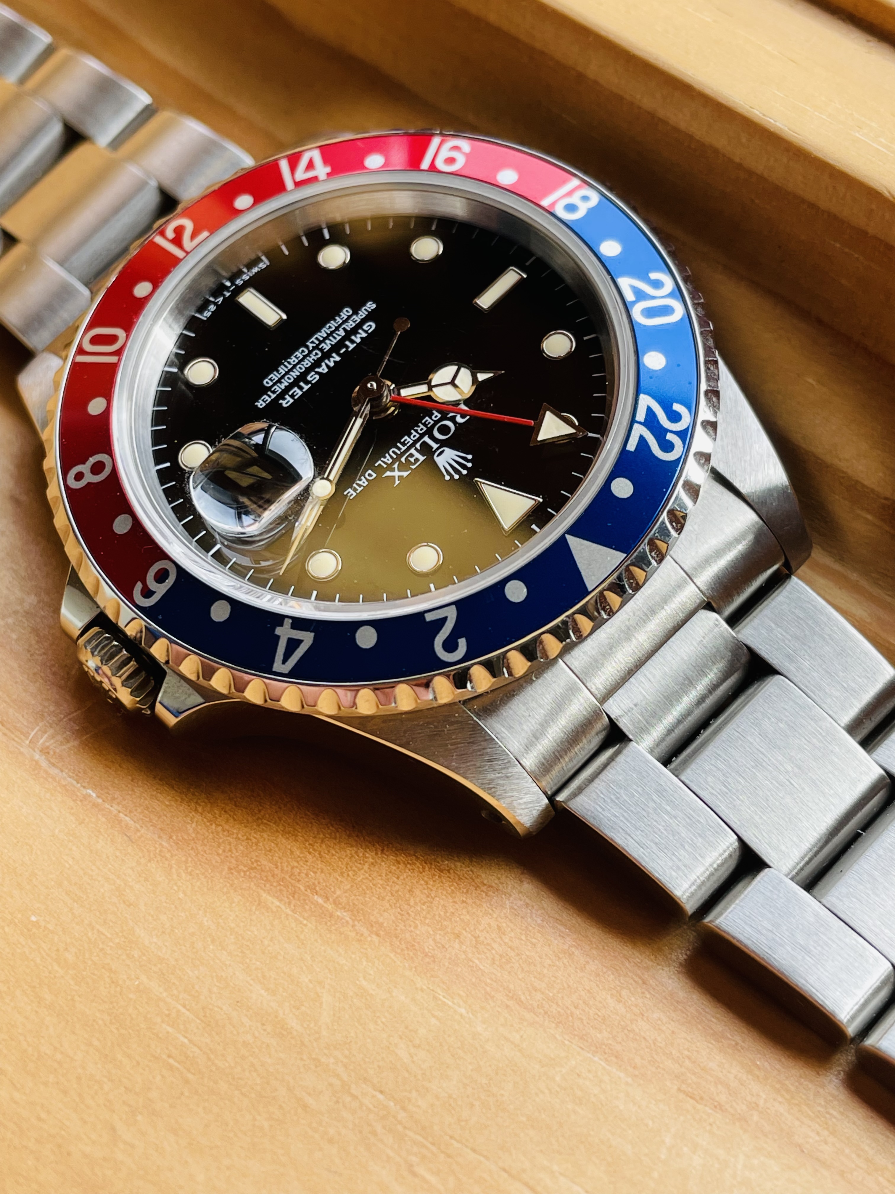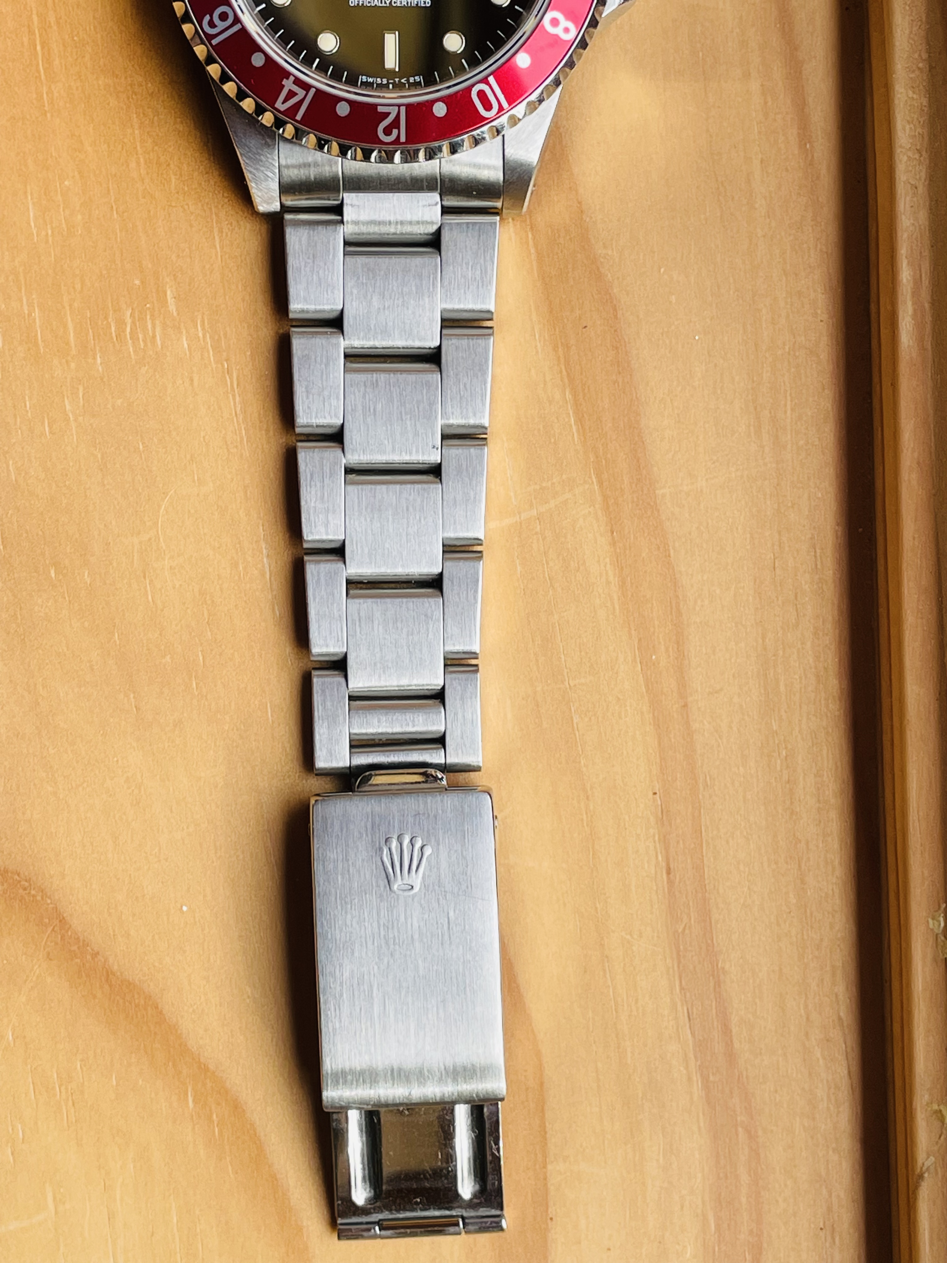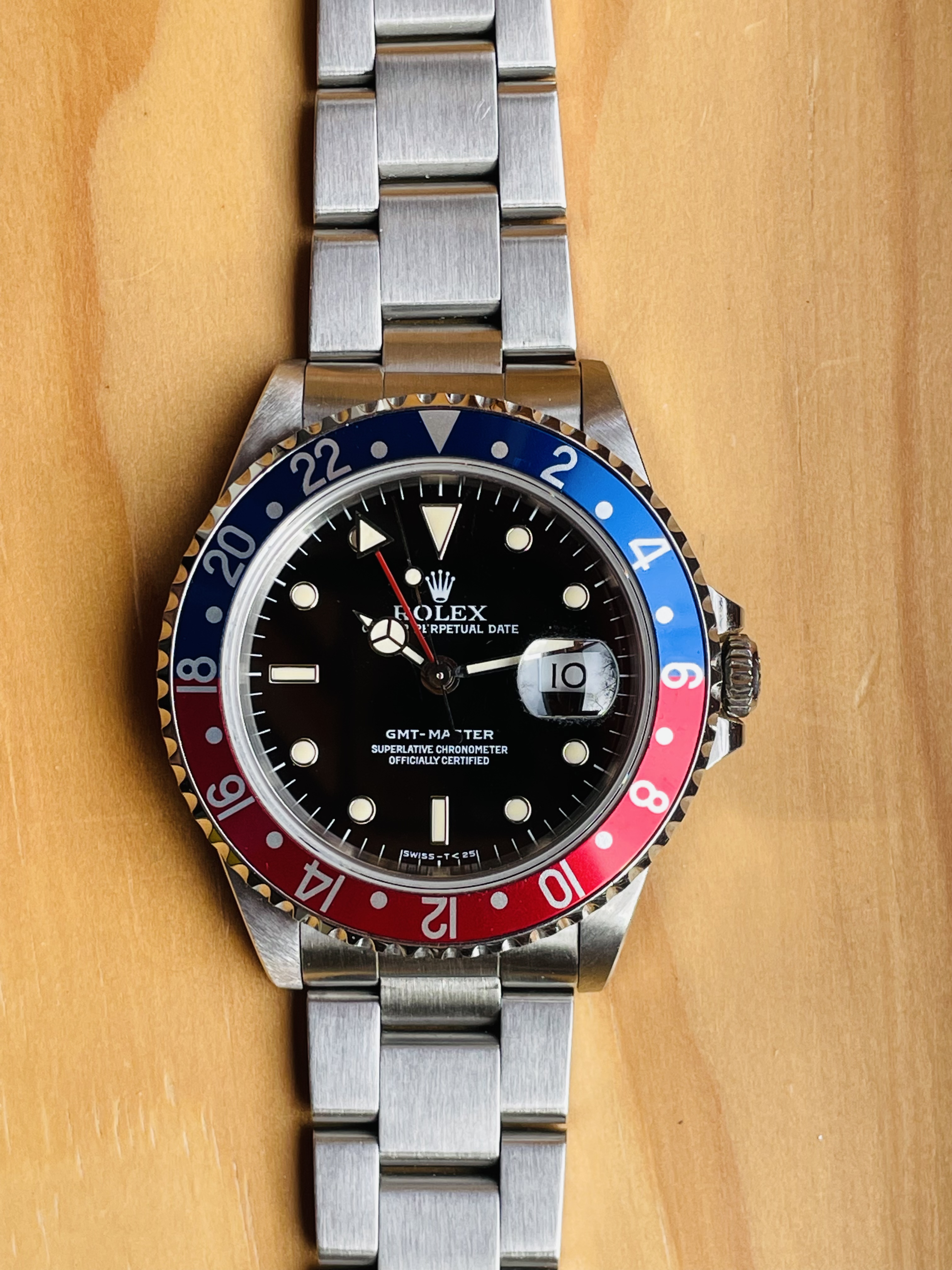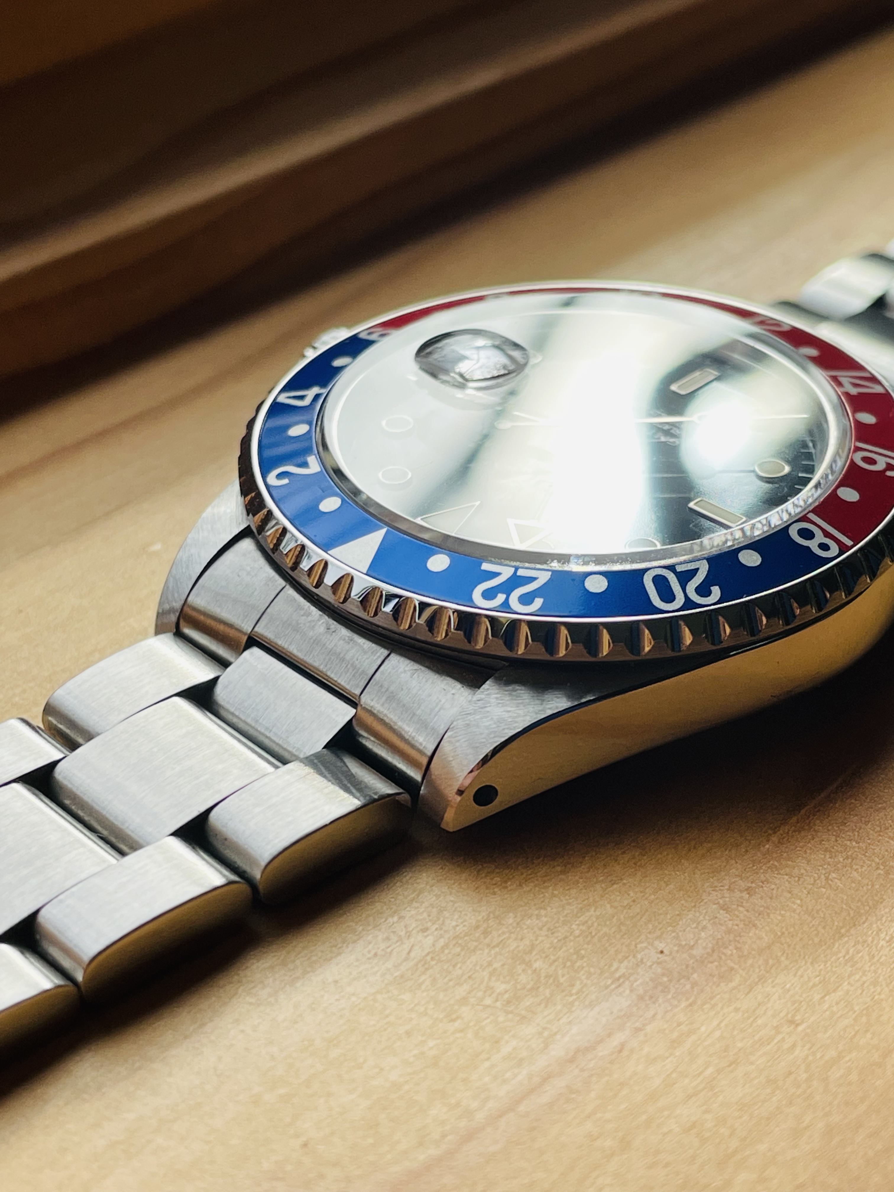 ·Dear OF: for sale, from my personal collection a stunningly beautiful 1991 Rolex GMT 16700 Full Set Pepsi. The watch is flawless with gorgeous patina on the hour markers as well as matching hands. The case is very strong with factory spec brushed finish on top of the lugs and 'no cratering' around the lug holes. Mechanically, it winds smoothly and keeps good time, it has not been serviced during my ownership. The Pepsi bezel insert is practically brand new without any blemishes or scratches. The 78360 bracelet comes with period correct clasp code (P8) and 501 endlinks which are in excellent condition.