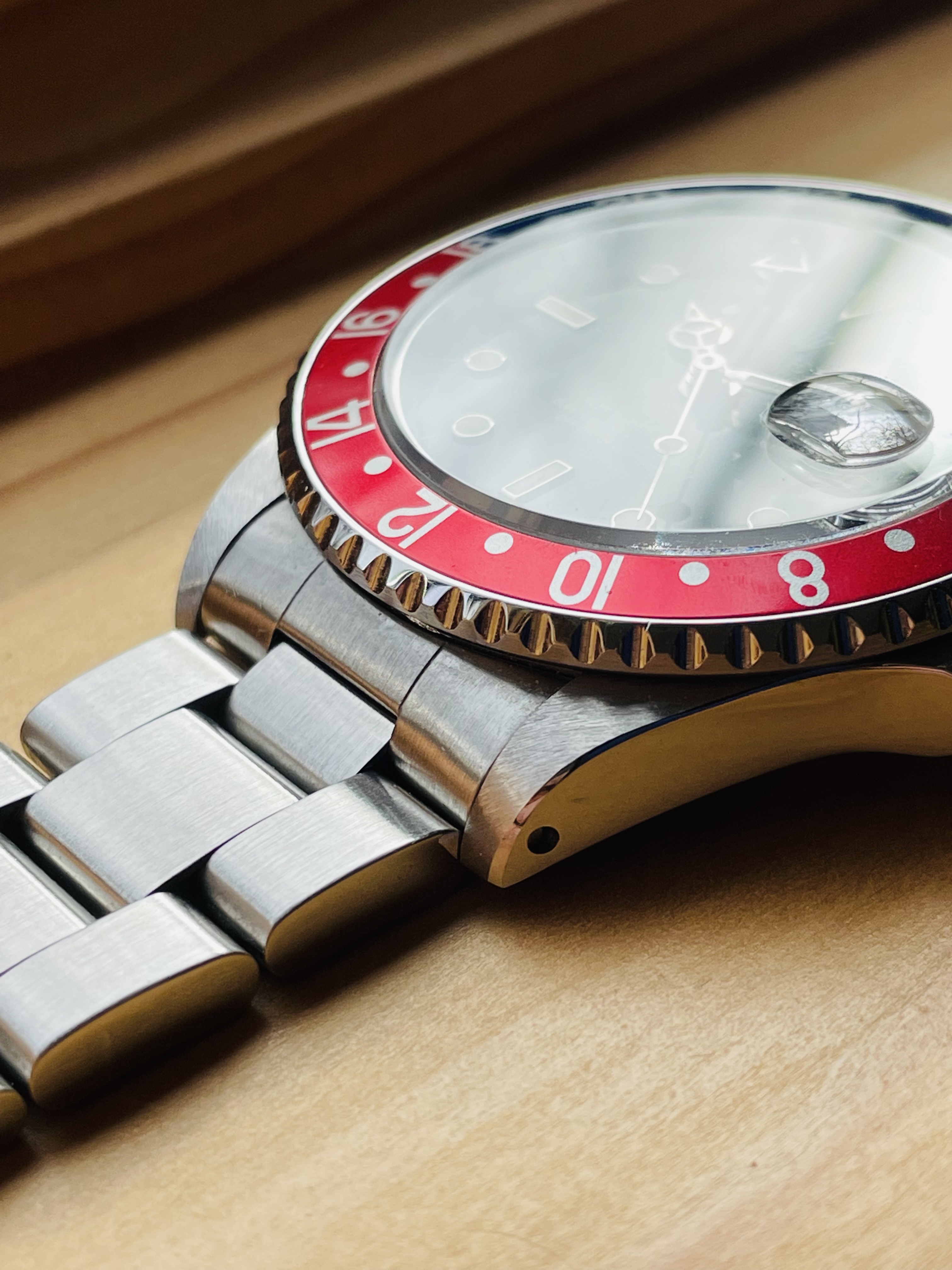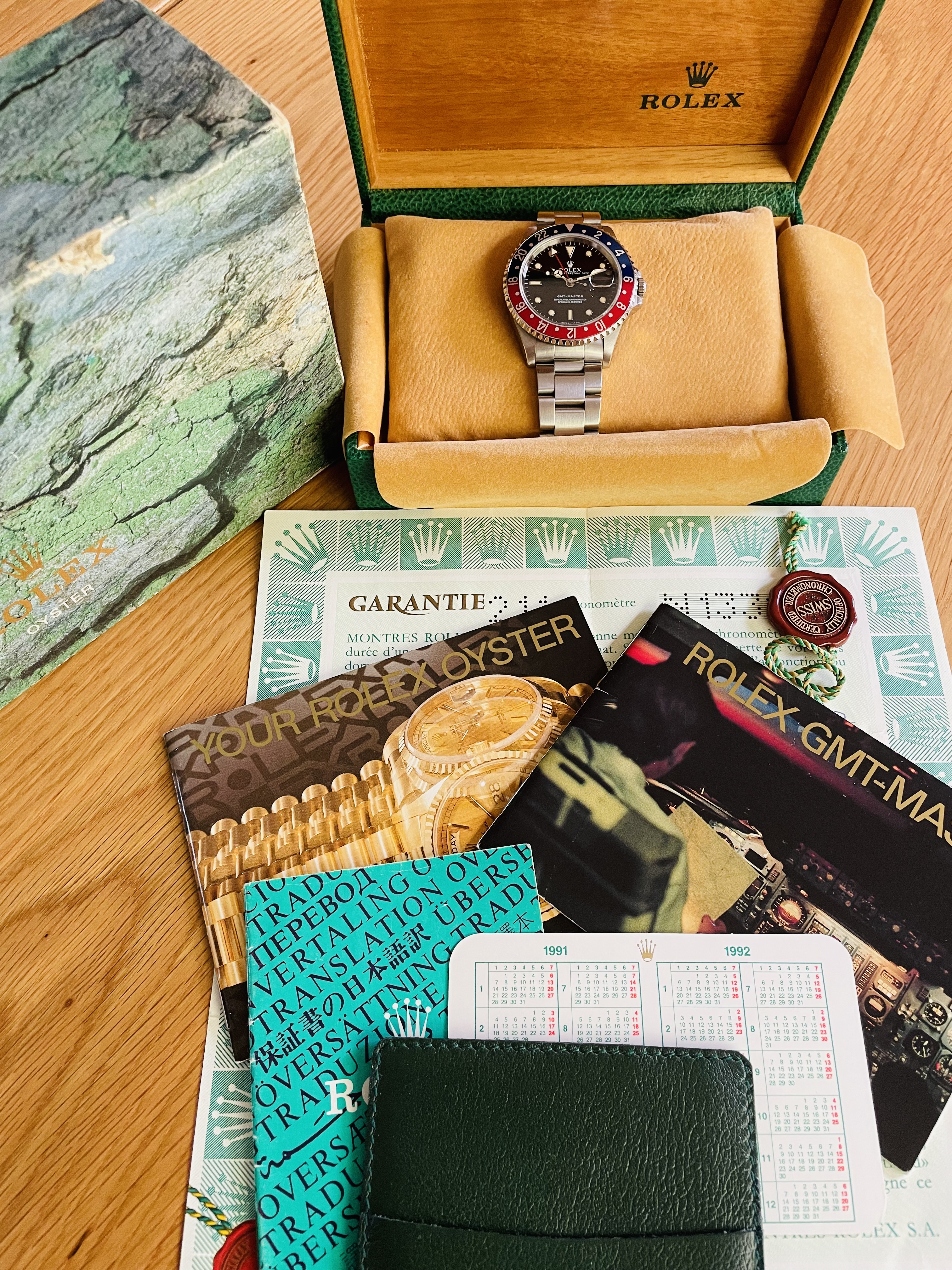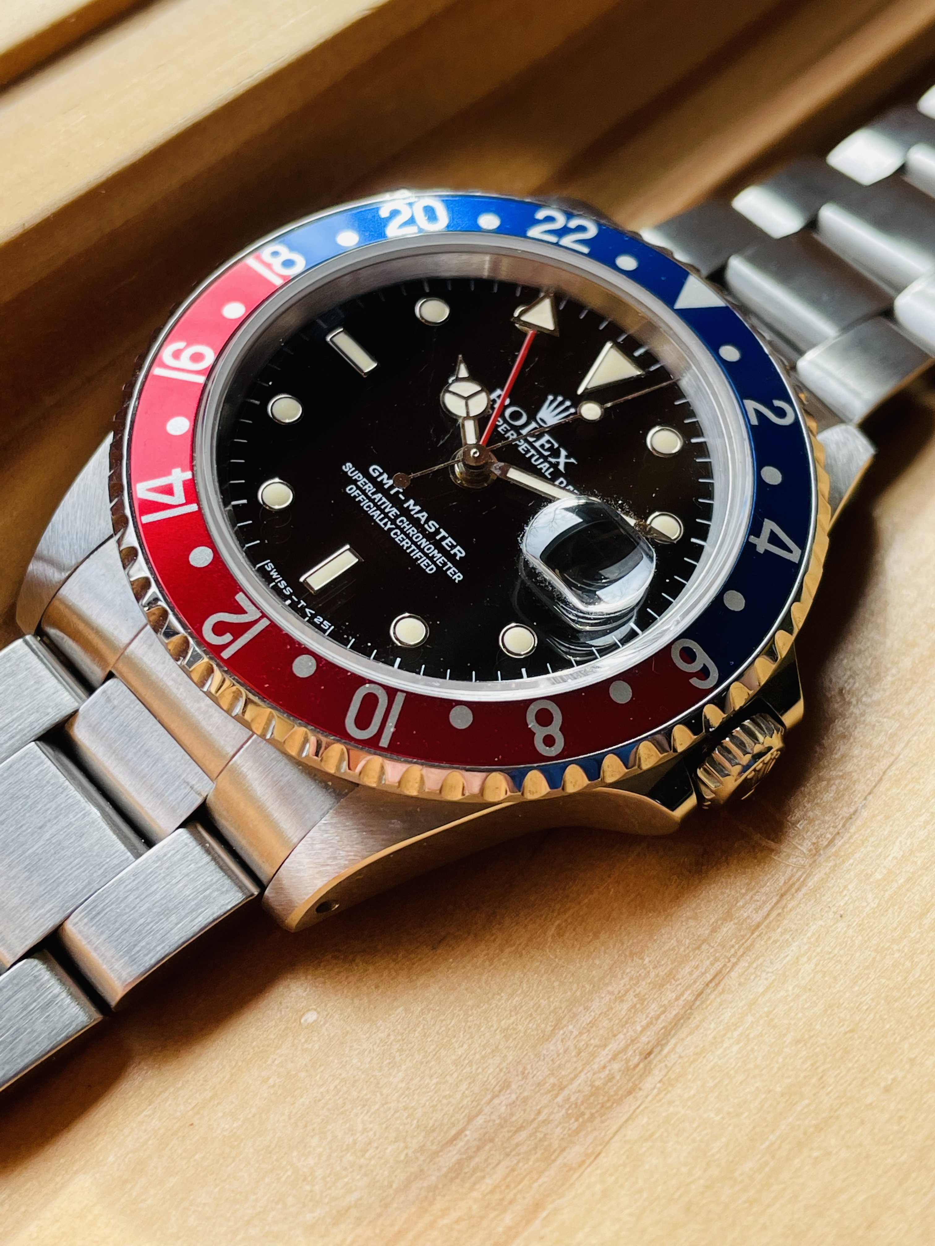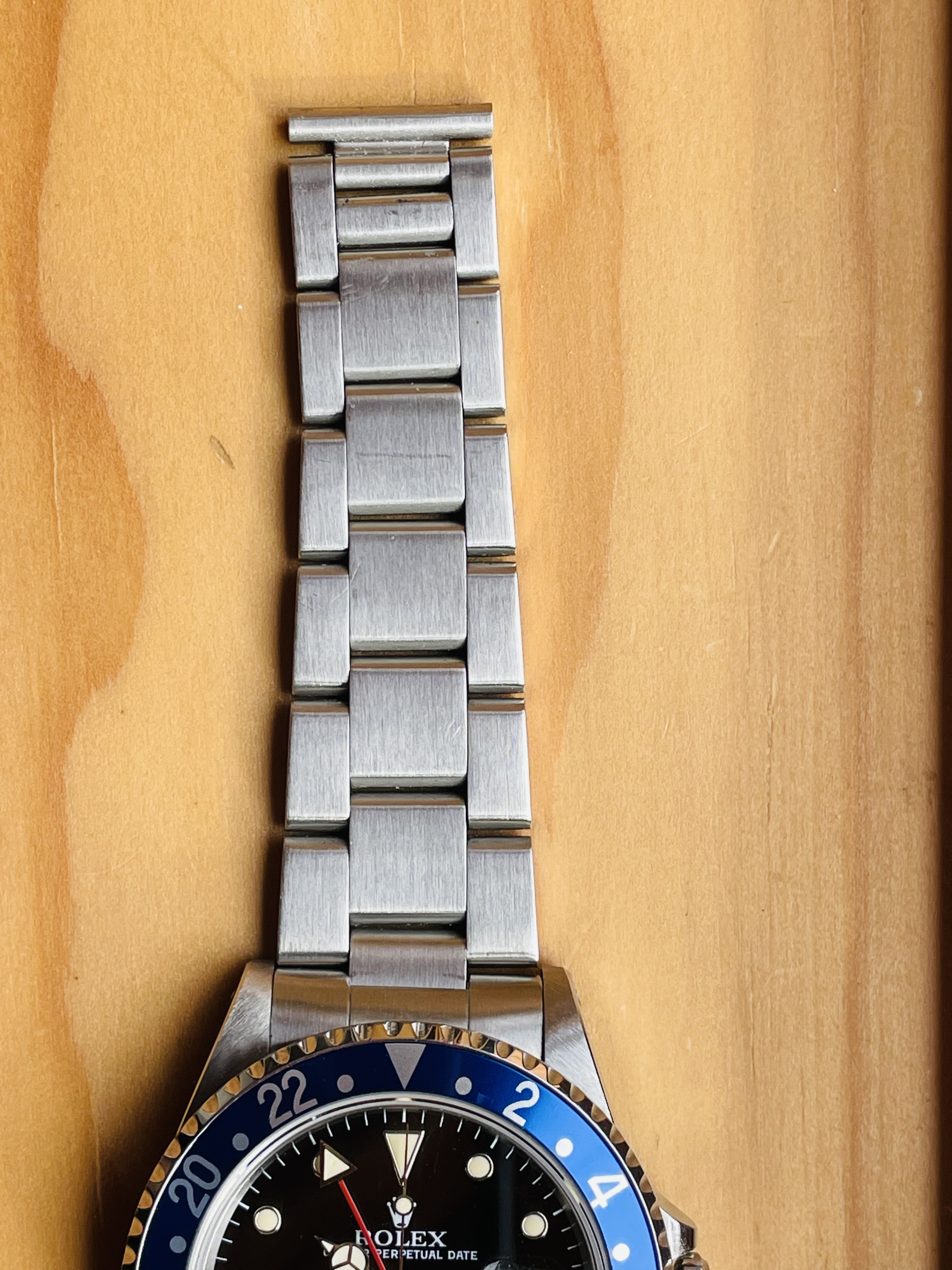 ·Dear OF: for sale, from my personal collection a stunningly beautiful 1991 Rolex GMT 16700 Full Set Pepsi. The watch is flawless with gorgeous patina on the hour markers as well as matching hands. The case is very strong with factory spec brushed finish on top of the lugs and 'no cratering' around the lug holes. Mechanically, it winds smoothly and keeps good time, it has not been serviced during my ownership. The Pepsi bezel insert is practically brand new without any blemishes or scratches. The 78360 bracelet comes with period correct clasp code (P8) and 501 endlinks which are in excellent condition.
