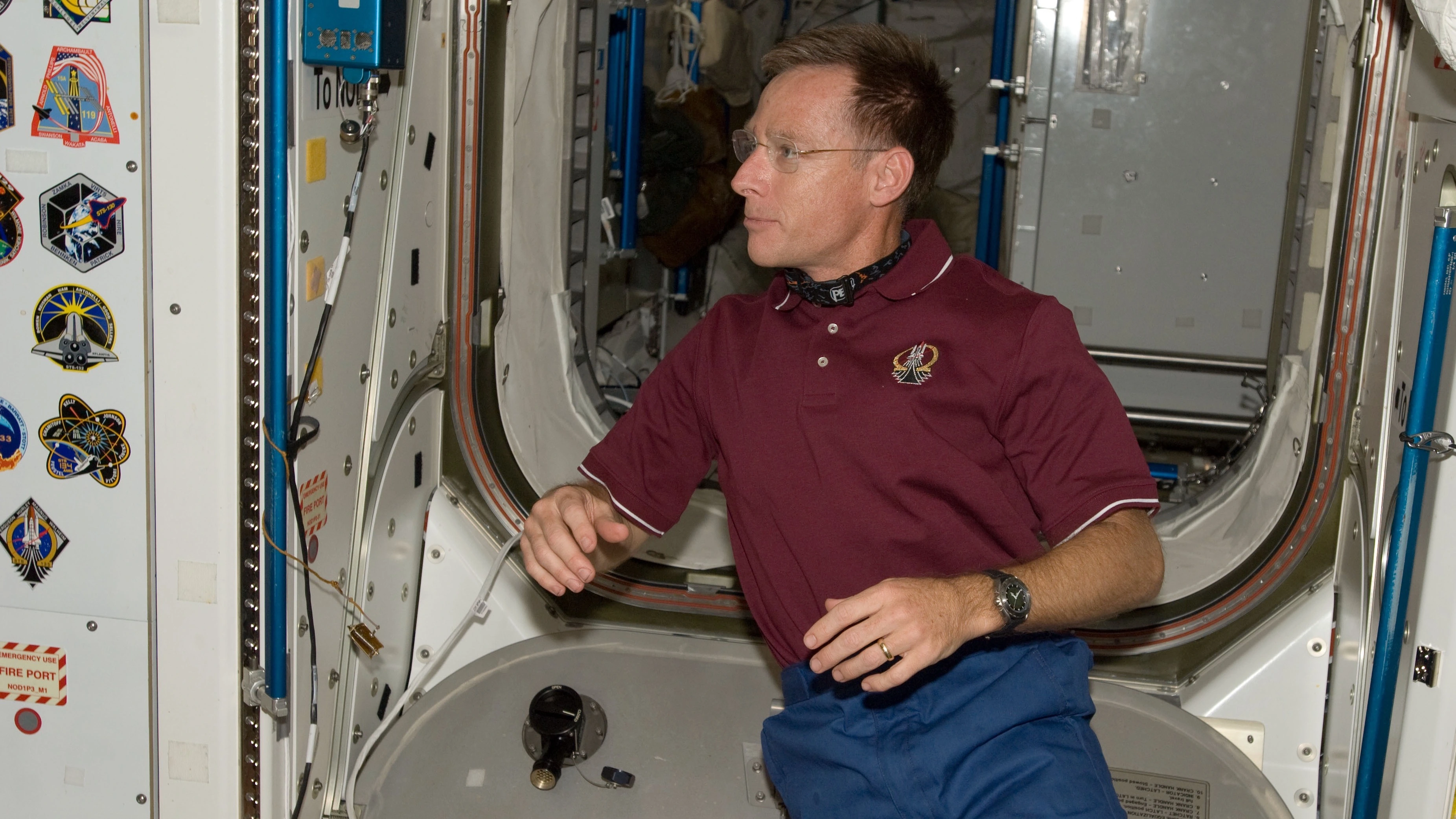 Mission Commander Chris Ferguson adds his mission's decal to the International Space Station as the final piece of the collection of Shuttle crew insignias, partially visible at left. (Photo credit: NASA)