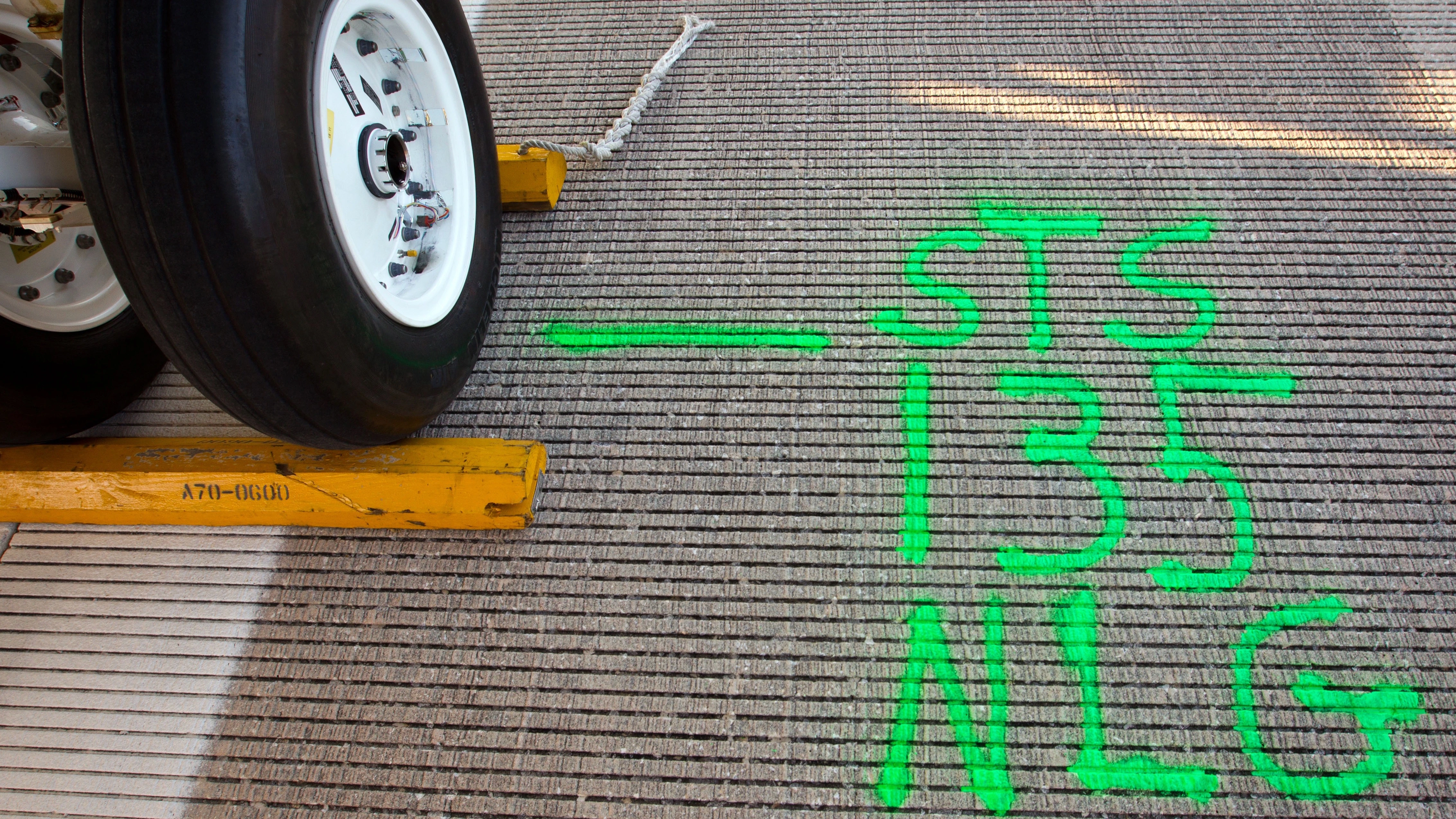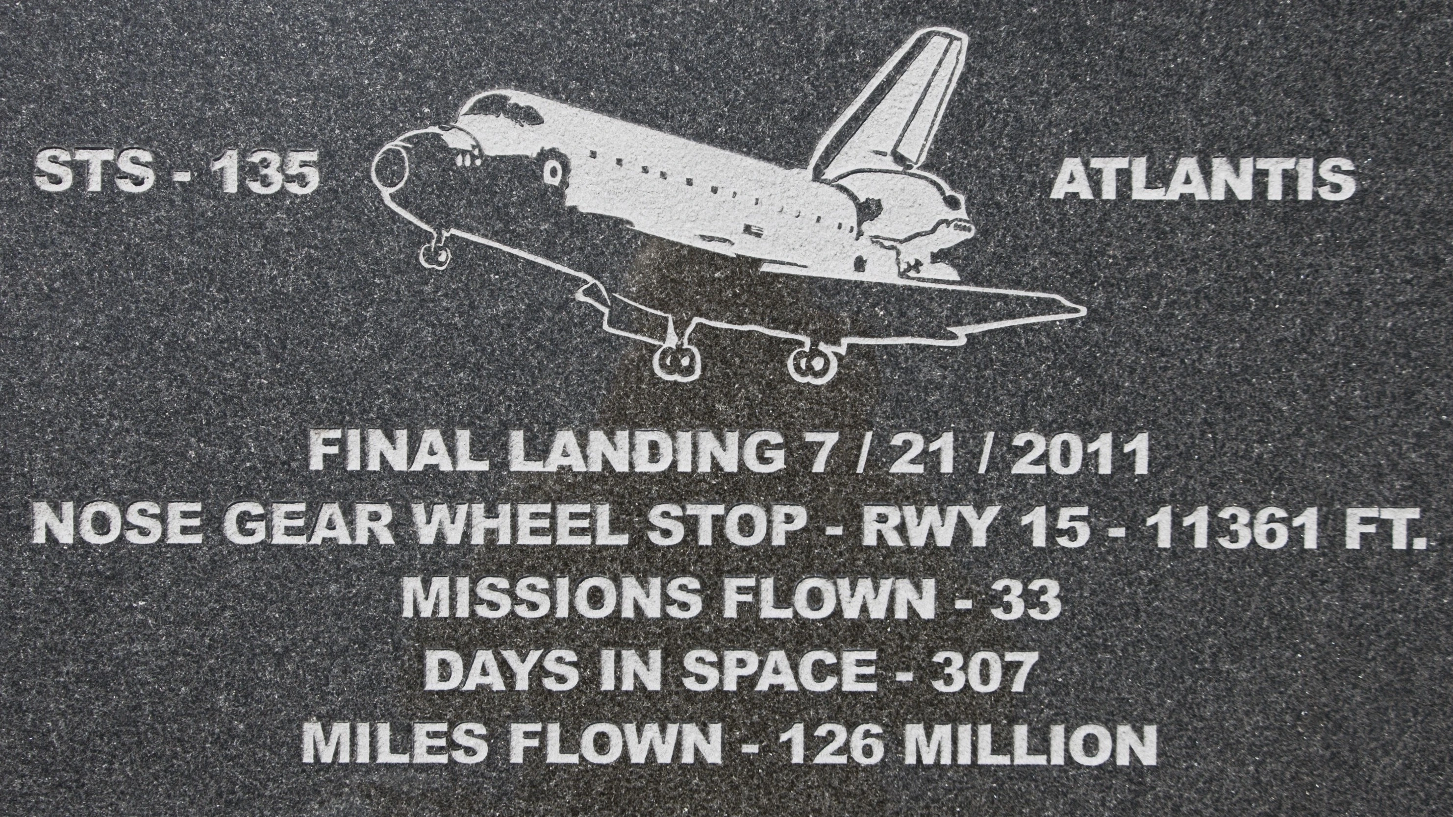 The spot where STS-135 commander Ferguson brought Space Shuttle Atlantis to its "wheels stop" has been marked with a permanent plaque. More on these plaques can be found at collectSPACE. (Photo Credit: NASA)