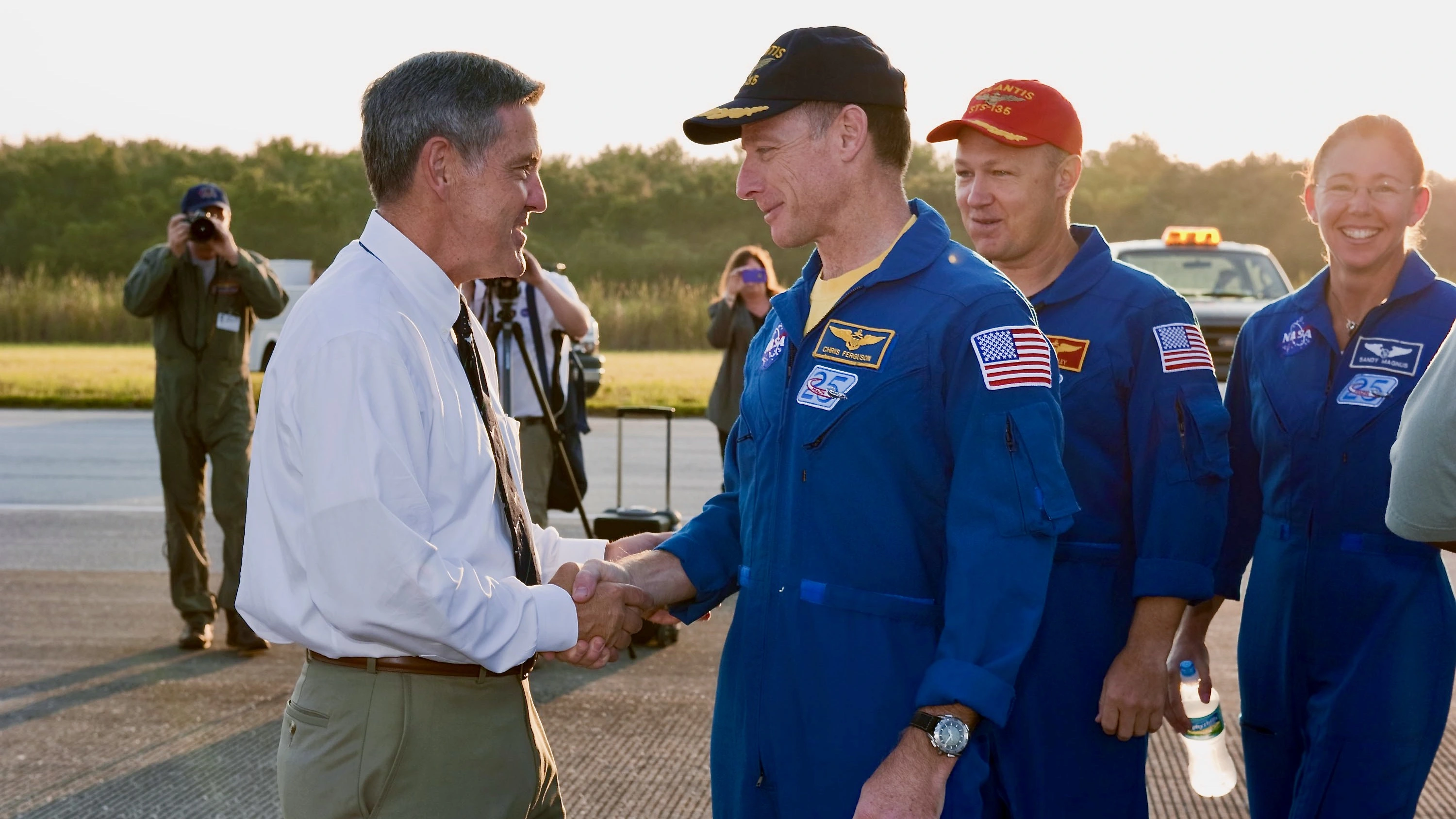 Kennedy Space Center Director Robert Cabana greets Commander Ferguson. (Photo Credit: NASA)