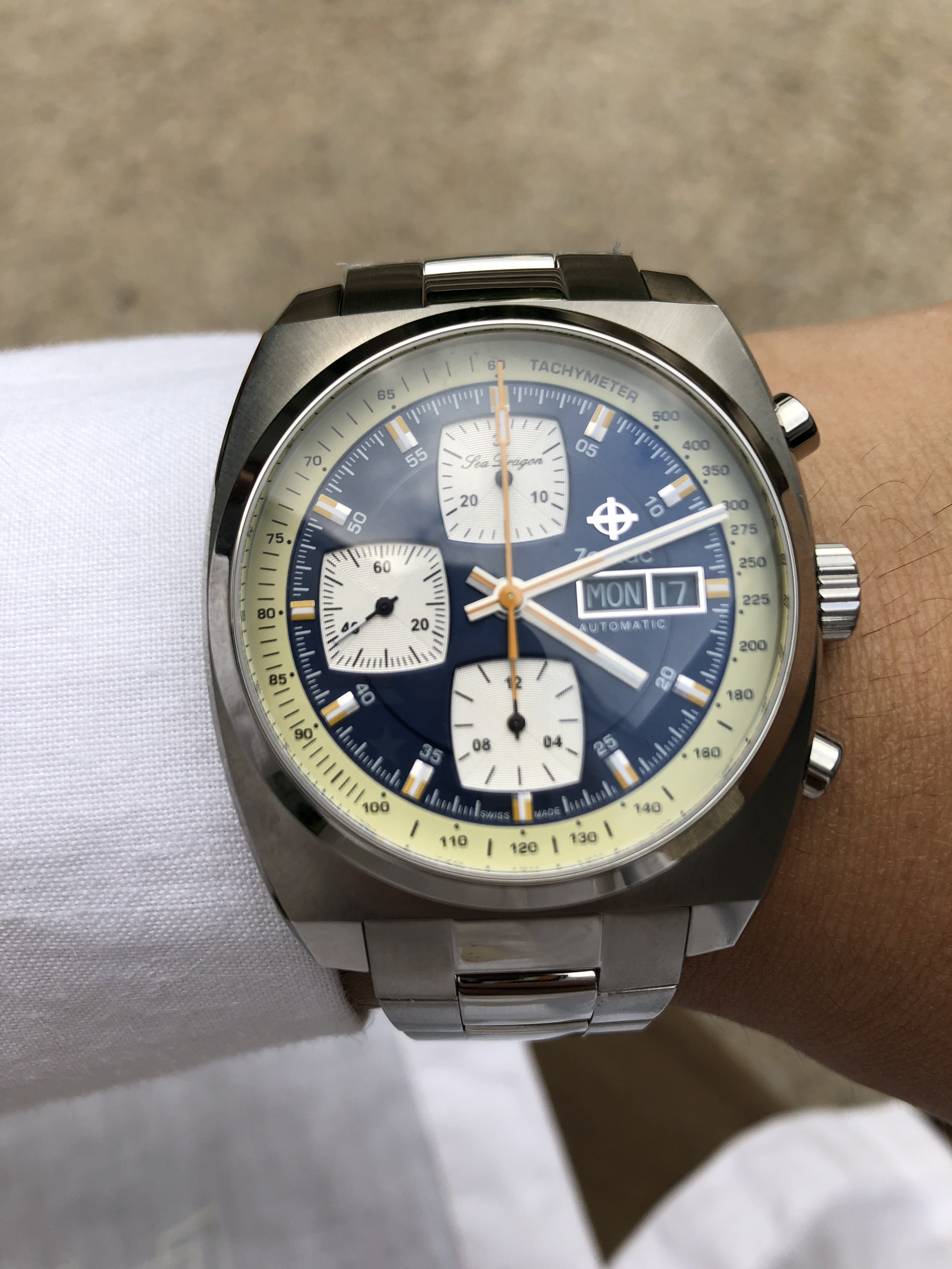 I like the embossed logo and swiss, instead of printed. The honeycomb centre is a bonus, and the dial is domed shaped although I am tempted to call it 'pie pan'😜