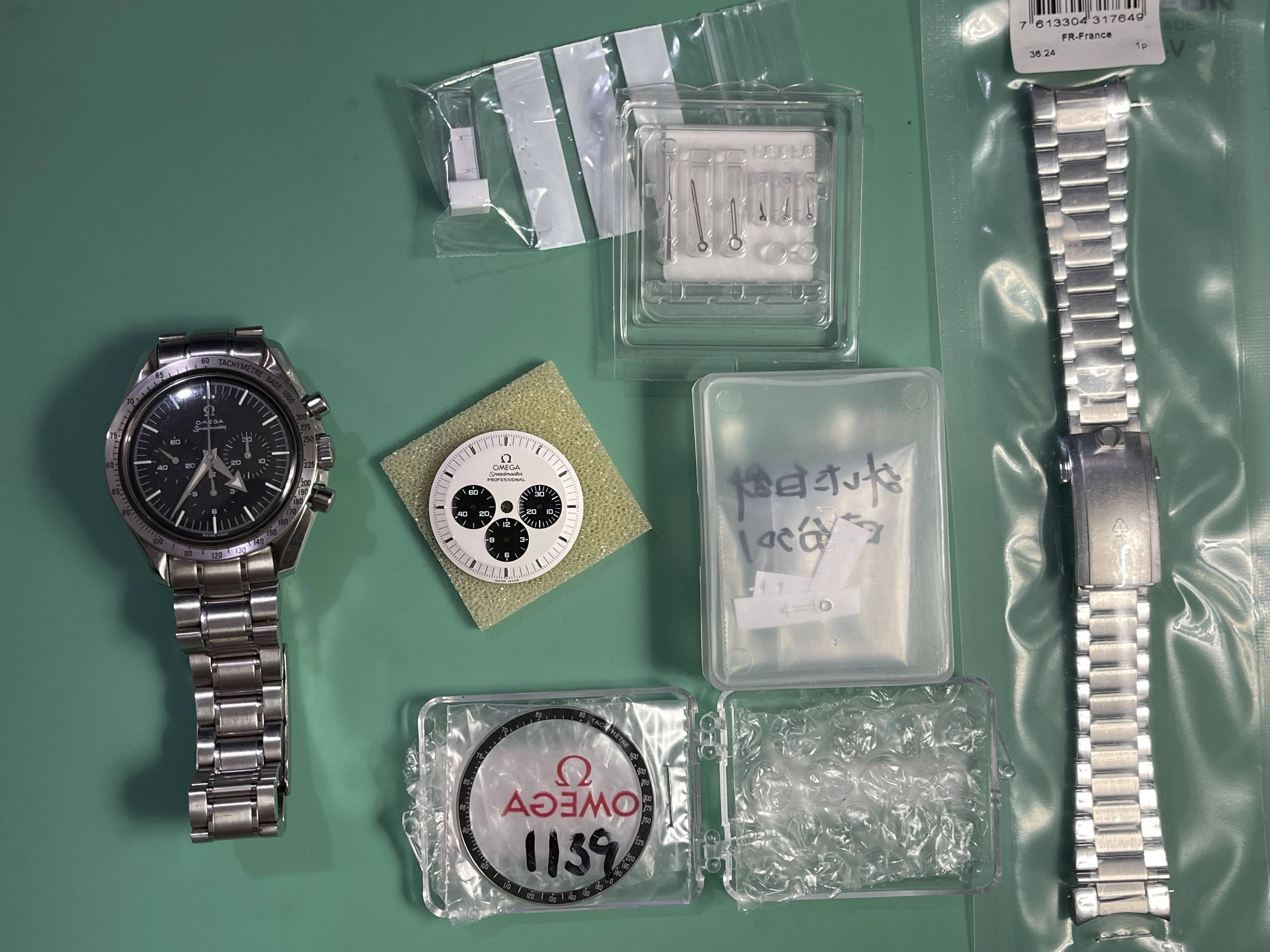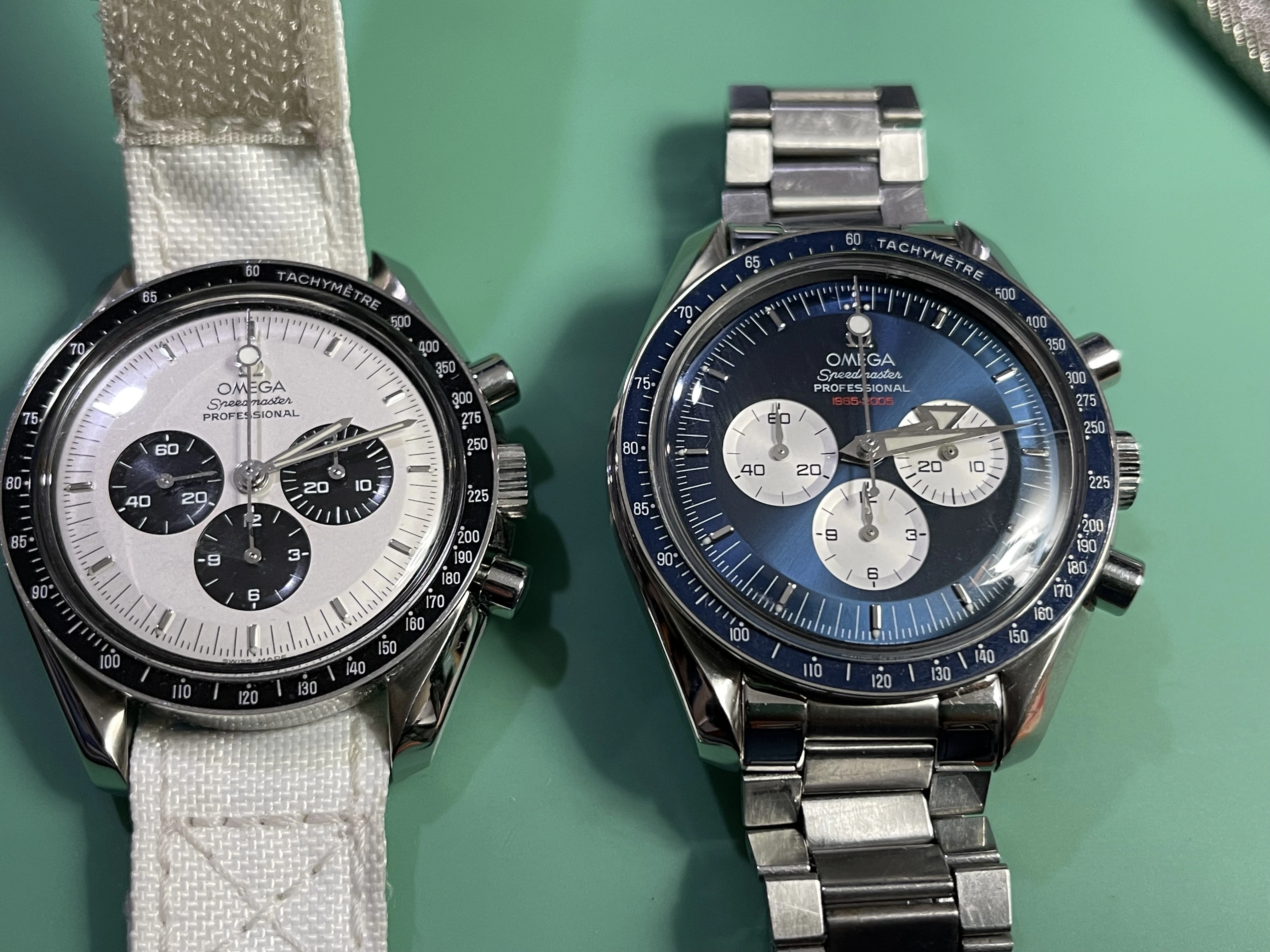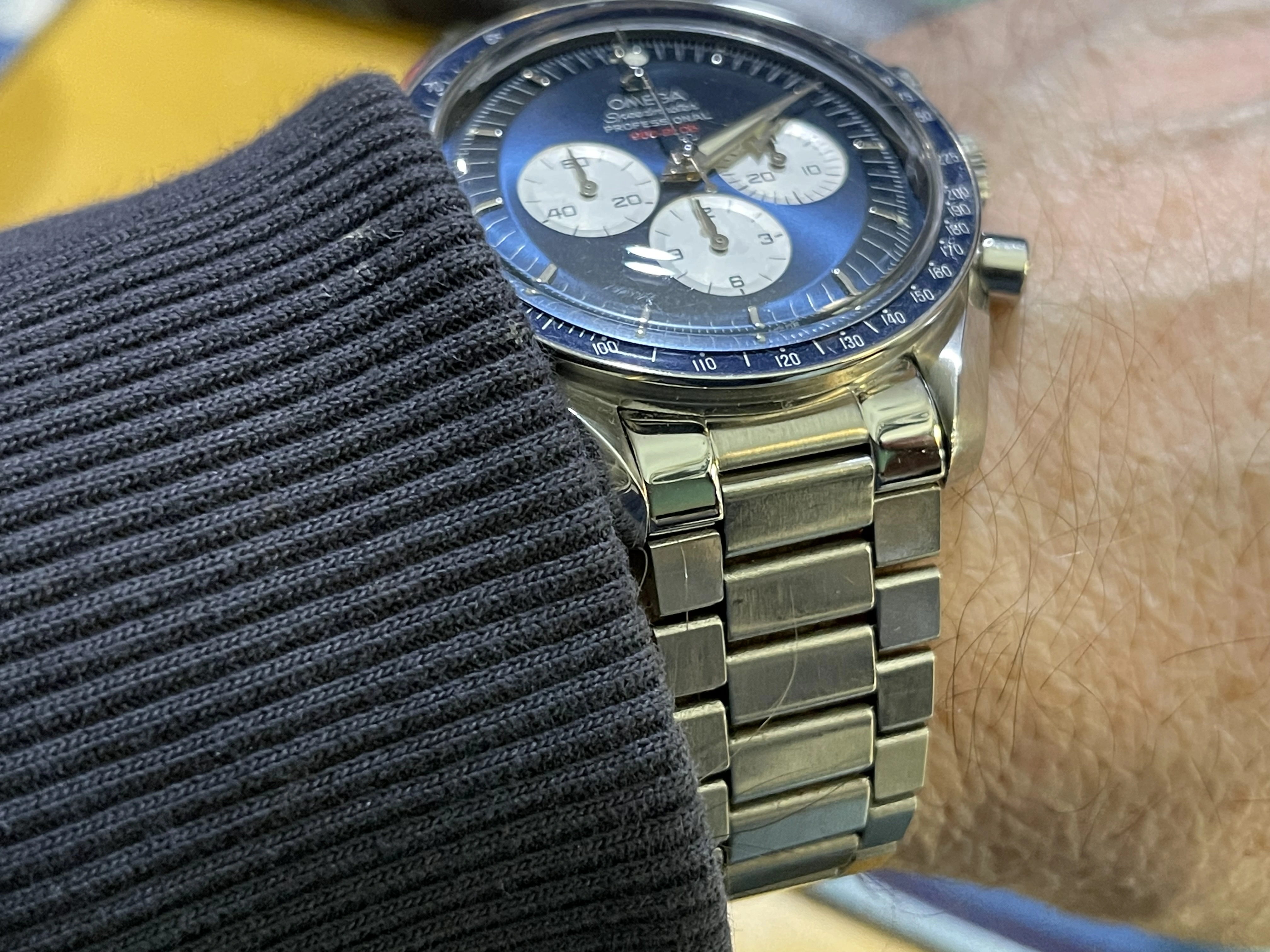 ·There are some Speedmaster dials and combinations I really like but they are on the not on my affordable list. I have no issues purchasing a modified watch or modifying a watch myself as long as it's not being presented as something it's not. Recently I picked-up a 3594-50 with a blue Gemini V dial for sale on this forum. Honestly the price was less than I can get a low milage, stock 3594-50 and I got the Gemini V mod + bezel, hands + the original 3594-50 dial. It was an Omega lego kit. My mistake was meeting with Dave to pick up this watch and then see his Panda. This is kinda the inverse of the Gemini dial and to see it in the flesh, it's an absolute killer. I know Dave wanted me to dive into the Gemini V but that damn Panda on his wrist had my attention. So I get home to work on the Gemini and find another member happens to have a Mitsukoshi dial and hands for sale. Like I see on this forum, it's a reasonable price so I picked them up and then sourced an older 3594-50. In the end I've got the two Speedmasters with parts I purchased or have in stock for around $3600 each. If I had an original Gemini V and Mitsukoshi I'd wear them occasionally to preserve value vs not worrying about scratching or wearing the ones I built. So now for the pictures: