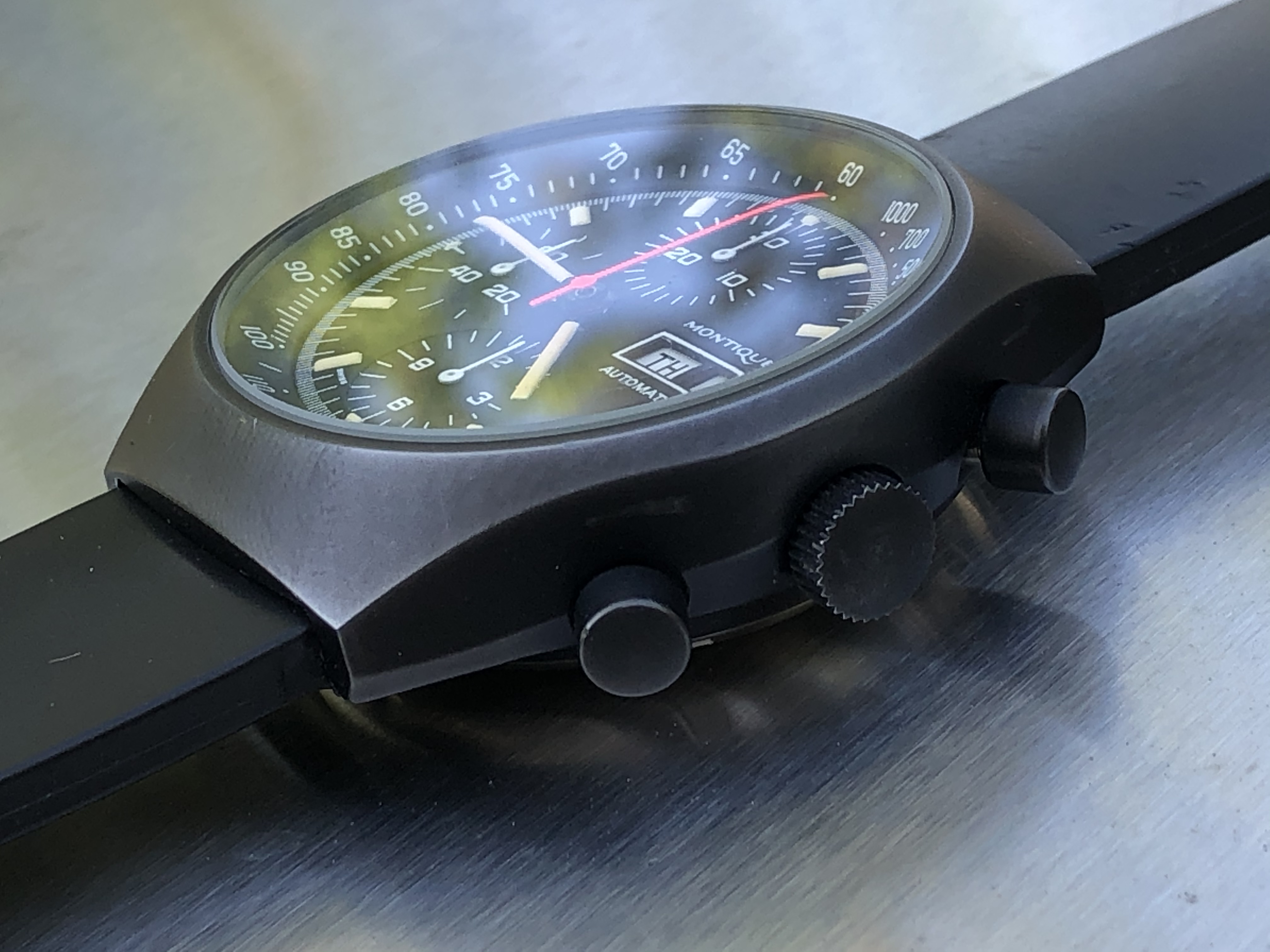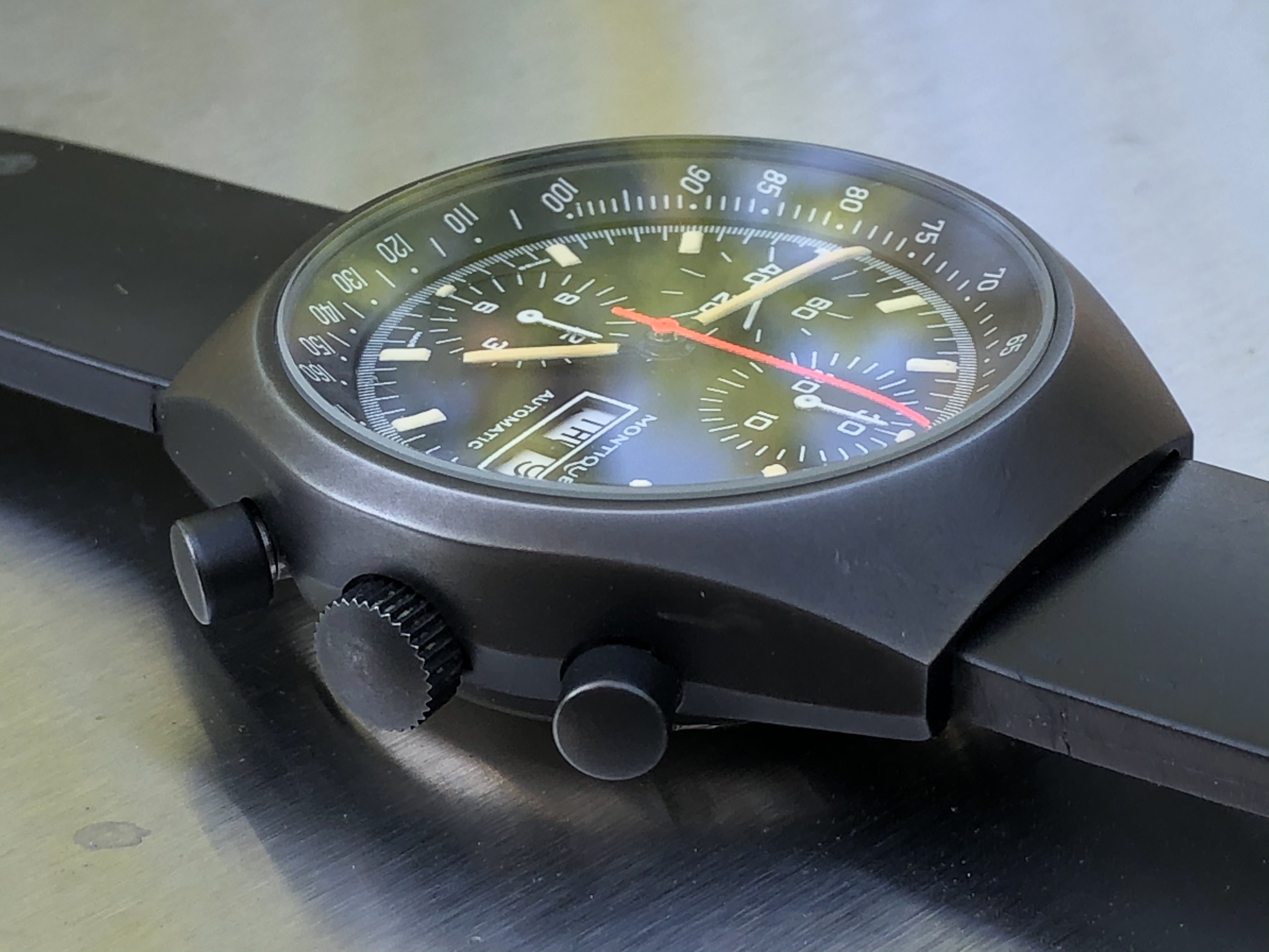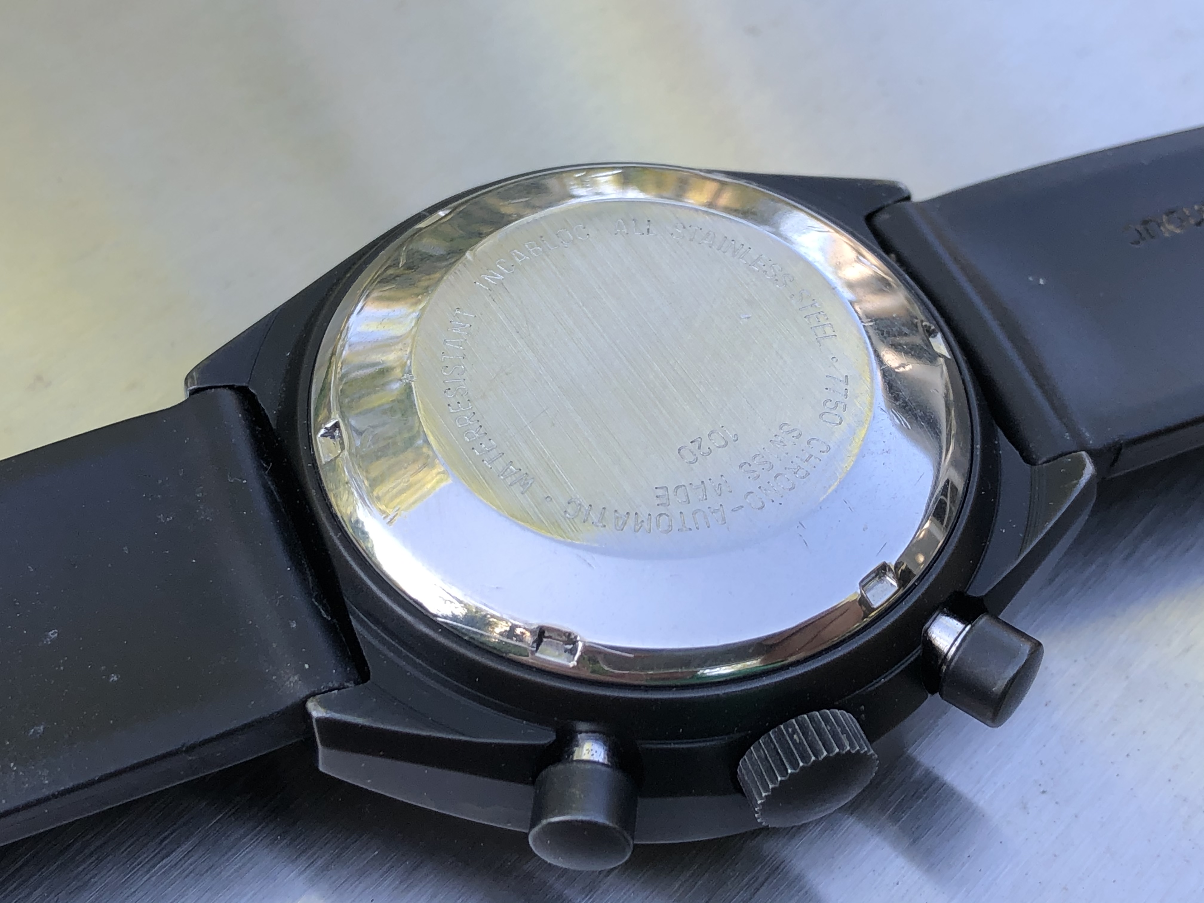 Case: 41mm stainless with PVD coating in excellent condition with minor wear around the pushers and one scratch on the back, minor loss on edges.