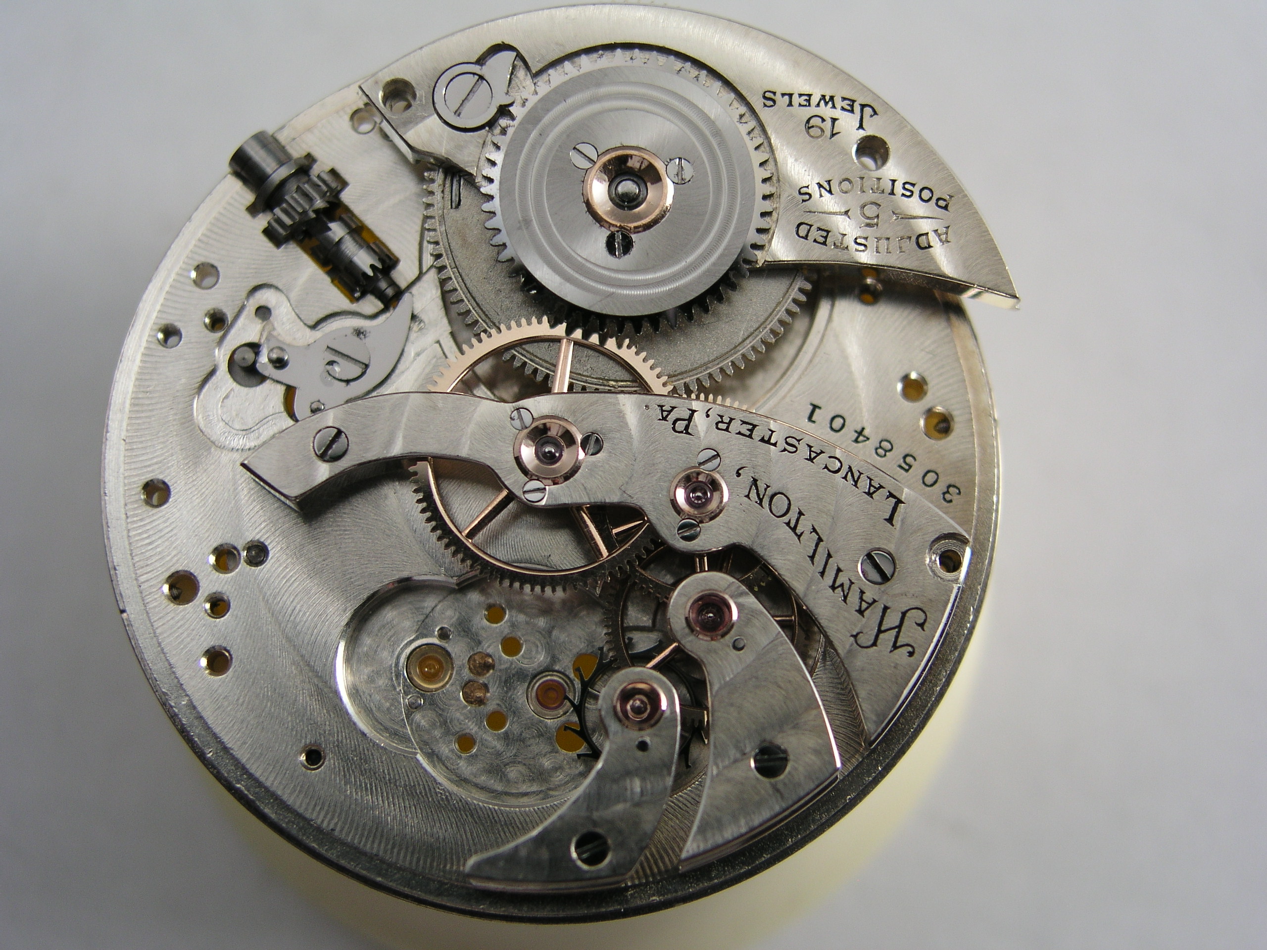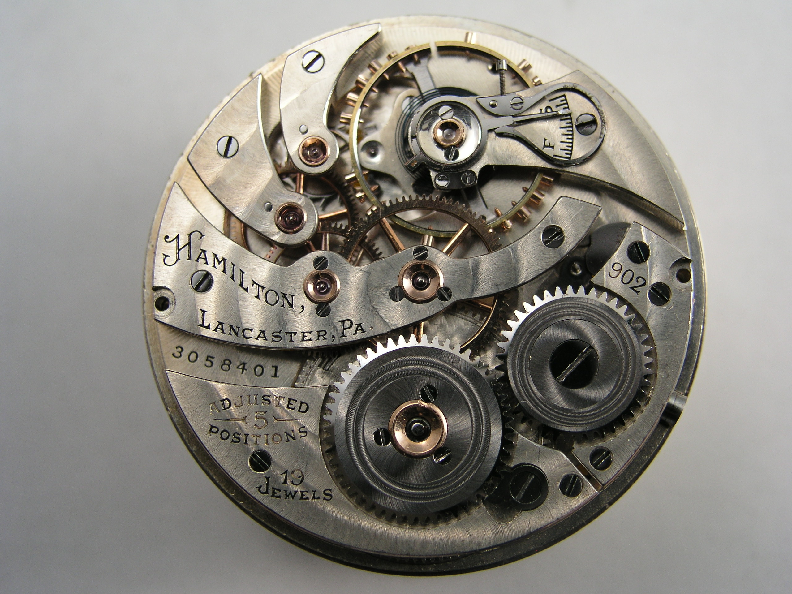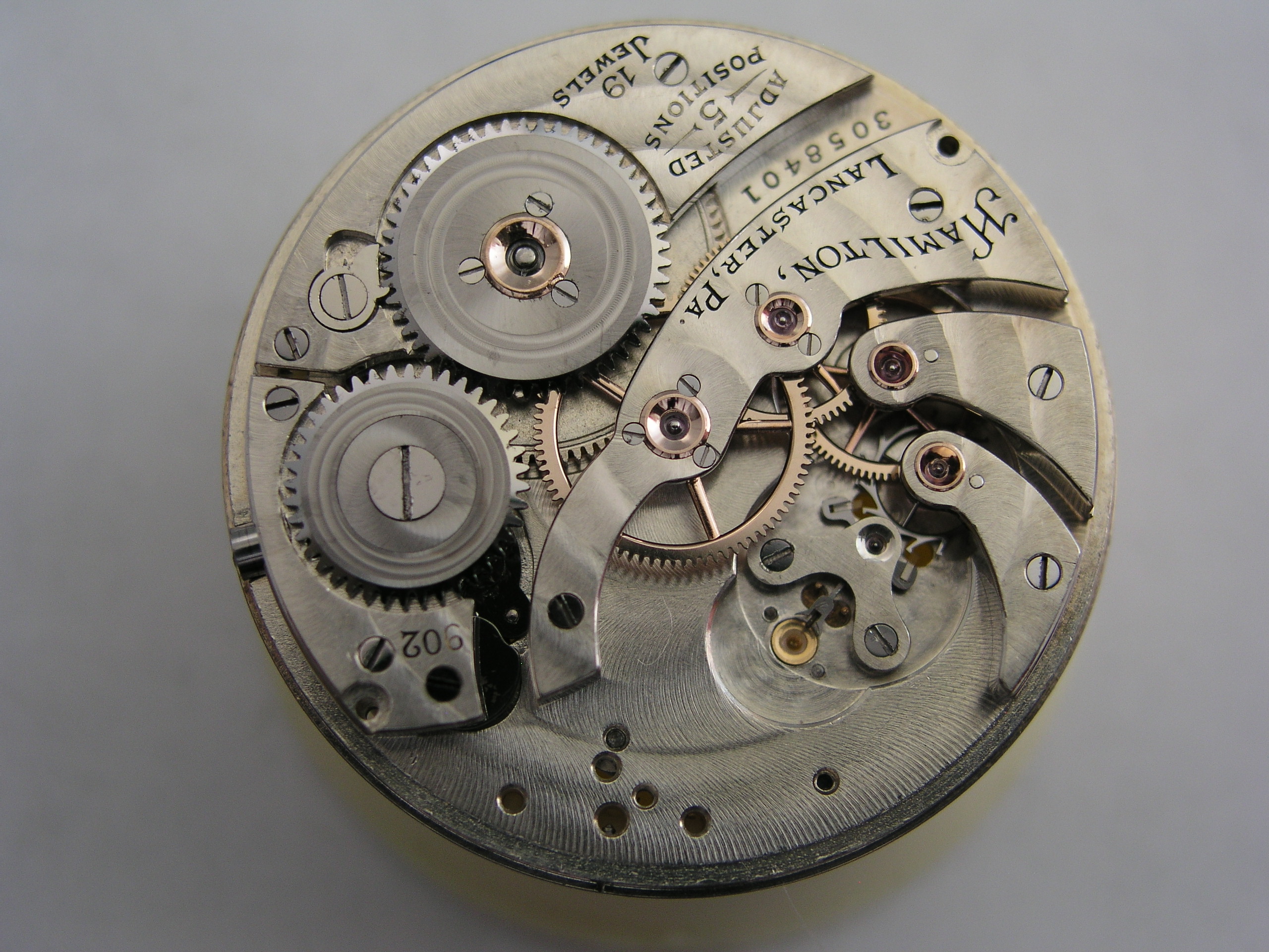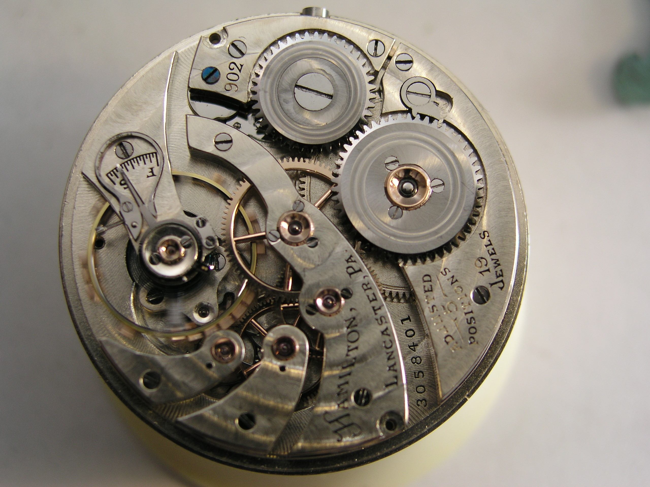 ·This is one I did for a client several years ago. A 12-size, 19-jewel Hamilton 902. An unusual case and dial. Before someone suggest that I didn't remove the cap jewels, please note. On higher jewelled American watches, I remove the cap jewels, re-fit the proper hole jewel, then re-fit the retaining screws. you do NOT want to mix up the hole jewels because of different profiles and jewel hole sizes.