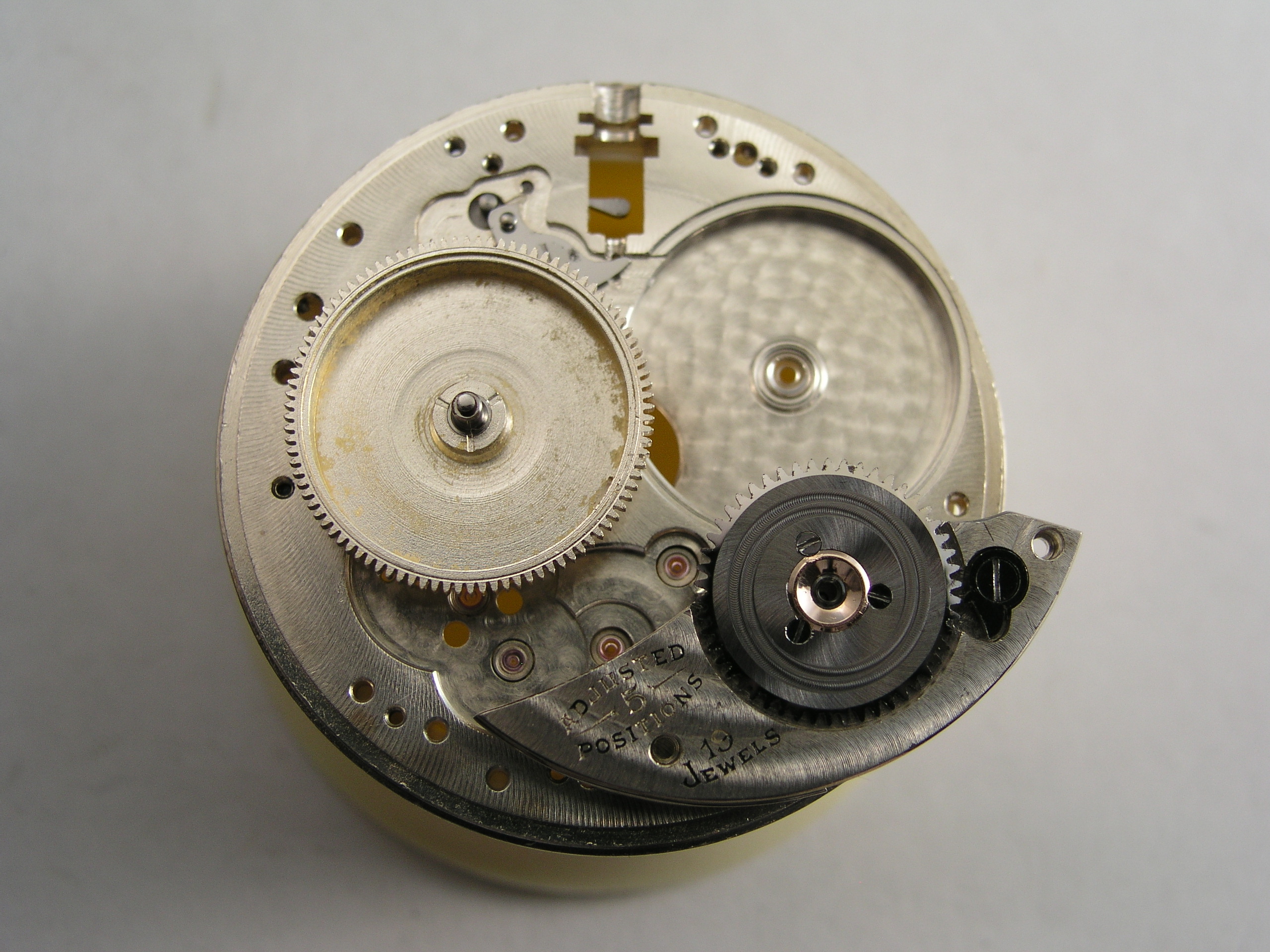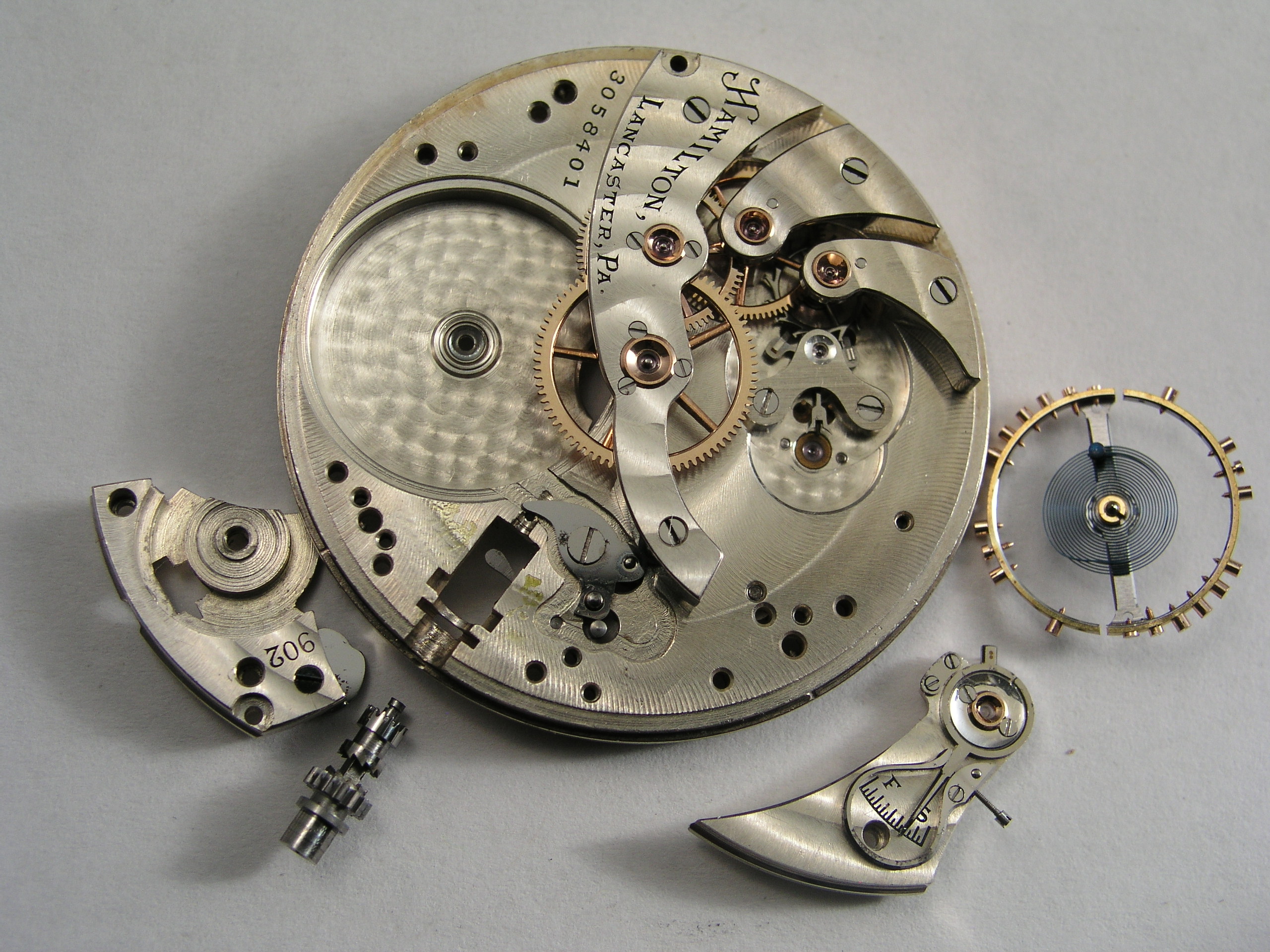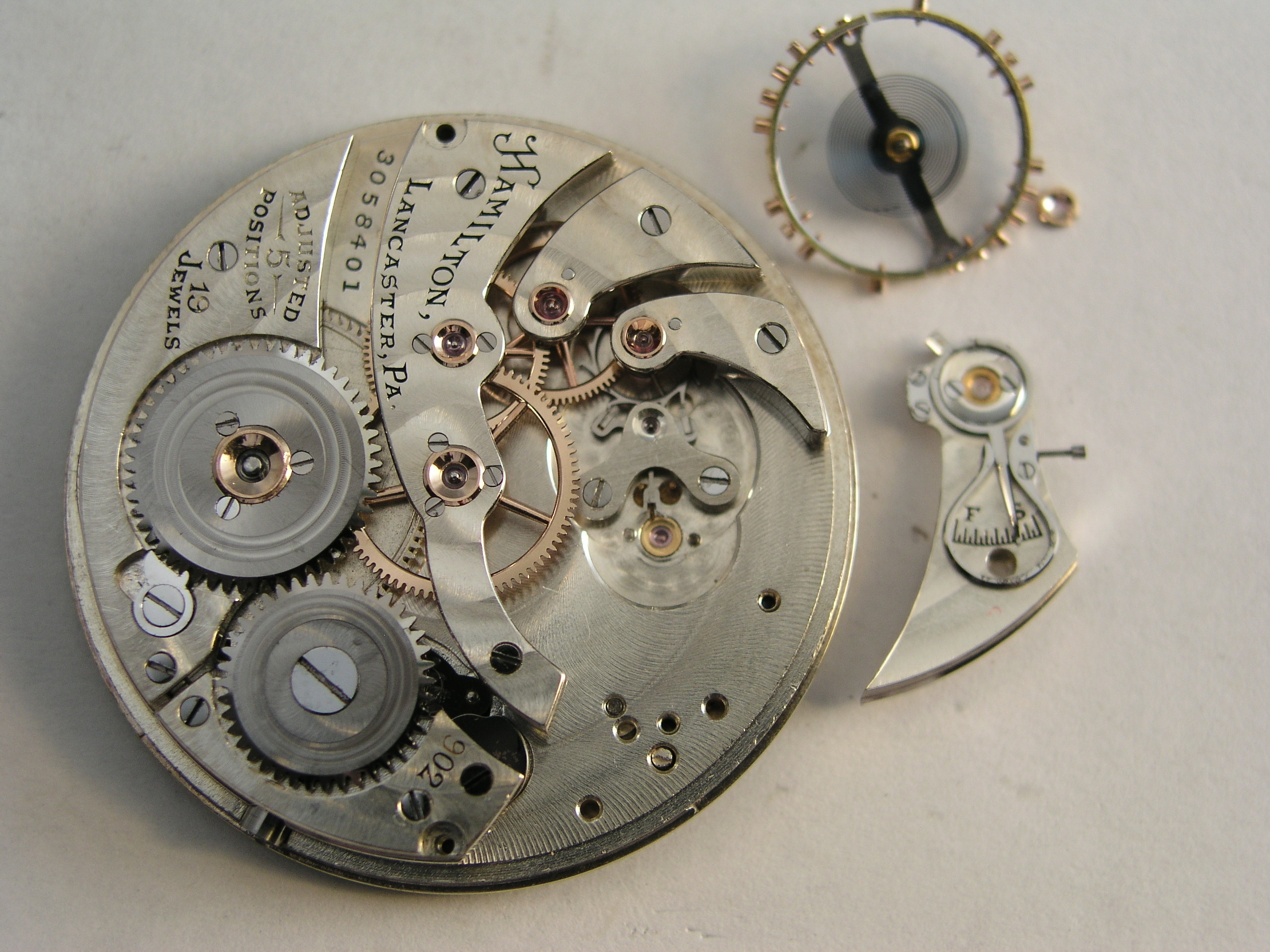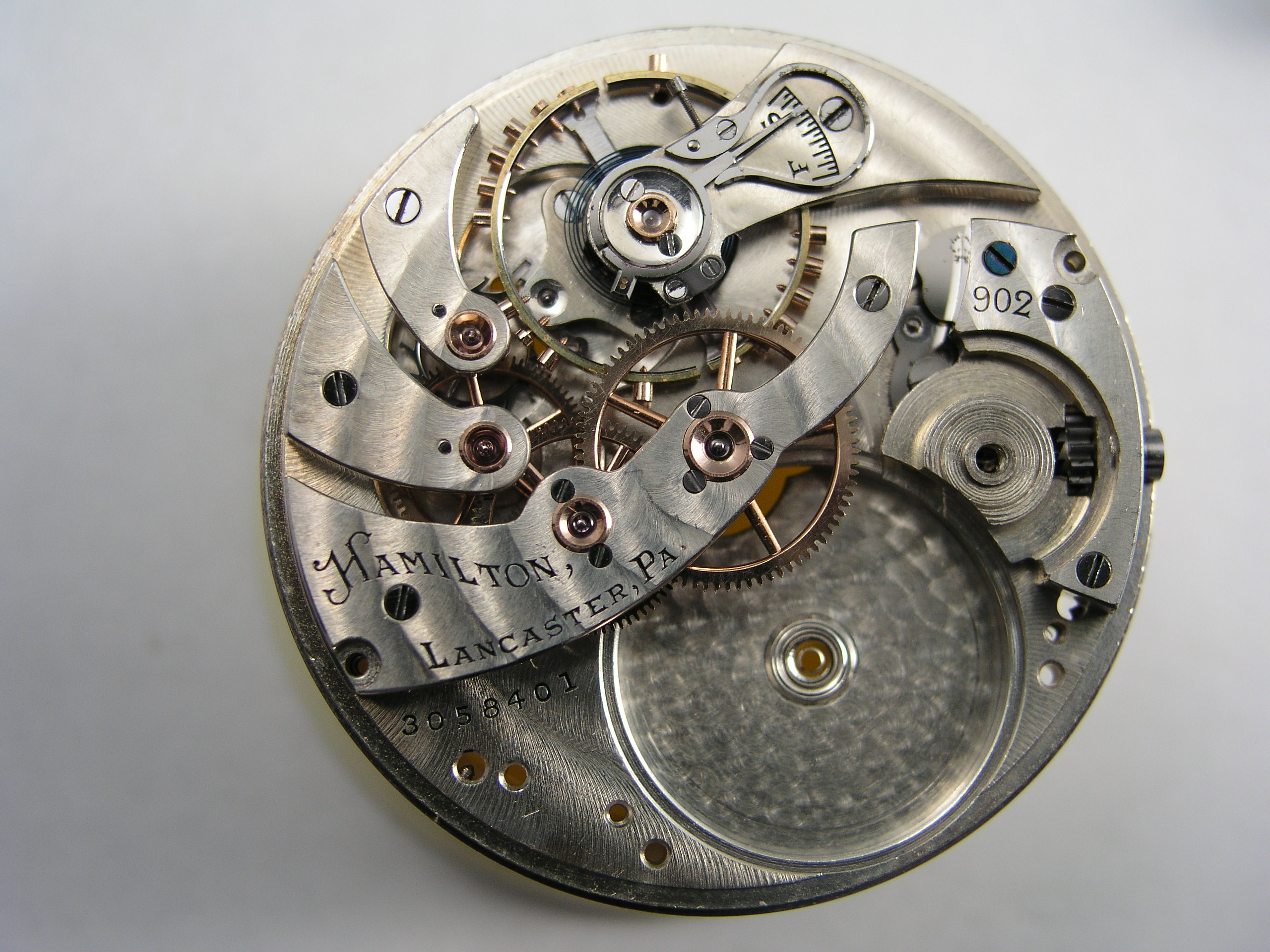 ·This is one I did for a client several years ago. A 12-size, 19-jewel Hamilton 902. An unusual case and dial. Before someone suggest that I didn't remove the cap jewels, please note. On higher jewelled American watches, I remove the cap jewels, re-fit the proper hole jewel, then re-fit the retaining screws. you do NOT want to mix up the hole jewels because of different profiles and jewel hole sizes.