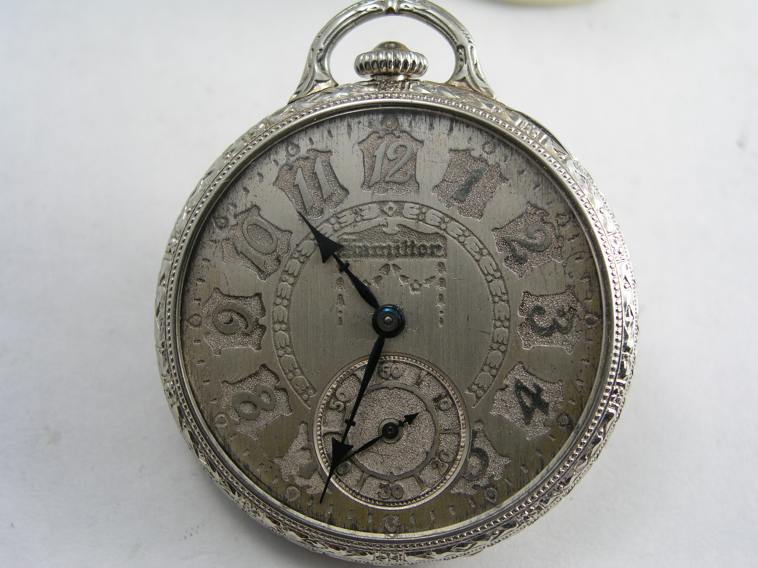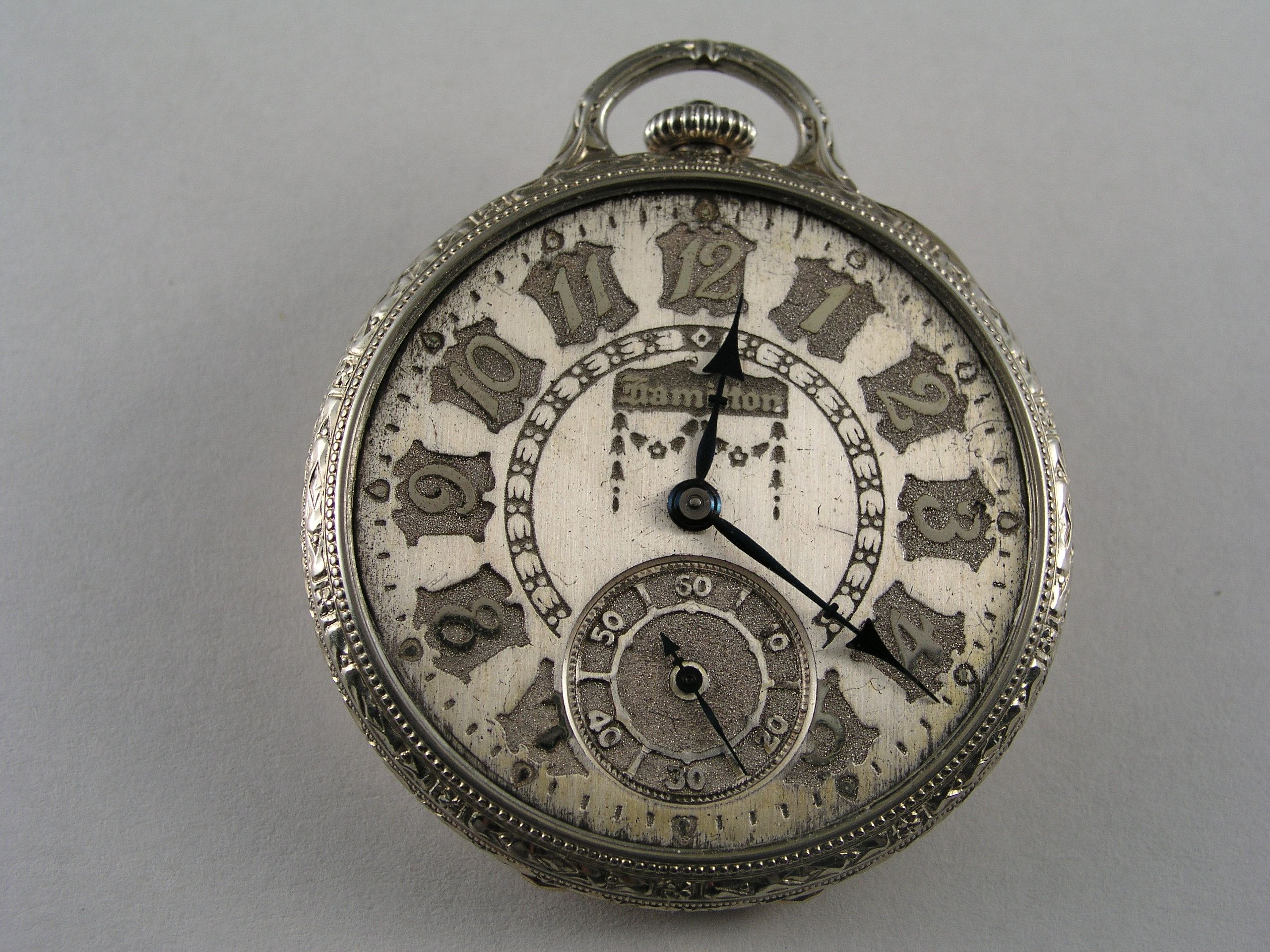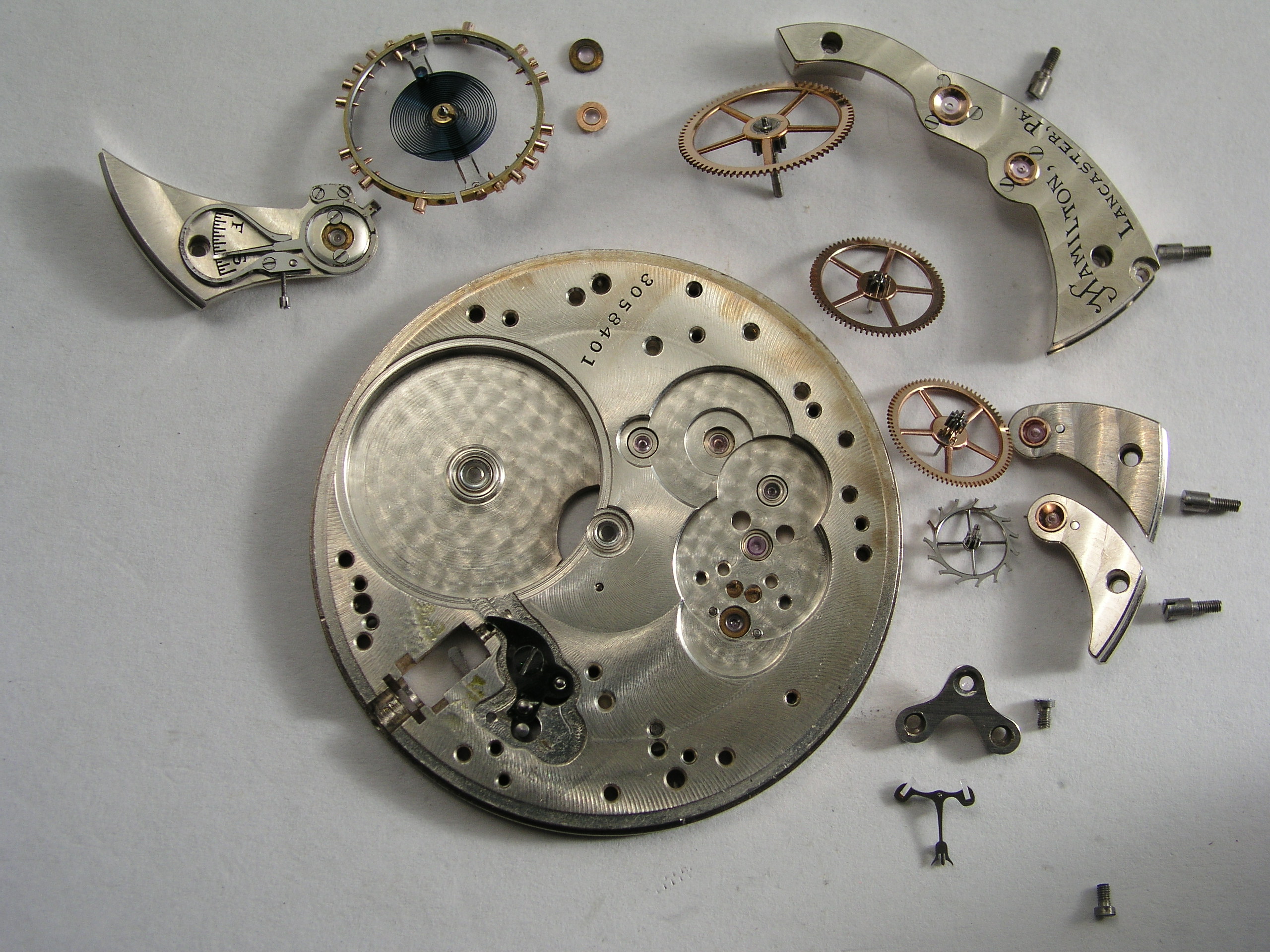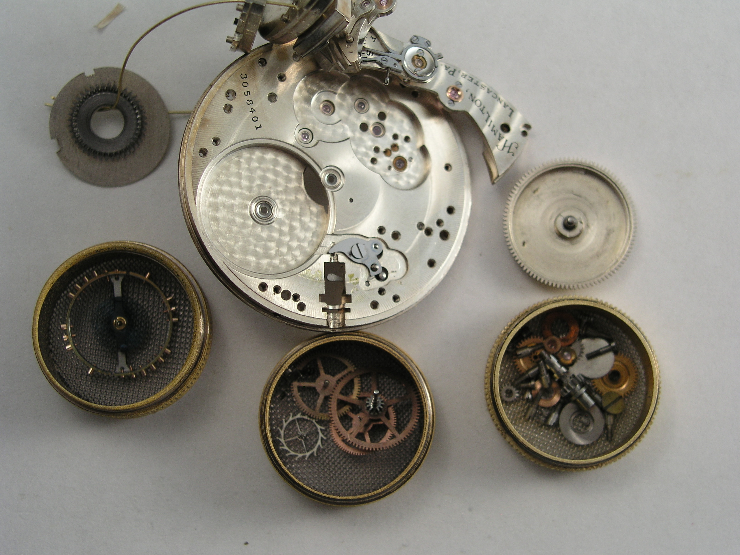 ·This is one I did for a client several years ago. A 12-size, 19-jewel Hamilton 902. An unusual case and dial. Before someone suggest that I didn't remove the cap jewels, please note. On higher jewelled American watches, I remove the cap jewels, re-fit the proper hole jewel, then re-fit the retaining screws. you do NOT want to mix up the hole jewels because of different profiles and jewel hole sizes.