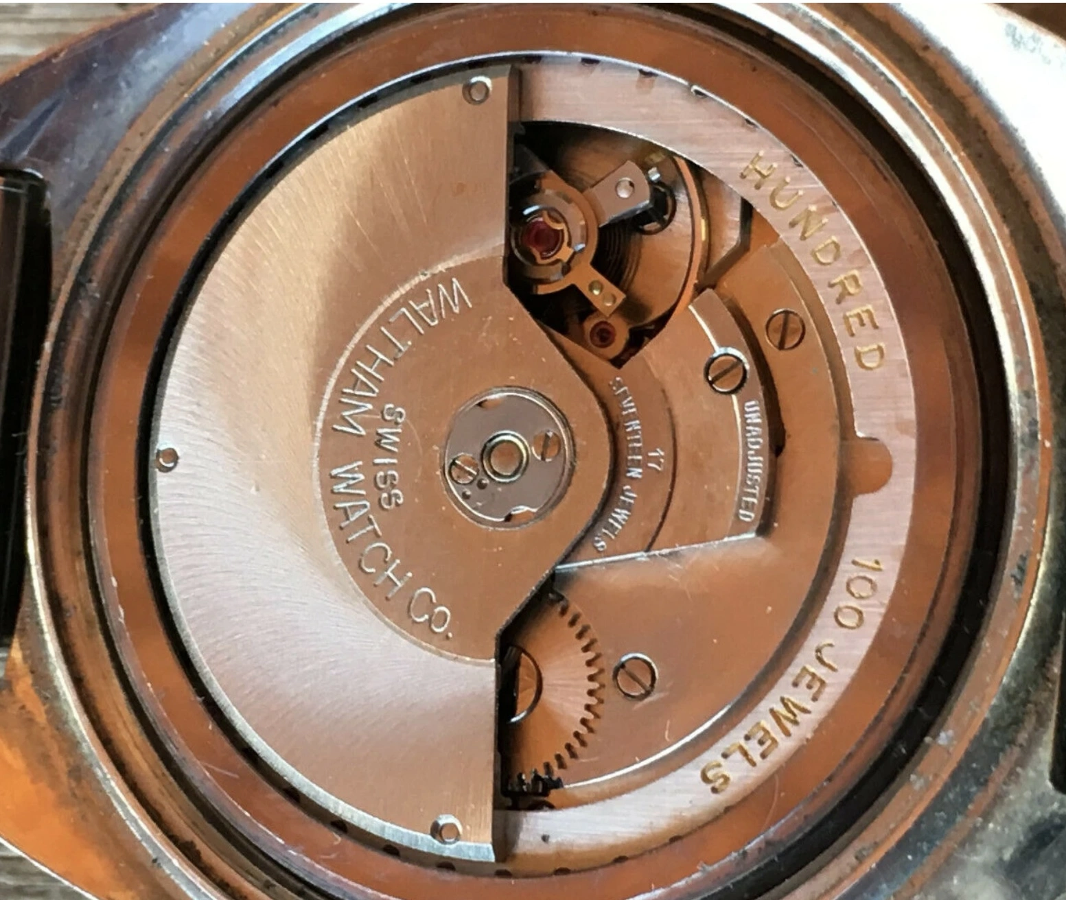 The movement shown in this post has what might appear to be a “perimeter rotor”. That is, the component stamped 100 jewel is a 360° ring affixed to the rotor. Some watches of this design utilize an internal ring gear which actuates the winding gears in the automatic winding. Some watches with this type of auto wind system have the rotor and attached ring running in jewelled bearings. In the case of the subject Waltham 100 shown in the picture, there are many cap jewels installed in the rotor and the ring, those jewels being barely visible around the outer perimeter of the ring. Not truly a perimeter rotor, with the self winding mechanism operating just as it does on a standard self winder. The movement pictured is pivoted in the centre of the rotor on a standard rotor post. The true perimeter rotor doesn’t have that centre rotor post, the rotor operating on a jewelled race around the perimeter. The jewels in the ring serve no function.