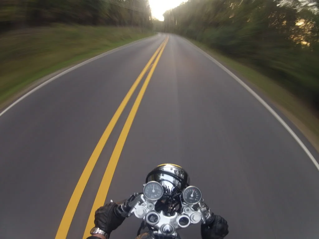 If you look closely you can see my Seiko Pogue on my wrist riding my cafe racer in Alabama heading back to the hotel after a long day in the sun.