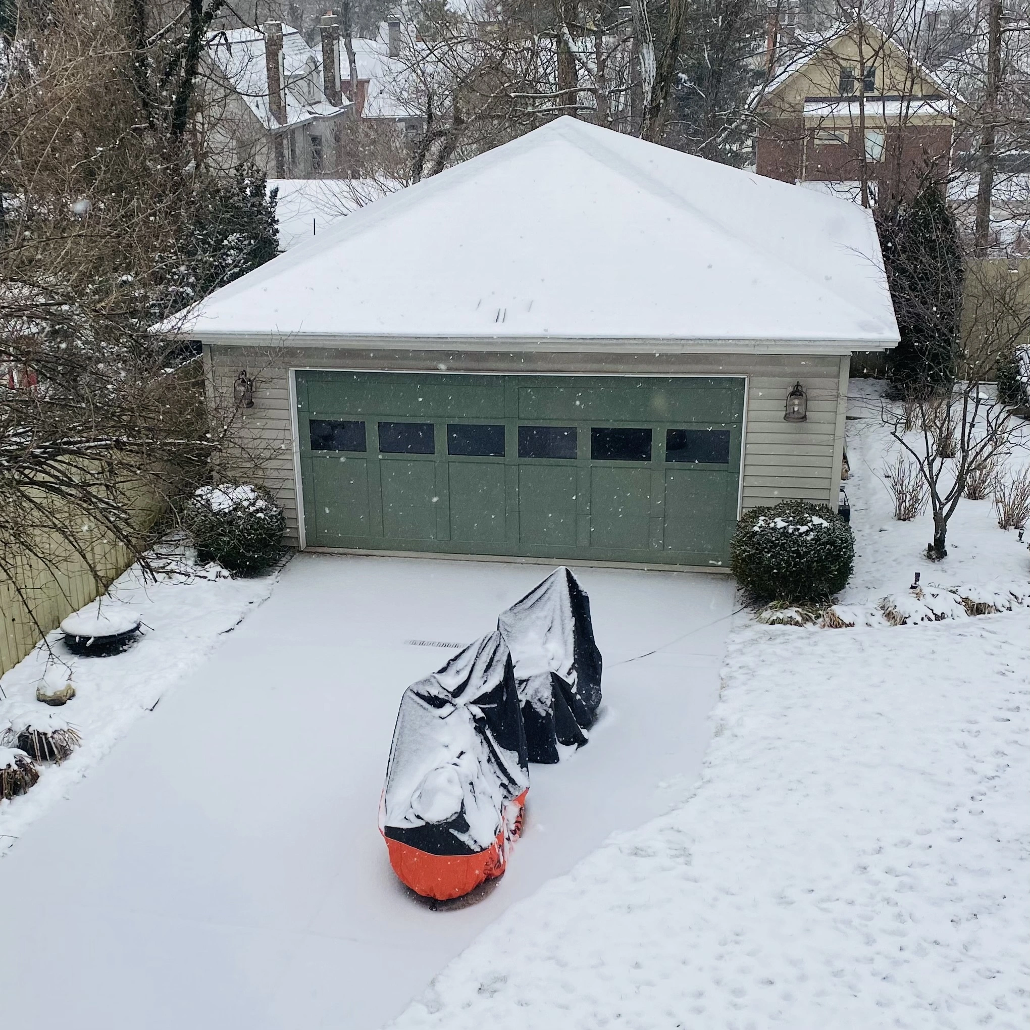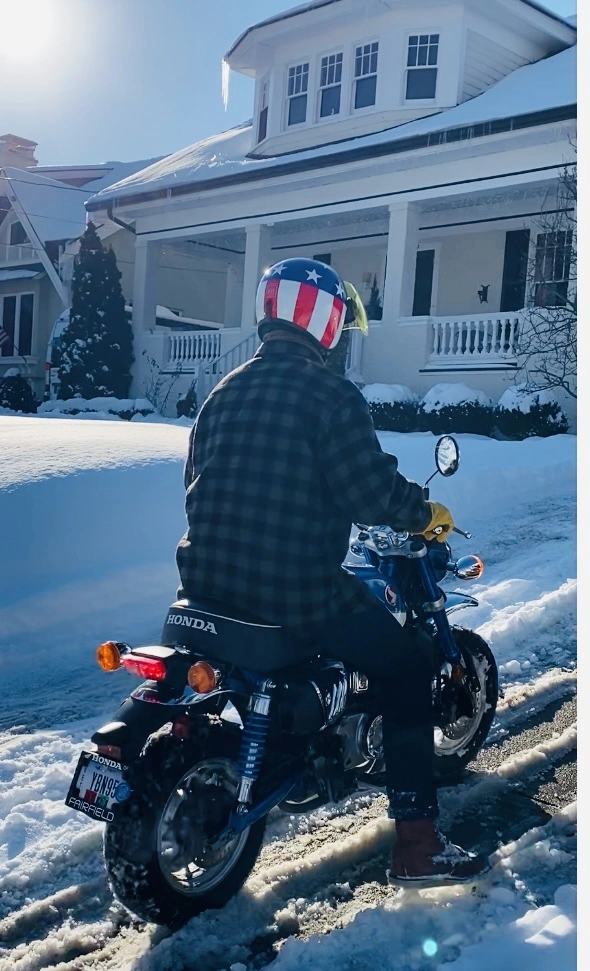 I hear ya…still snowy in Cincinnati, OH…pic below from a few minutes ago. My H-D Street Bob 131 and Honda Monkey got kicked out of the garage due to making room for Mrs. Mad Dog’s motorcycles [she owns four motorcycles…one H-D and three Hondas]…and I’m happy to report that my H-D is protected by an H-D brand all-weather cover and my Honda is protected by a Honda brand all-weather cover…