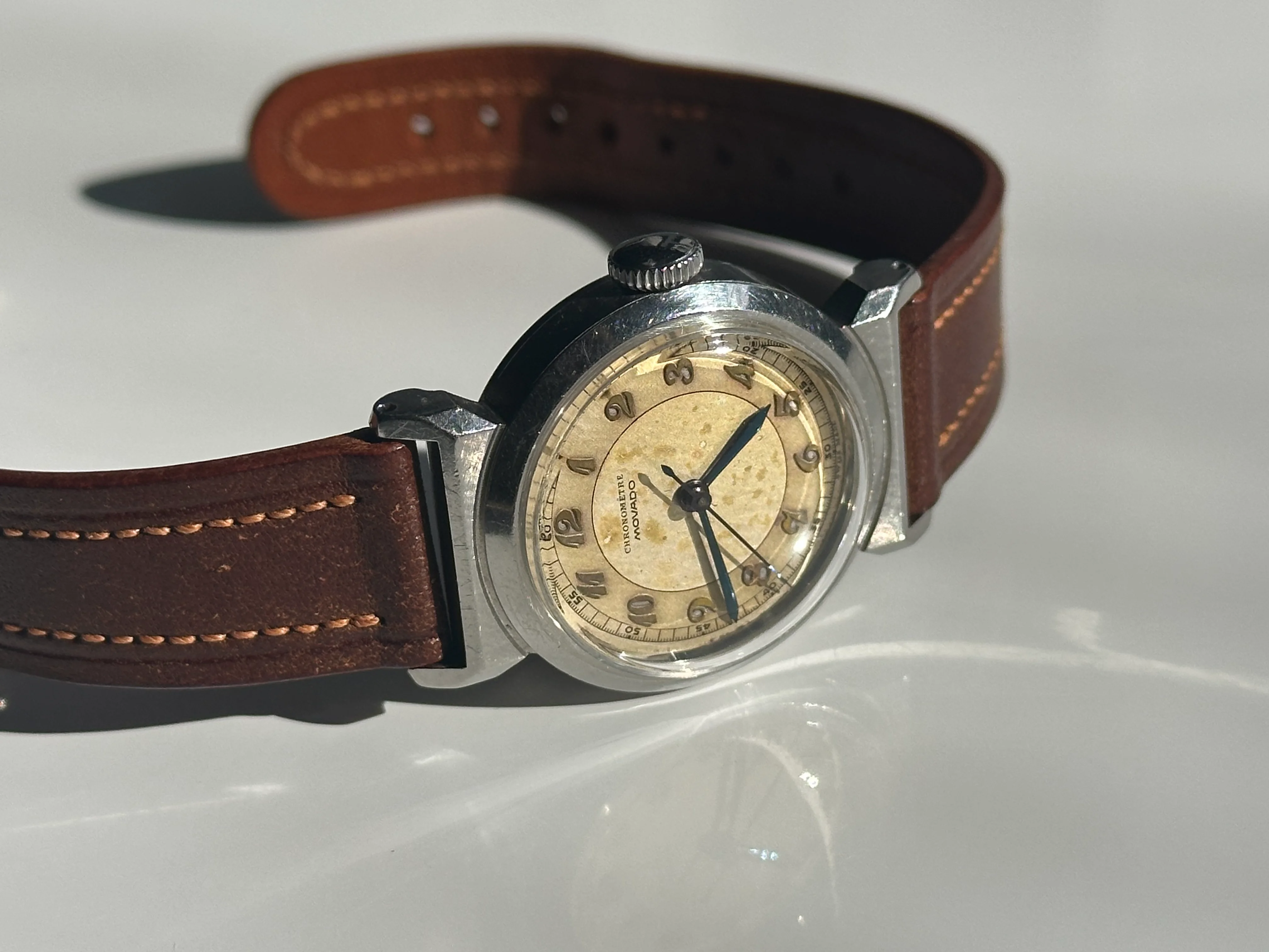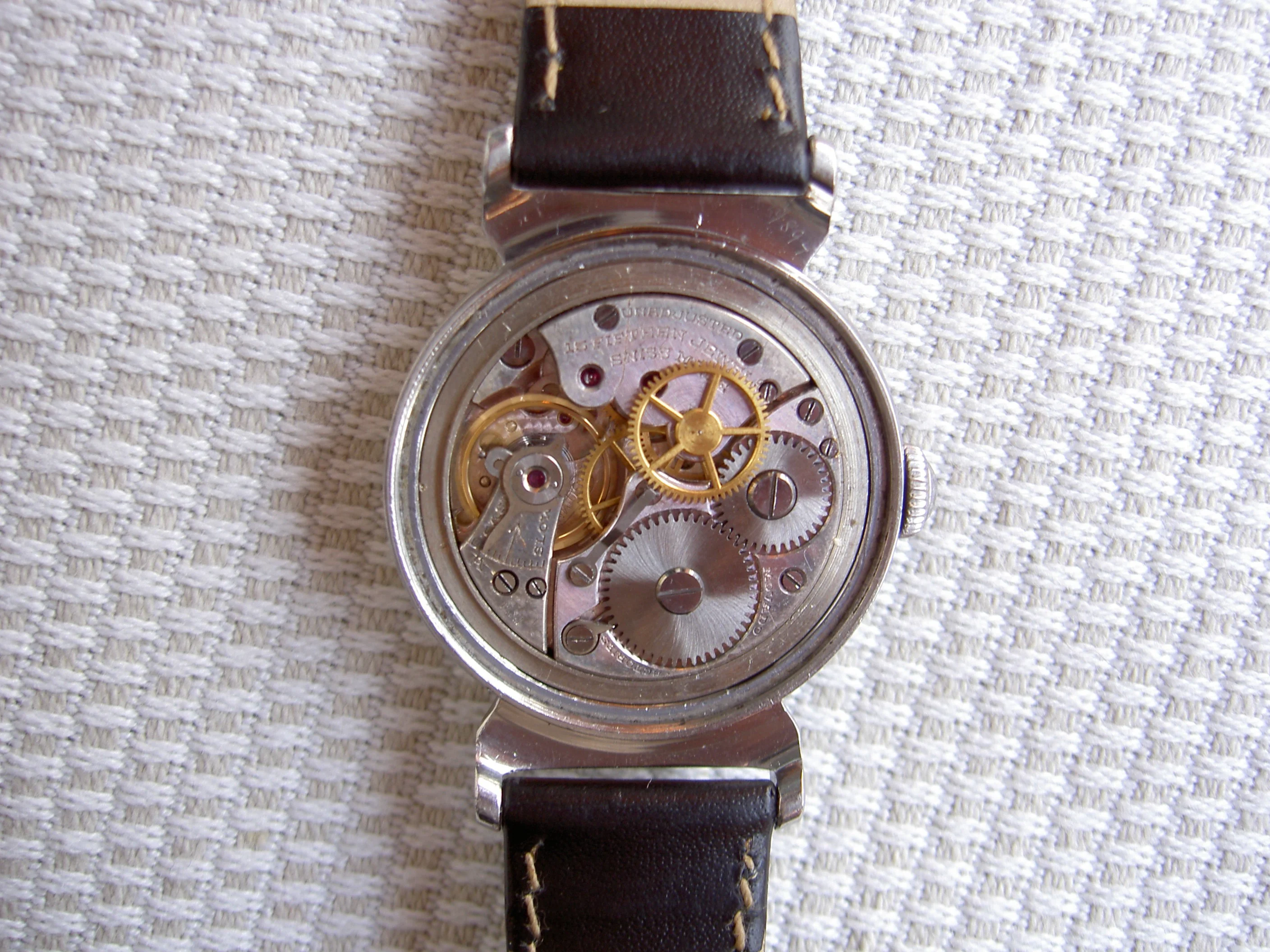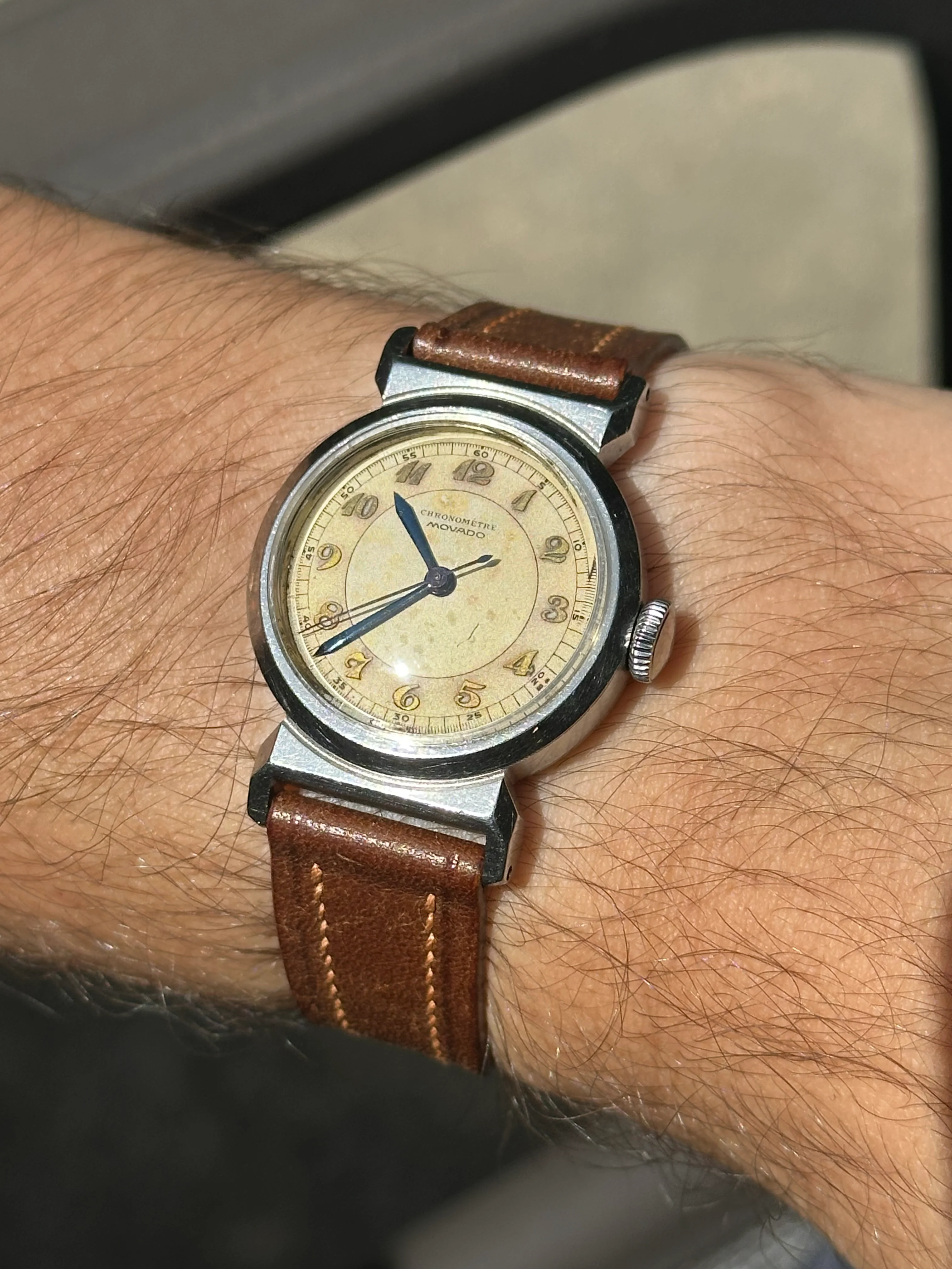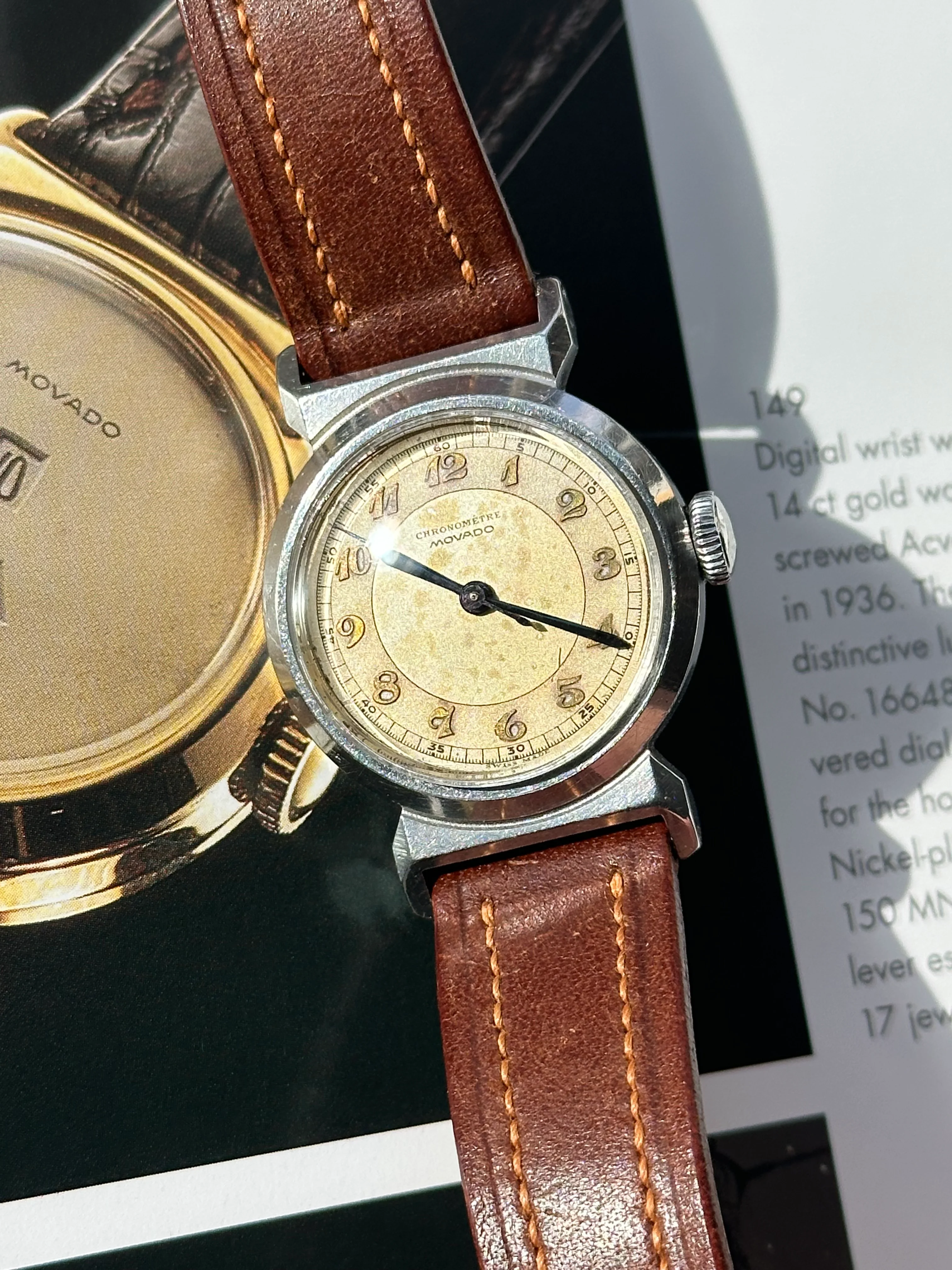 Introduced in 1935, this was Movado's first waterproof watch, you could almost call it their first "sport" watch too. The waterproof cases were made by Taubert & Fils (Borgel) and came in three sizes: 24mm, 28.5mm, and 30mm. My example is 28.5mm, which I believe is the most common size. They utilized a cork gasket to seal the crown and a lead gasket to seal the screw down caseback. I've seen examples in solid gold, gold capped bezel, and steel. I've even seen some examples that deviate from the "scarab' style case completely, utilizing a more standard style of watch case.