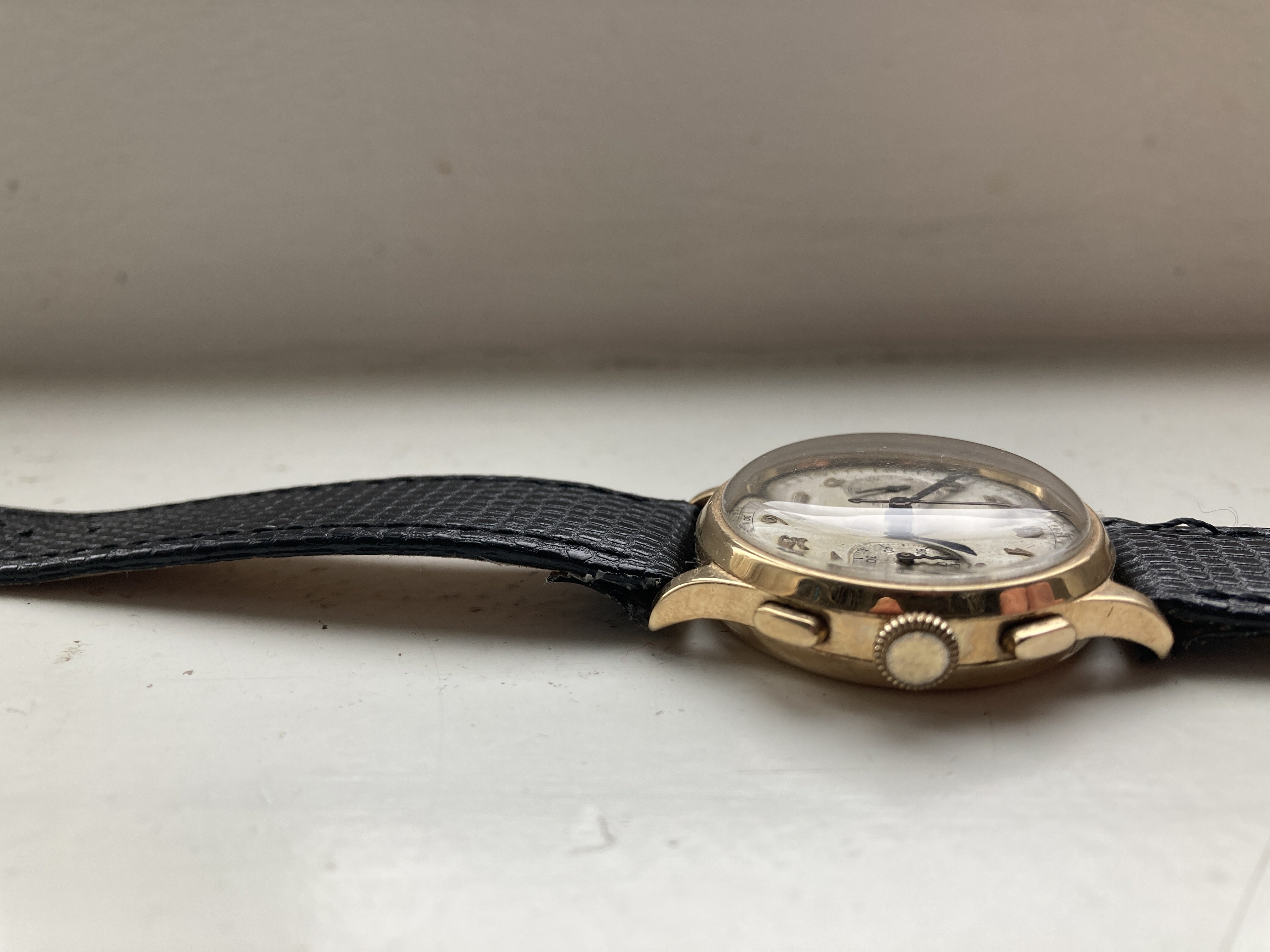 CASE & CASEBACK: 3-piece 9k gold case made for the UK market. Size: 30 mm wide not including crown. There are the usual marks from wear and a few scratches. The lugs are thick. The case back has marks from wear and poor opening. Reference and serial, punched in the inside caseback, are very crisp. Overall good vintage condition.